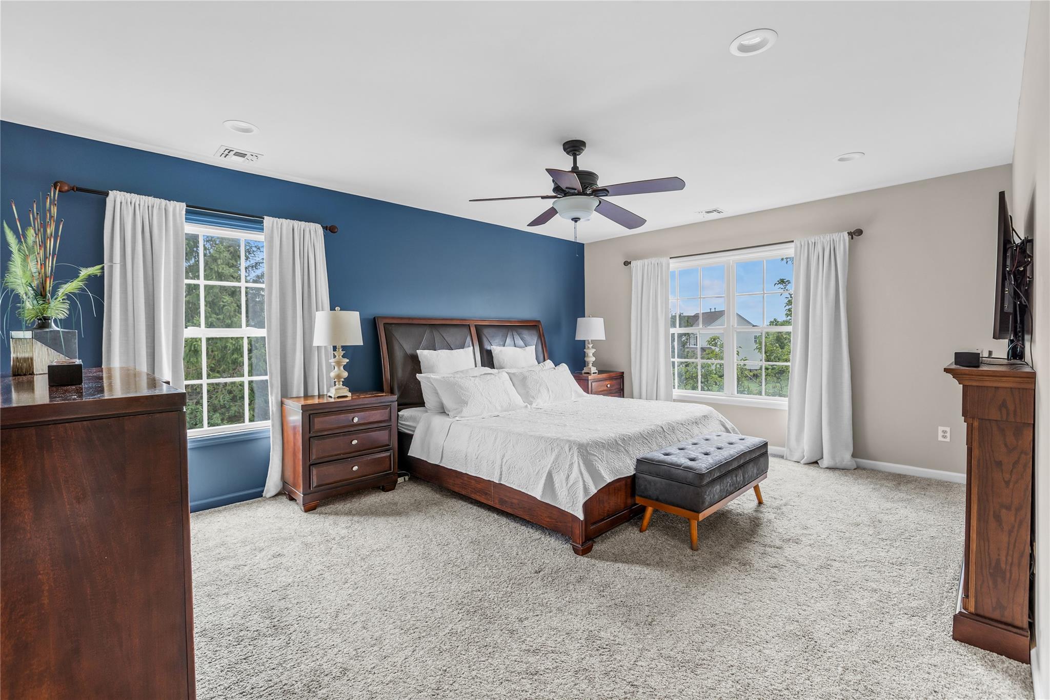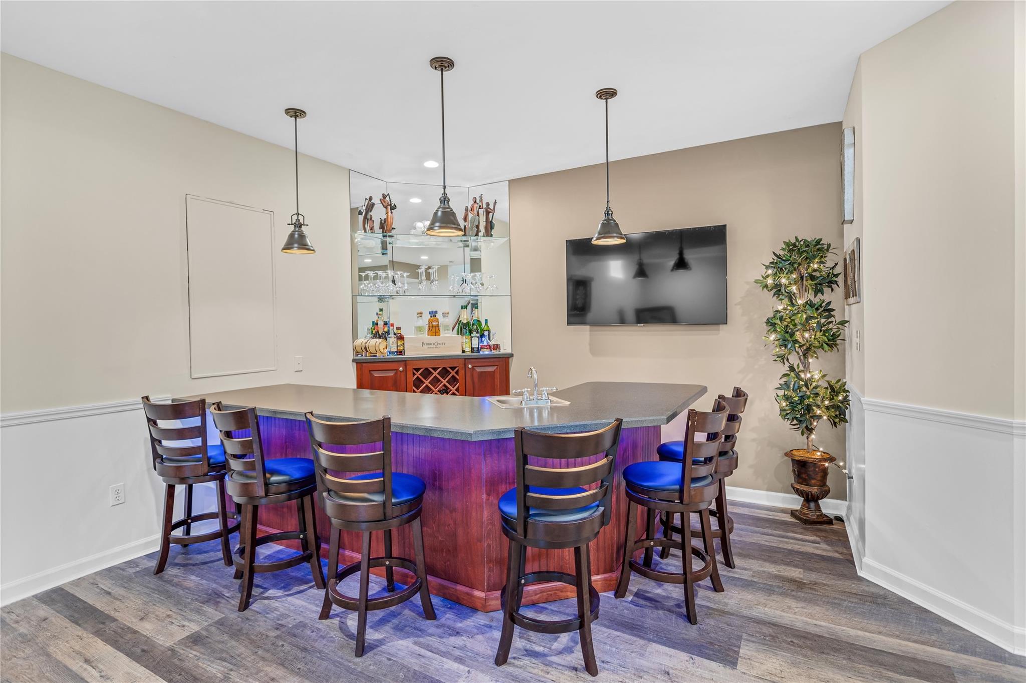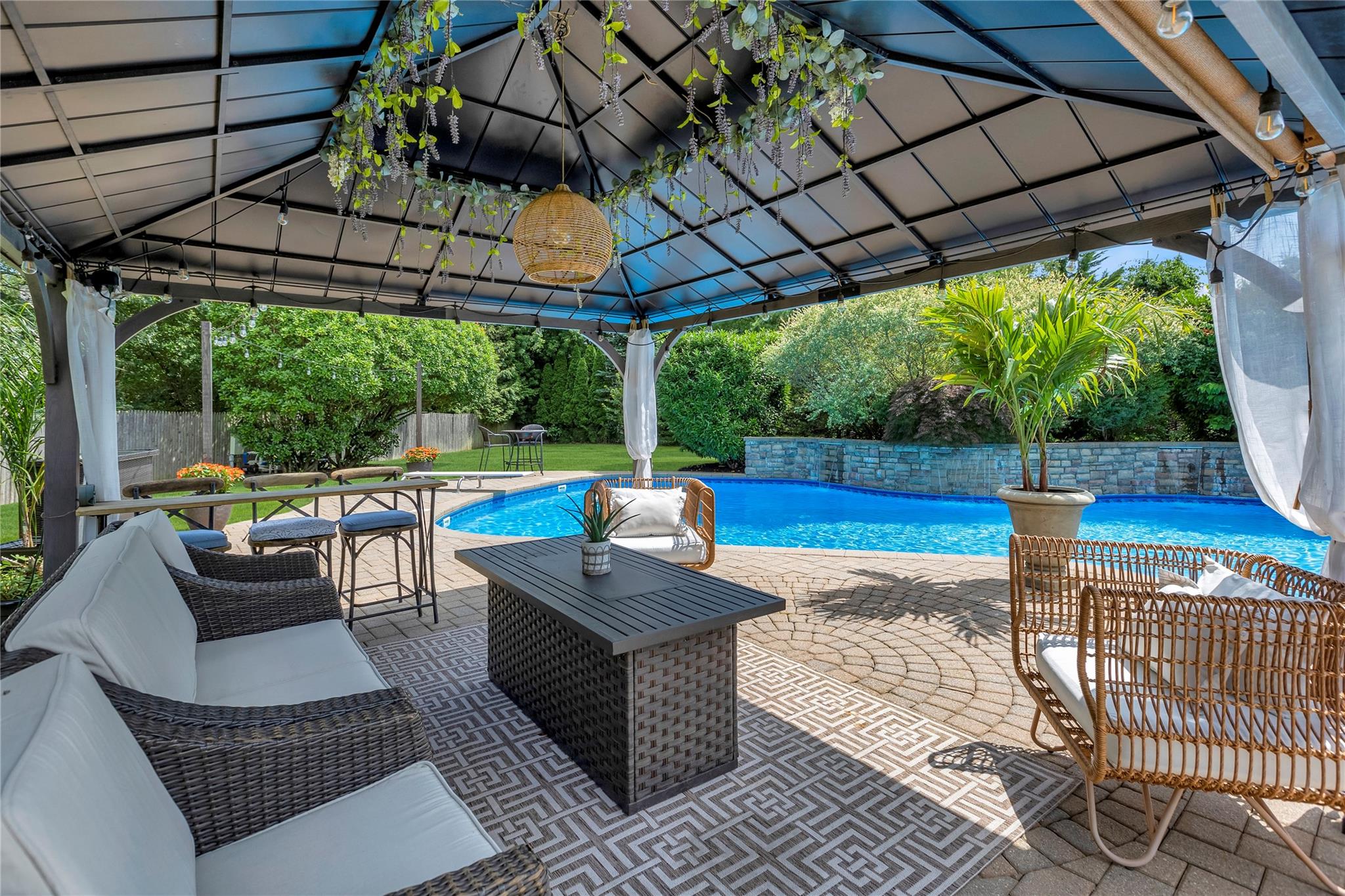 Offered to new residents for the first time, this young post-modern Colonial—constructed in 2003—is set within one of Wading River’s most desirable subdivisions, surrounded by equally beautiful homes. Well maintained and tastefully & thoughtfully updated, it presents a true move-in ready opportunity within Shoreham-Wading River school district. The home welcomes you with an architecturally interesting double height foyer trimmed with custom millwork. Flanking the entry, one will find a first floor study (optional 5th bedroom) to the left, and a formal living room that seamlessly transitions into a formal dining room, to the right. Crown molding, wainscoting, rich hardwood floors, and oversized bay windows enhance these spaces, which are perfectly suited for hosting gatherings. At the heart of the home, the chef’s kitchen features solid maple cabinetry, granite countertops, updated stainless steel appliances - including a gas range - and a functional layout ideal for everyday living and entertaining alike. The adjacent family room offers lofty 20 foot ceilings, four oversized windows, and a focal-point gas fireplace, as well as a Juliet balcony set above. Upstairs, a double-door entry leads to a generously proportioned primary suite complete with a spacious walk-in dressing room, and an ensuite offering dual vanities, a soaking tub with views over the backyard, and a separate water closet. Three additional bedrooms, one with a walk-in closet, along with a full hall bath and convenient second-floor laundry, round out the upper level. The finished lower level is simply awesome, offering 10-foot ceilings and a lounge-inspired design. Highlights include a wet bar with seating for six comfortably, multiple beverage refrigerators, a built-in wine rack, a dedicated billiards area, and a high-end theater room for immersive movie nights (details upon request). Outdoors, over 0. 8 acres of level, manicured grounds stand as an extension of your interior living space. An extensive herringbone paver patio offers three distinct entertaining areas, including a gazebo-covered poolside lounge. The custom oversized L-shaped pool features three sheer descent waterfalls and is surrounded by lush landscaping. A lighted sports court and expansive lawn offer additional space for recreation. Other noteworthy points include a two car side entry garage, natural gas heating, and a brand new hot water heater. Located within the acclaimed Shoreham-Wading River School District and part of the Township of Riverhead, this property stands in close proximity to north shore beaches on the Long Island Sound, Wading River’s Wildwood State Park, and Long Island’s North Fork…think vineyards, beaches, farms, and coastal towns that define the best of the East End lifestyle.