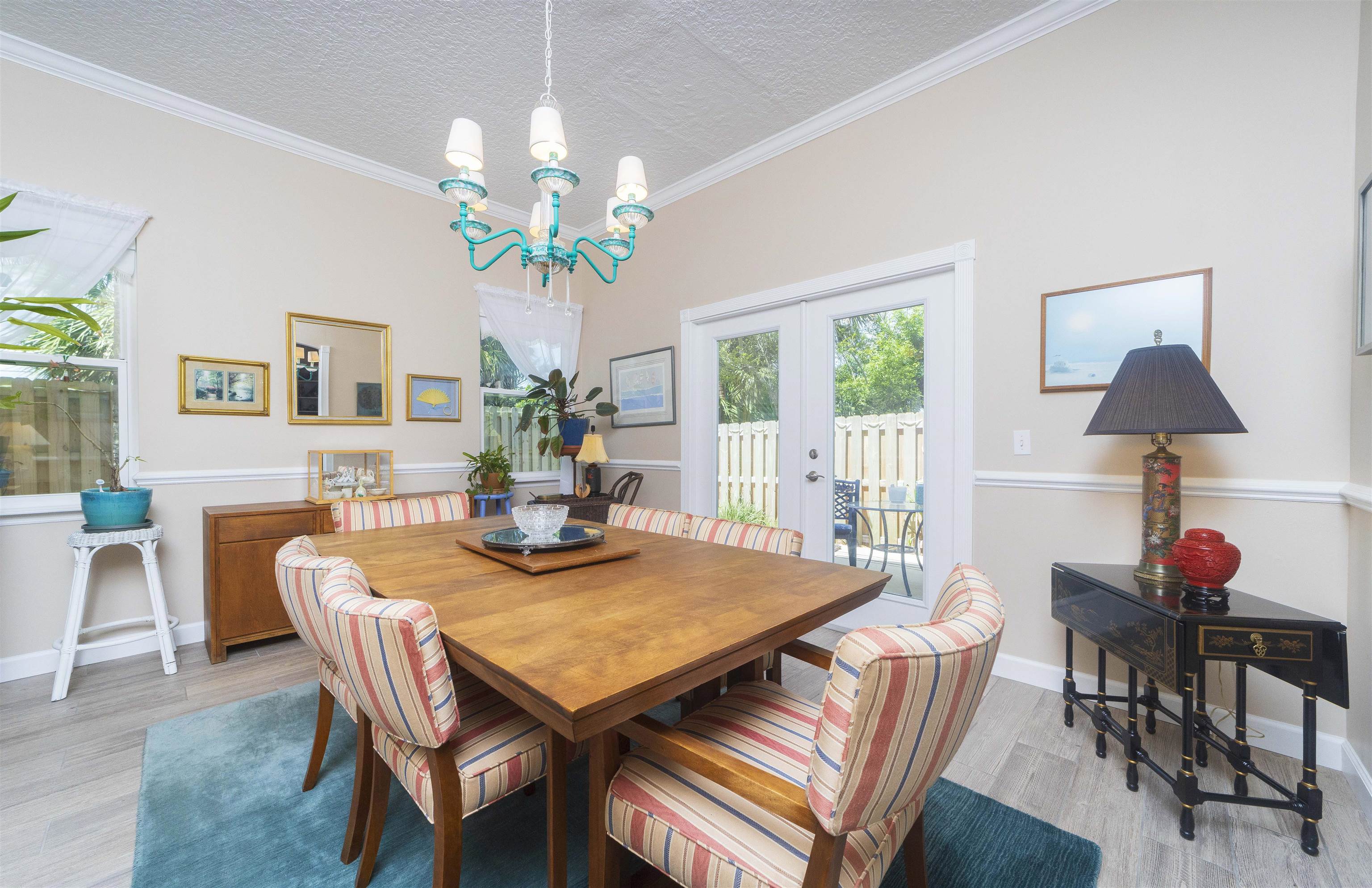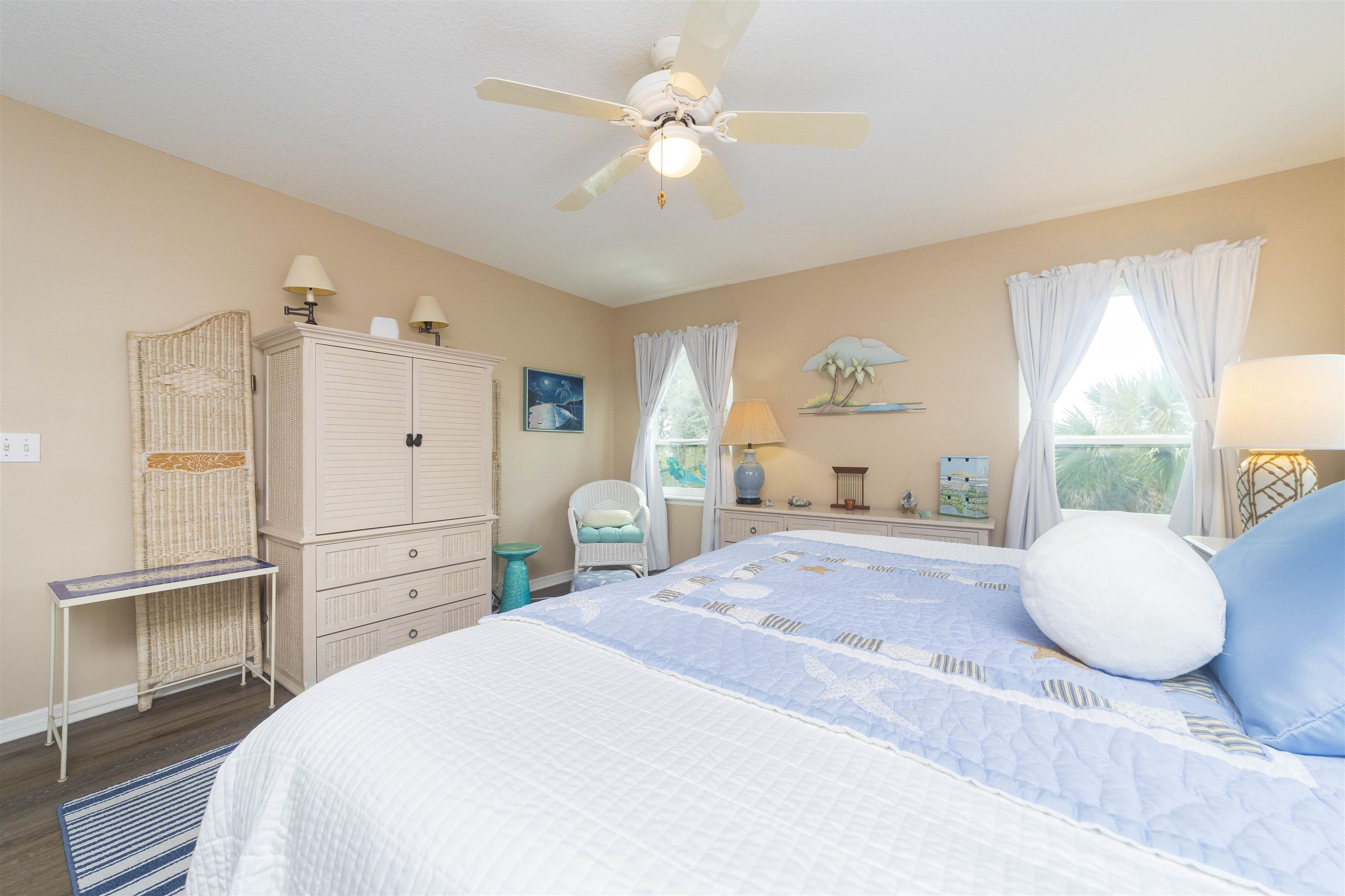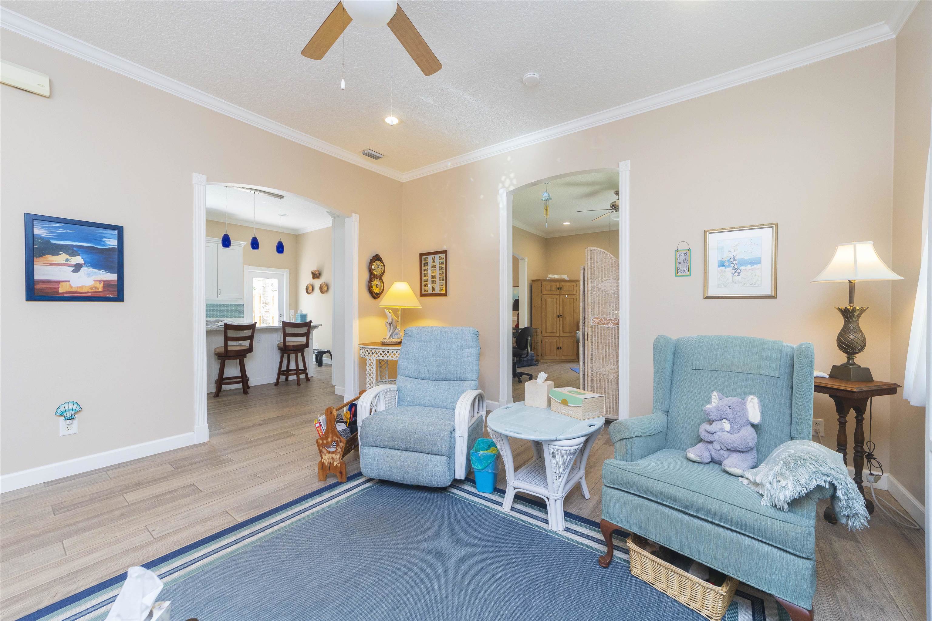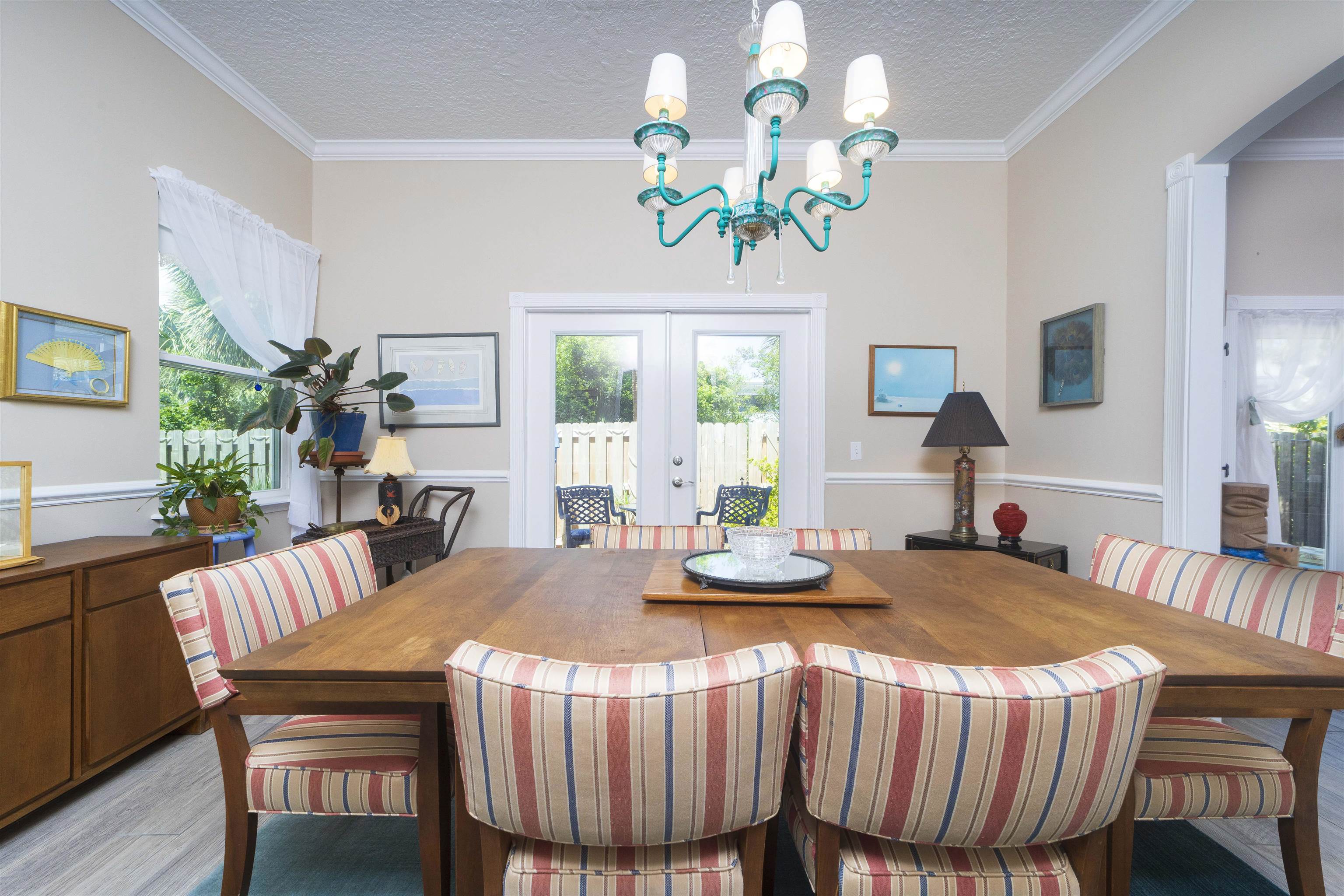 Positioned on the beach side of A1A, between Butler and Crescent Beach, this home is part of a cozy, established neighborhood and is just a one-minute walk from the private community boardwalk to the beach. The property, which has been lovingly maintained, is flooded with natural light and offers a spacious, semi-open floor plan. This layout is perfect for accommodating family and friends, allowing them to flow seamlessly between the living room, dining room, and large kitchen. The front porch is a charming spot for small gatherings, and the L-shaped patio and fenced backyard provide additional space for entertaining. A new roof installed in July 2025 with transferable warranty! System plus GAF Registered Warranty, 10 Year Labor Warranty and Lifetime product Warranty. The home features 10-foot ceilings downstairs with crown molding that continues to the upstairs landing, where you’ll find the south-facing deck and three generously sized bedrooms. Have coffee on the deck, enjoy the sunrise, or sip a libation and take in the stars. This home is convenient to shopping and dining, parks, the Amphitheatre, and our historic downtown. Relax and embrace a beachy lifestyle! Seller is offering a $10, 000 credit to the buyer at closing!