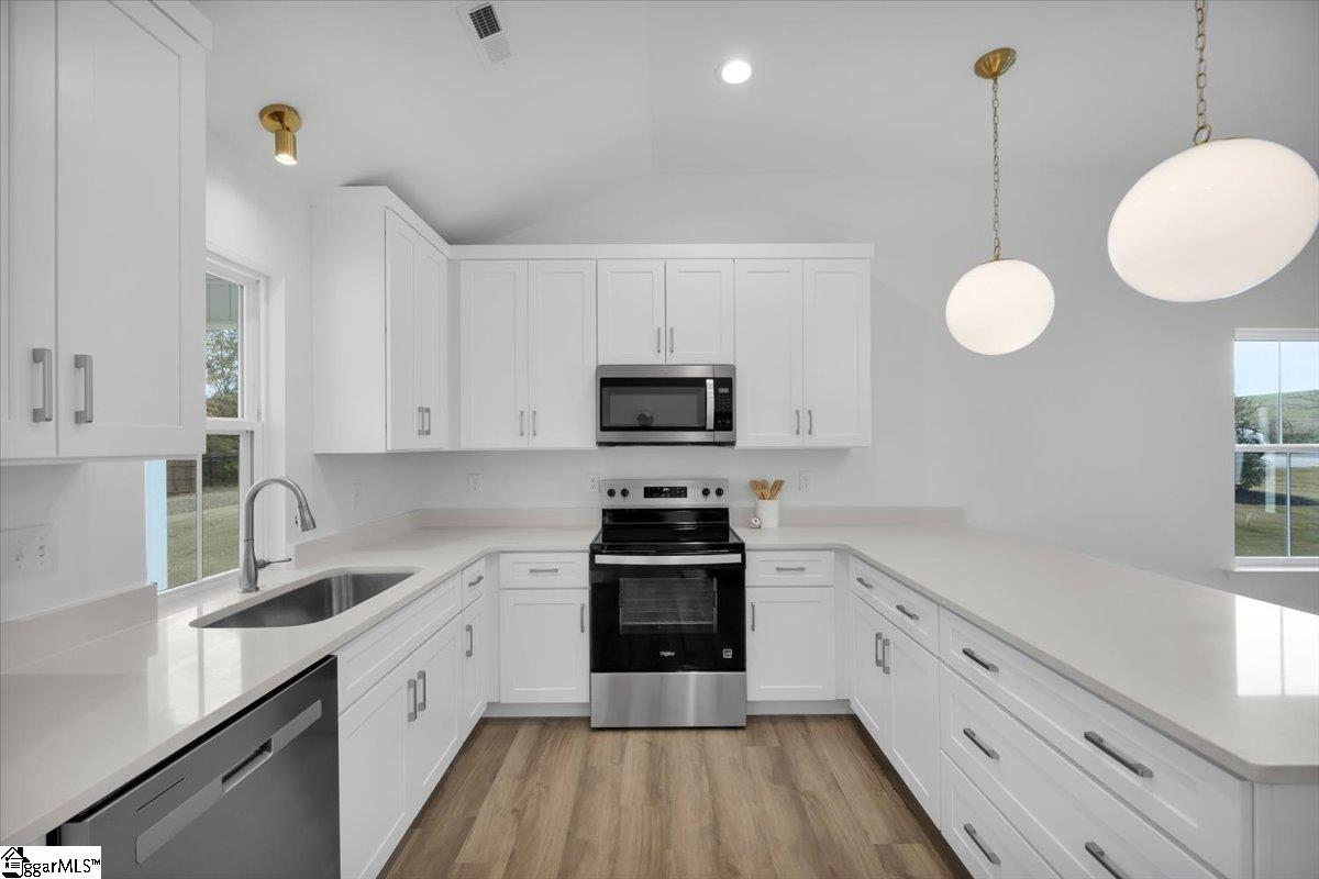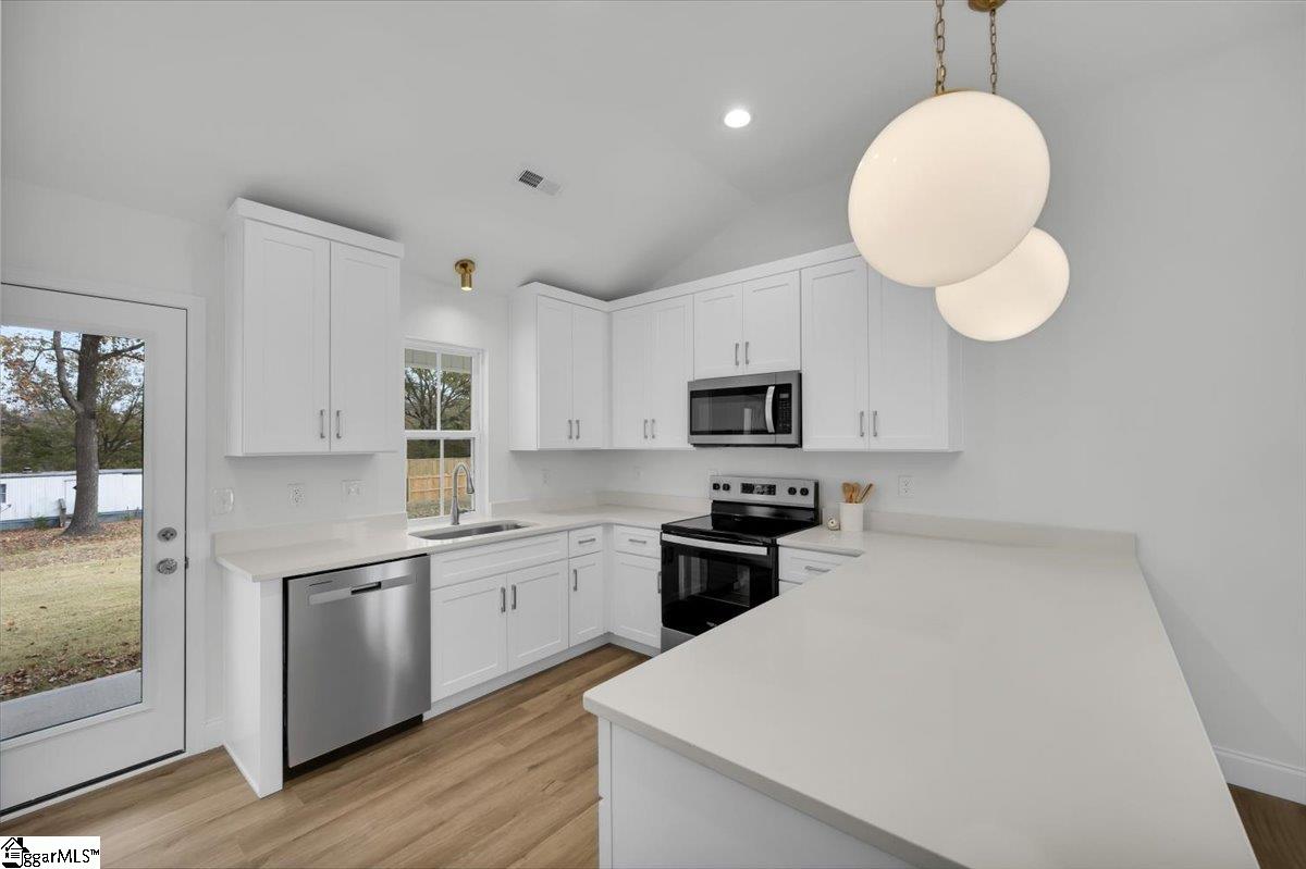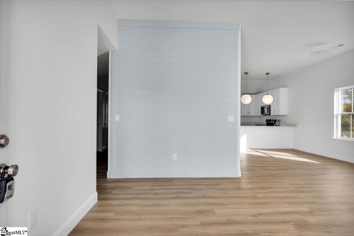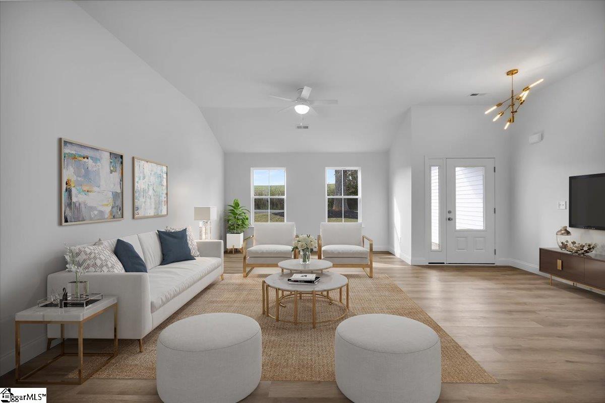 Welcome to your brand new home! A brand new home in an established area with easy access to Landrum, Tryon, and I-26 make it yours! This home features brass lighting and a lovely soft blue front door. A sodded yard and mulch bed are all ready for you to enjoy. Inside you have a soft blue accent wall perfect for a drop zone or artwork. The living room features a ceiling fan and is open to the dining room and kitchen. The kitchen has white cabinets, quartz countertops, and stainless steel appliances. An upgraded LVP is durable and beautiful and it runs through the entire home. Down the hall there is a walk in laundry room and laundry sink. The guest bathroom has a tub/shower and white vanity with quartz countertops. There are two guest bedrooms. The primary suite has a tray ceiling and large window as well as an ensuite bathroom. The ensuite has dual vanities with white cabinets and quartz counters, a walk in shower with a tile surround, and a separate toilet room. There is also a walk in closet. This home also has a 2 car garage. The location is convenient to Campobello and minutes from downtown Landrum. Make it yours today.