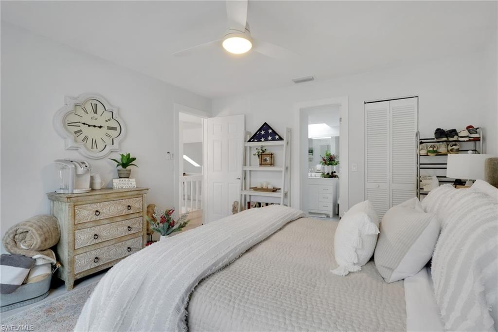 The primary bedroom is conveniently located on the ground floor, featuring a custom walk-in closet and an ensuite bathroom. Sliding glass impact doors open directly from the primary bedroom to your private, large screened lanai and a fenced backyard, creating a serene outdoor oasis. A half bathroom on the first floor adds to the convenience.