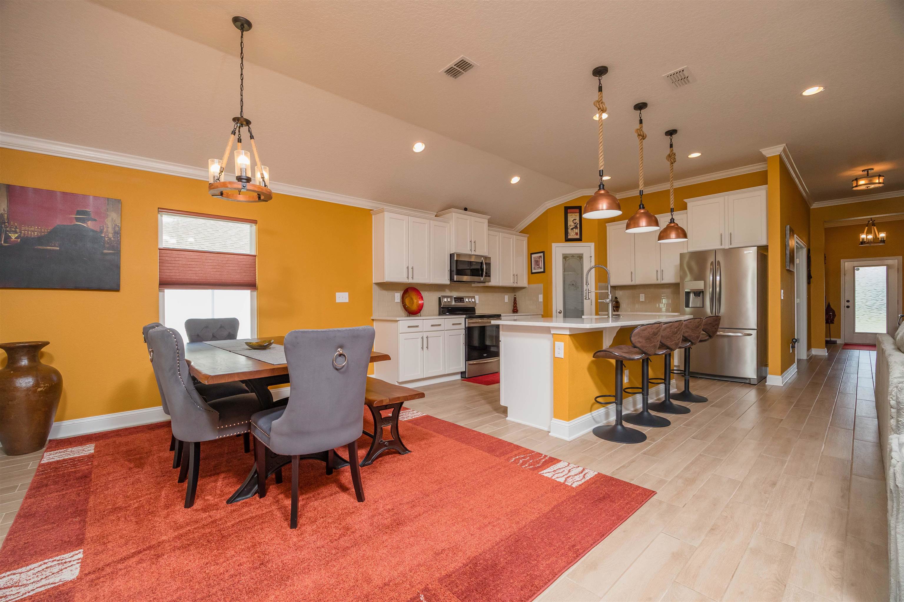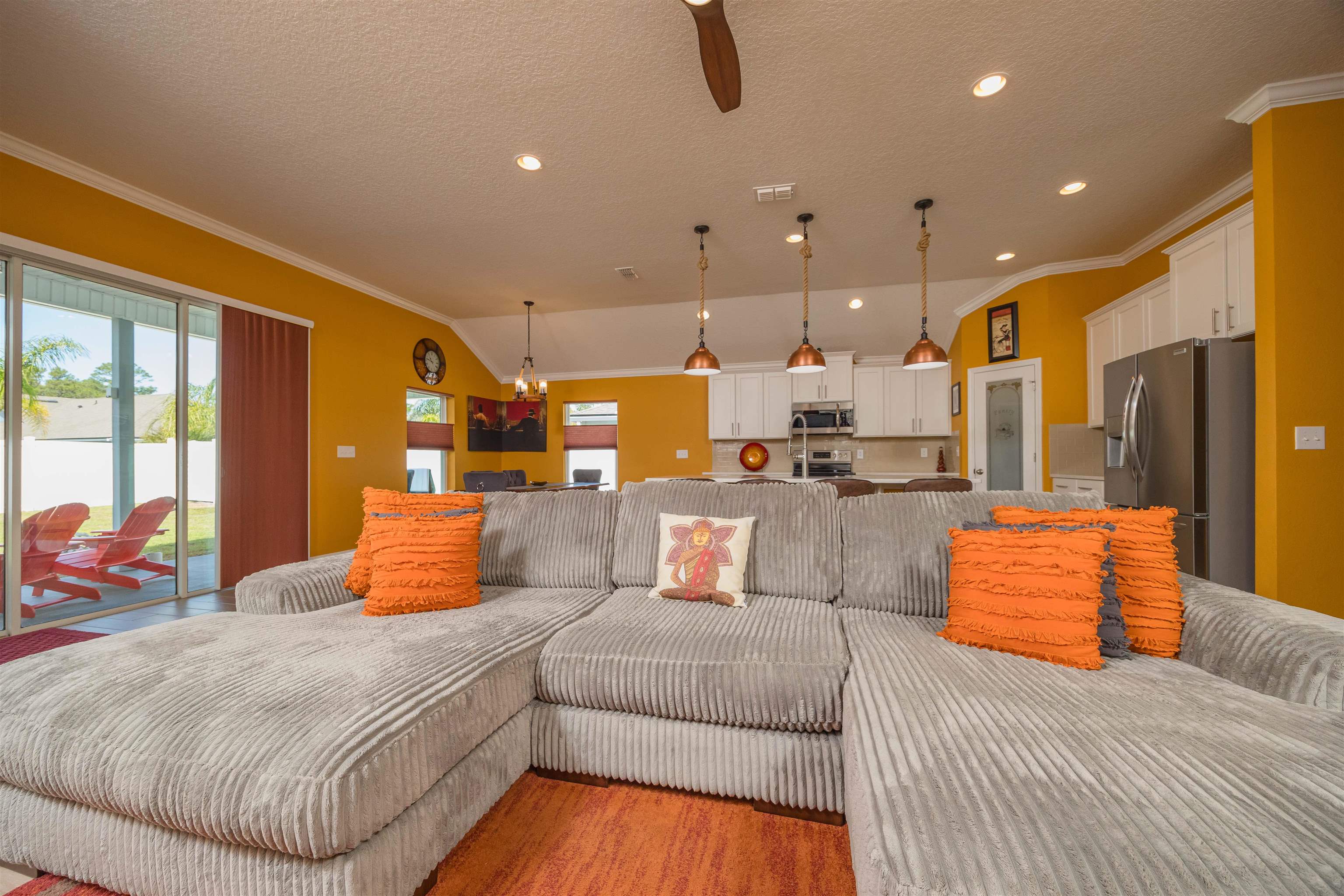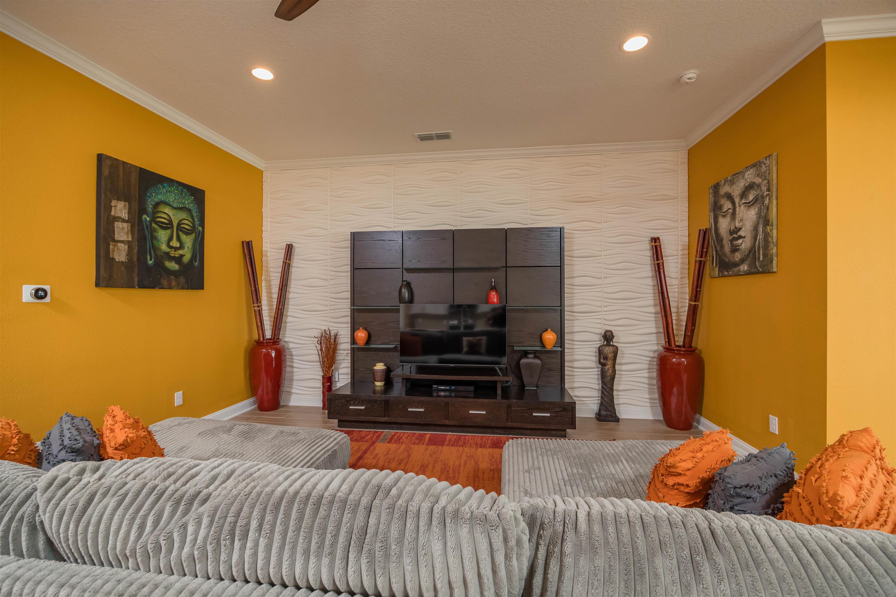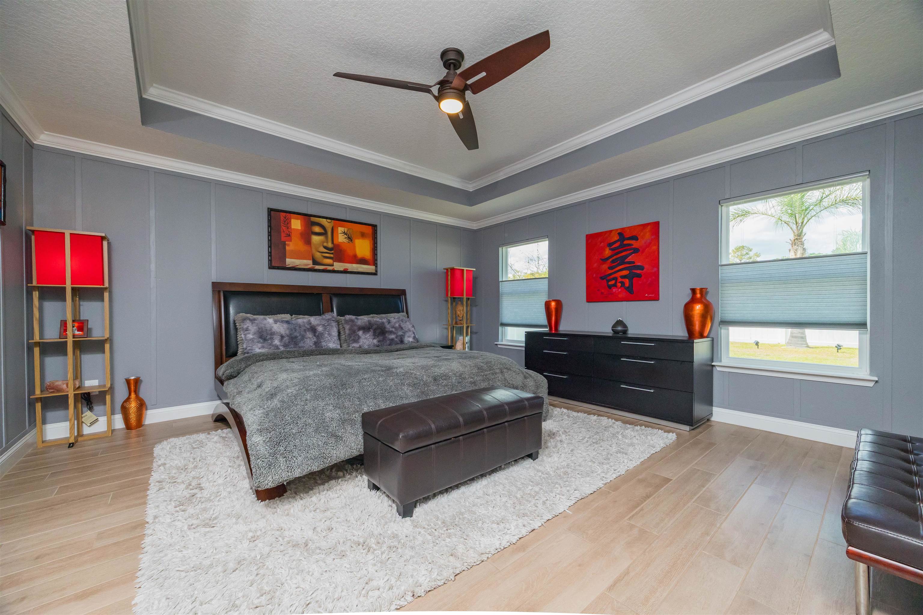 Coastal Contemporary Ranch Home 5 minutes from Crescent Beach in the gated community of Lakewood Pointe! Welcome to this stunning split plan home located just 2. 5 miles from the pristine beaches of St. Augustine. This home boasts 3 spacious bedrooms, 3 full baths, and a bonus room, all designed for ultimate comfort and luxury. Interior Features • Upgraded Baths, Window Treatments, Fans, and Fixtures: Each bathroom has been meticulously upgraded, complimented by modern fixtures and fans throughout the home. • Plank Tiles Throughout: Elegant plank tiles cover the entire floor, providing a seamless and stylish look. • Ceilings and Crown Molding: Enjoy the grandeur of 11 ft. ceilings adorned with sophisticated crown molding. • Bonus Room: The bonus room features beautiful French Doors, offering versatile use for an office, guest room, or studio. • Kitchen Highlights: The gourmet kitchen is equipped with stainless steel appliances, a large kitchen island, glass subway tiled backsplash, a sizable pantry, and quartz countertops. The apron front double bowl stainless steel kitchen sink with a commercial-grade faucet and push button garbage disposal adds a touch of practicality and luxury. • Open Living Spaces: The open family/dining/great room showcases a striking 3-D accent wall, perfect for hosting gatherings and enjoying family time. • Primary Bedroom Suite: The oversized primary bedroom features a tray ceiling and picture frame accented walls. The ensuite bathroom includes a double vanity, frameless glass shower, two walk-in closets, and two additional closets. • Secondary Bedroom and Bath: One secondary bedroom and bath are thoughtfully separated from the main living area by a sliding barn door, providing privacy and tranquility. • Laundry Room: The laundry room is equipped with a newer digital washer and dryer, industrial-style storage cabinets, making laundry a breeze. • Outdoor Living: Step outside through the 3 glass sliders on the rear of the home to a large, covered patio and a sizable, enclosed backyard, ready for a pool or outdoor oasis.