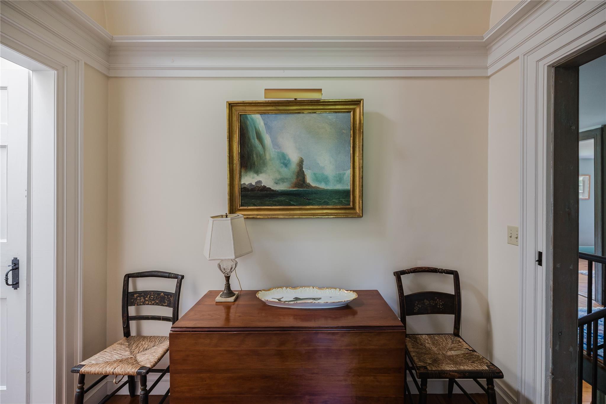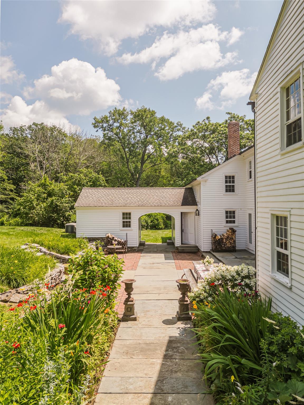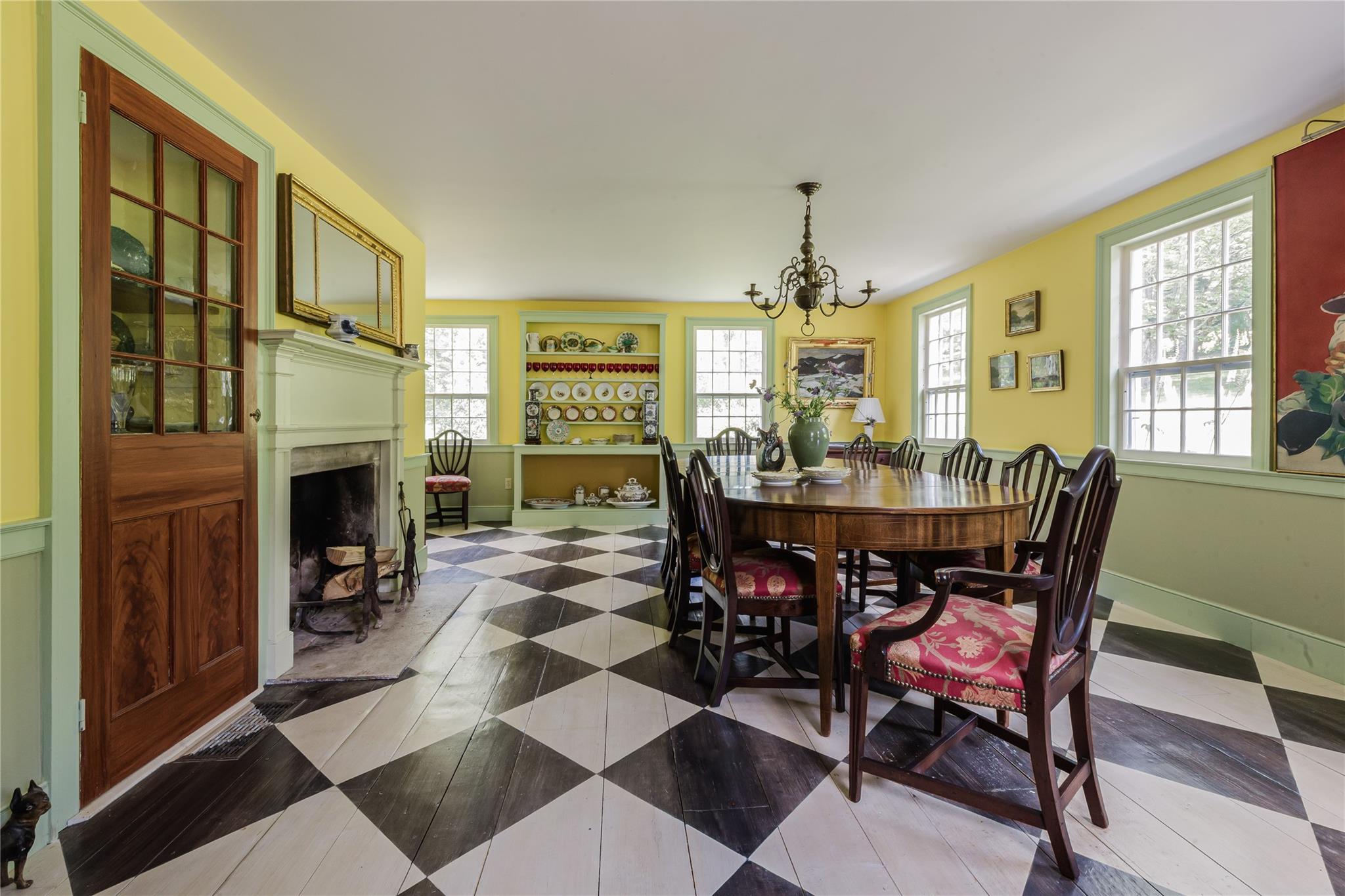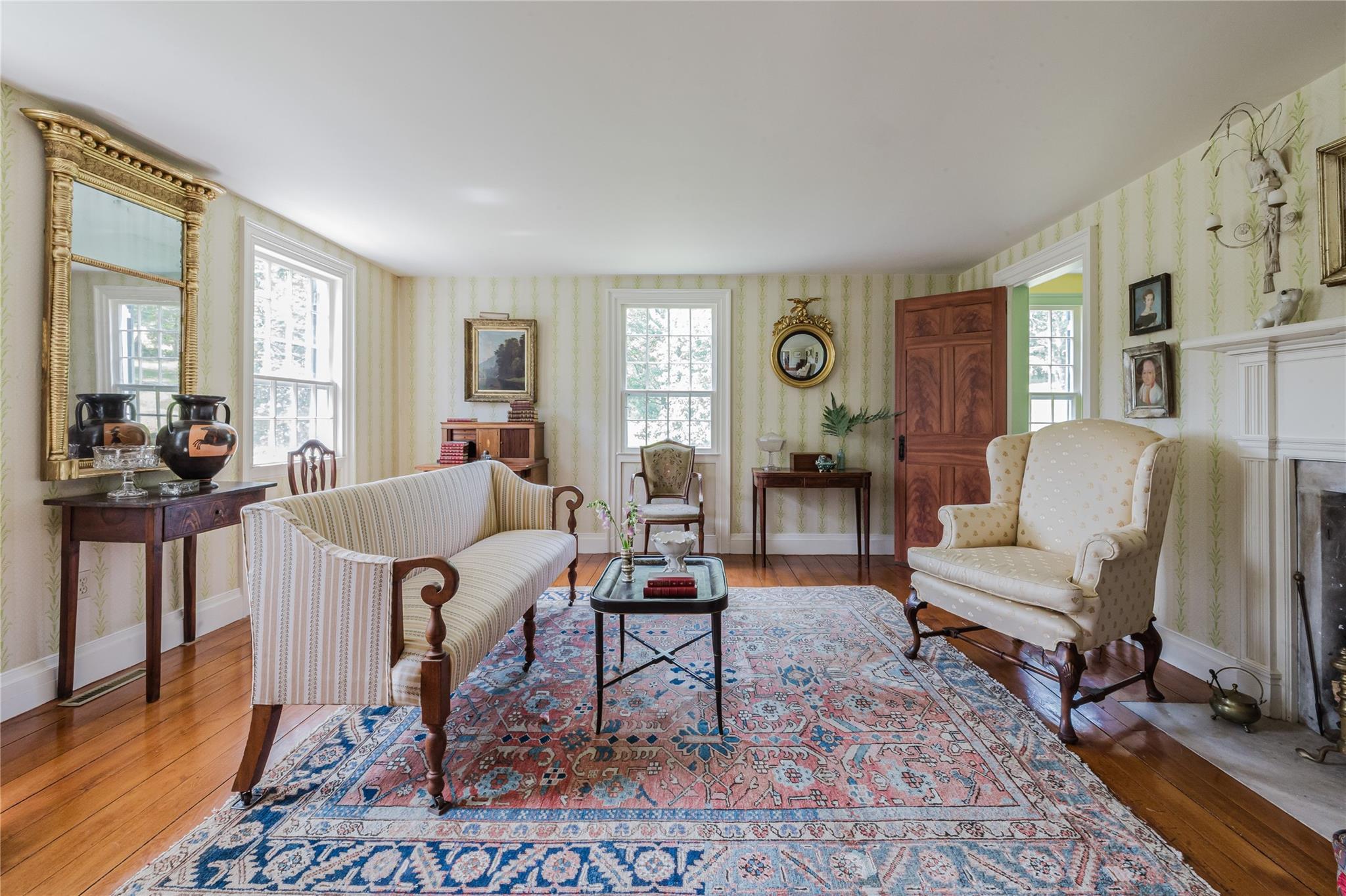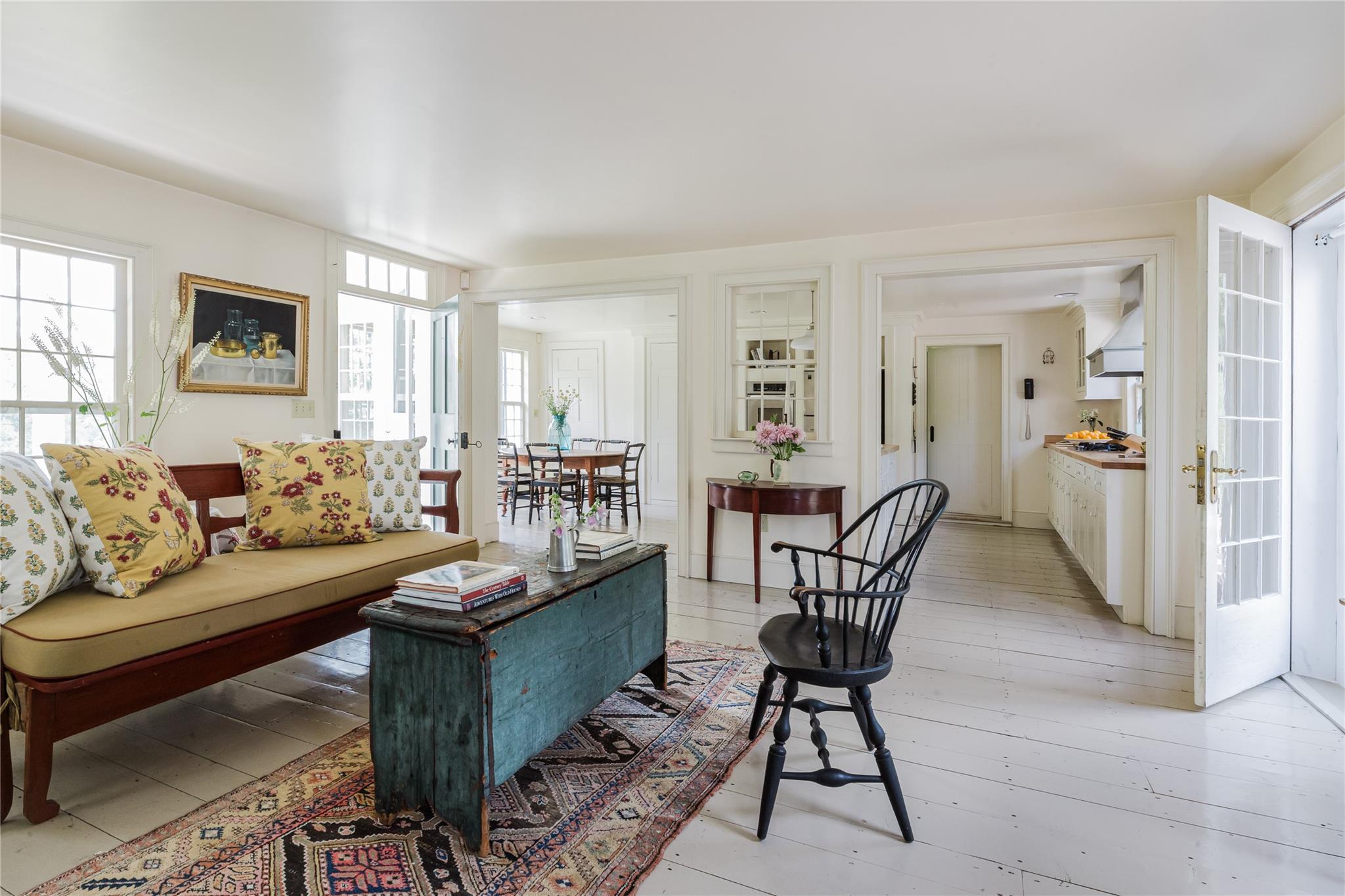 Introducing Mossford Estate, a historic country residence that comes along once in a generation. On the market for the first time in 40 years, this circa 1800 property is a superb example of Federal-style architecture. Set on 144 acres, the sprawling estate includes an antique barn, swimming pond, tennis court, five fireplaces, a stone patio, and a wealth of period details. The oldest part of the house is a classic side-hall Colonial, featuring nine-over-nine windows with wavy glass. Inside, a formal living room and dining area with built-in china displays and hand-painted floors offer space for 14 guests, while a sunny, south-facing breakfast nook adjoins the modern kitchen. The centerpiece of the main level is a soaring, double-height den—likely a former barn conversion—that evokes the feel of a Ralph Lauren-style Adirondack lodge, rustic yet refined. A cozy sitting room with a fireplace adjoins a full bath and laundry area, adding comfort and function to the home's main floor. Upstairs, the primary suite includes a fireplace and full bath, while a wide hallway with a darling reading nook leads to three large bedrooms and a third full bath. Every room reflects the owners' meticulous care in preserving and replicating 19th-century details, from antique fixtures and thoughtfully chosen wallcoverings to original faux bois painted doors. Behind the house, a brick and stone patio is bordered by mature perennial gardens, creating a peaceful spot for outdoor dining and entertaining. A gently sloping lawn leads to a fenced tennis court, and a vegetable garden and potting shed make homegrown meals a part of everyday life. Across the quiet gravel road, a 30x40 antique barn with a new standing seam metal roof sits on a stone foundation, with a private swimming pond just beyond, glimpsed through the trees. In every direction, Mossford Estate captures the essence of refined country living at its very best.