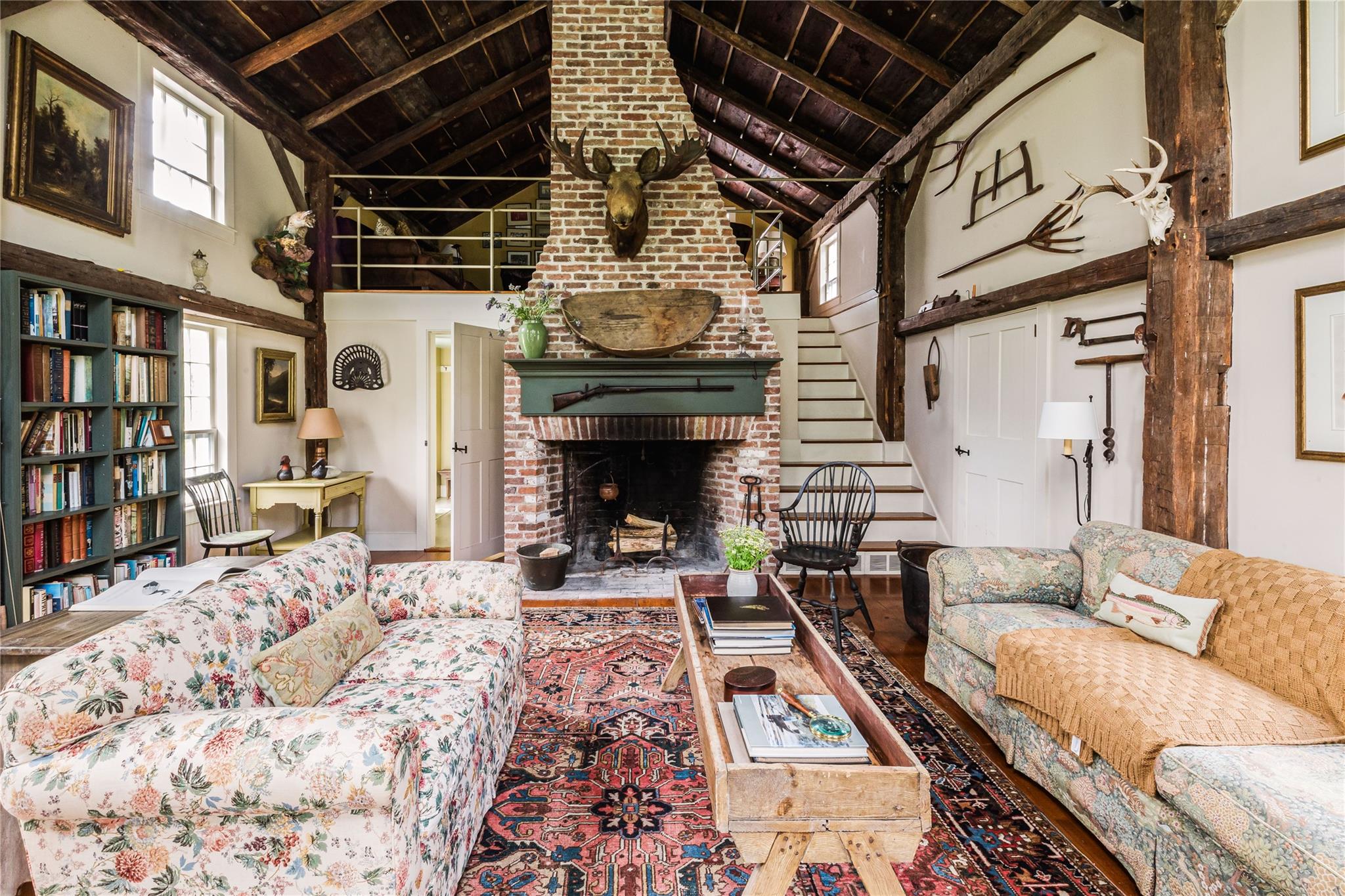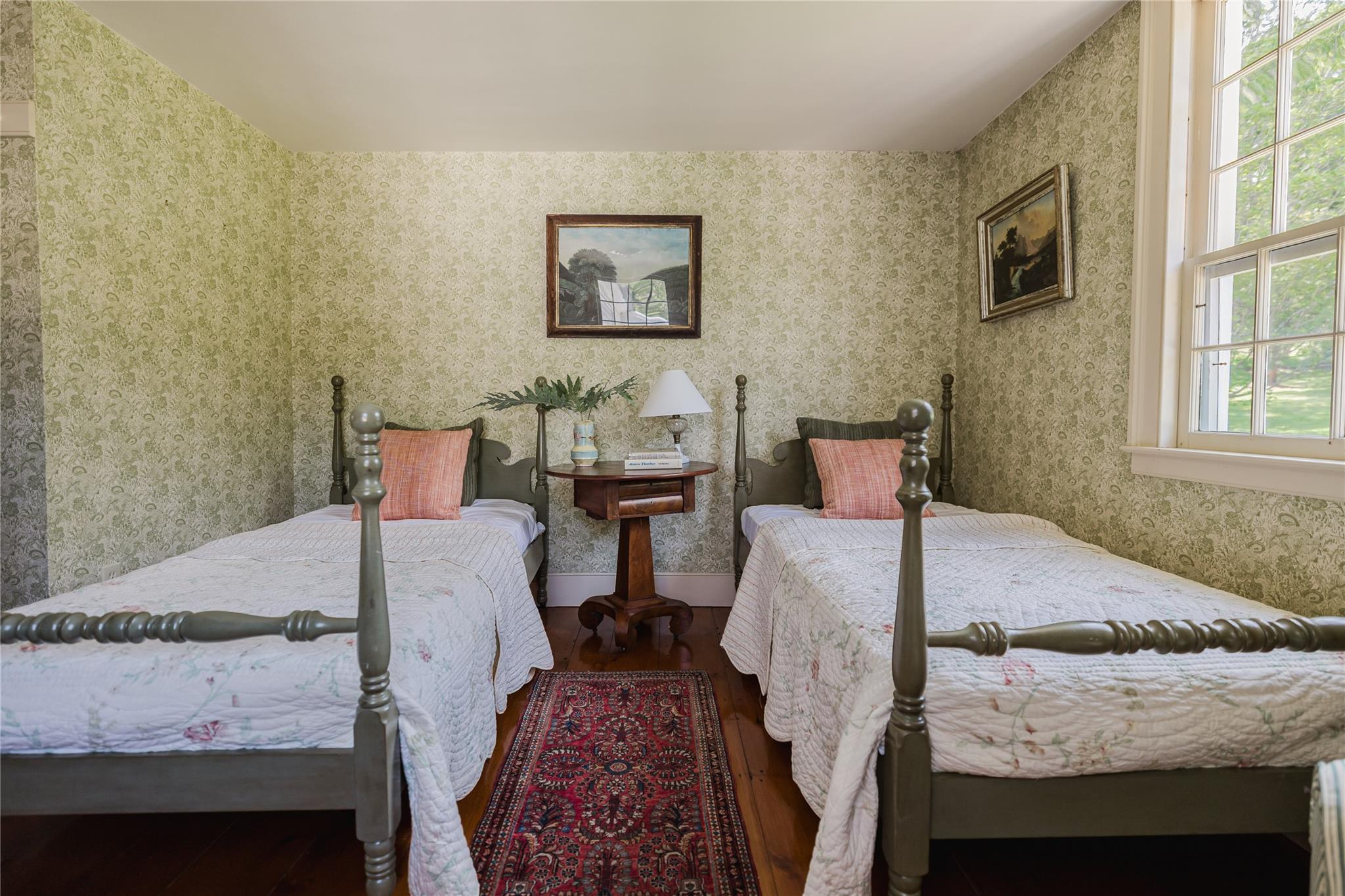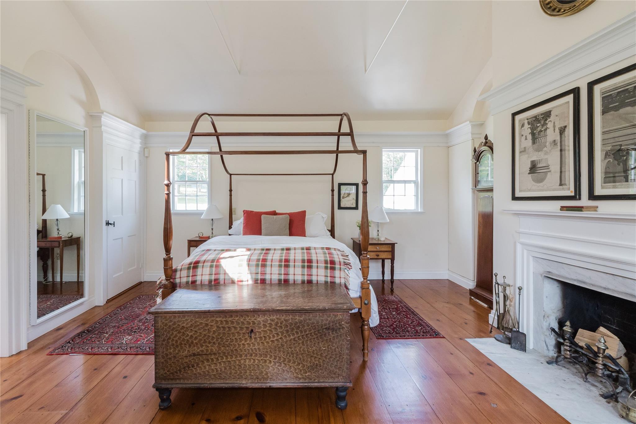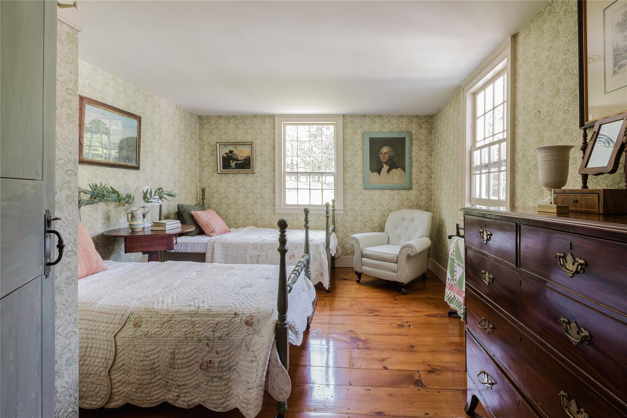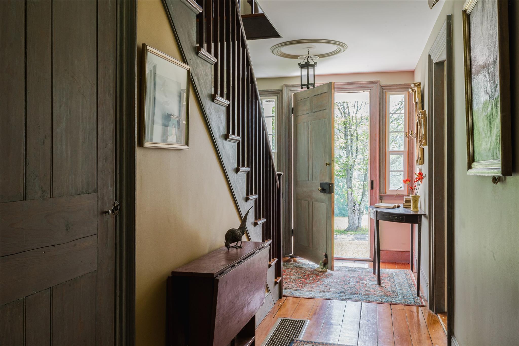 Introducing Mossford Estate, a historic country residence that comes along once in a generation. On the market for the first time in 40 years, this circa 1800 property is a superb example of Federal-style architecture. Set on 144 acres, the sprawling estate includes an antique barn, swimming pond, tennis court, five fireplaces, a stone patio, and a wealth of period details. The oldest part of the house is a classic side-hall Colonial, featuring nine-over-nine windows with wavy glass. Inside, a formal living room and dining area with built-in china displays and hand-painted floors offer space for 14 guests, while a sunny, south-facing breakfast nook adjoins the modern kitchen. The centerpiece of the main level is a soaring, double-height den—likely a former barn conversion—that evokes the feel of a Ralph Lauren-style Adirondack lodge, rustic yet refined. A cozy sitting room with a fireplace adjoins a full bath and laundry area, adding comfort and function to the home's main floor. Upstairs, the primary suite includes a fireplace and full bath, while a wide hallway with a darling reading nook leads to three large bedrooms and a third full bath. Every room reflects the owners' meticulous care in preserving and replicating 19th-century details, from antique fixtures and thoughtfully chosen wallcoverings to original faux bois painted doors. Behind the house, a brick and stone patio is bordered by mature perennial gardens, creating a peaceful spot for outdoor dining and entertaining. A gently sloping lawn leads to a fenced tennis court, and a vegetable garden and potting shed make homegrown meals a part of everyday life. Across the quiet gravel road, a 30x40 antique barn with a new standing seam metal roof sits on a stone foundation, with a private swimming pond just beyond, glimpsed through the trees. In every direction, Mossford Estate captures the essence of refined country living at its very best.