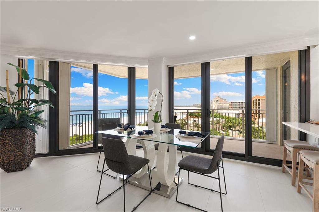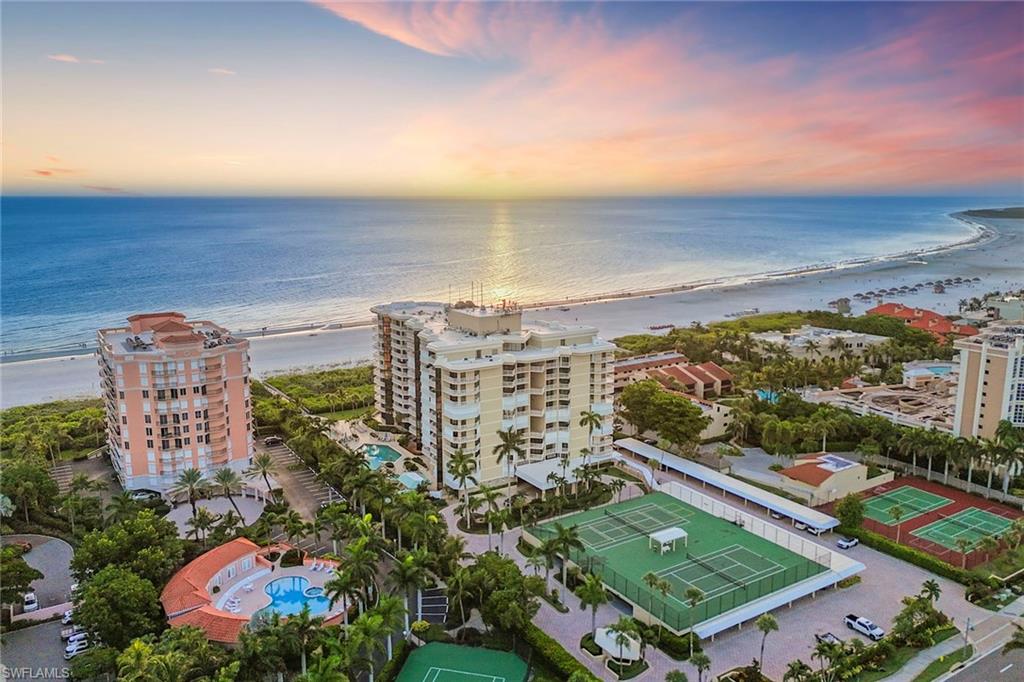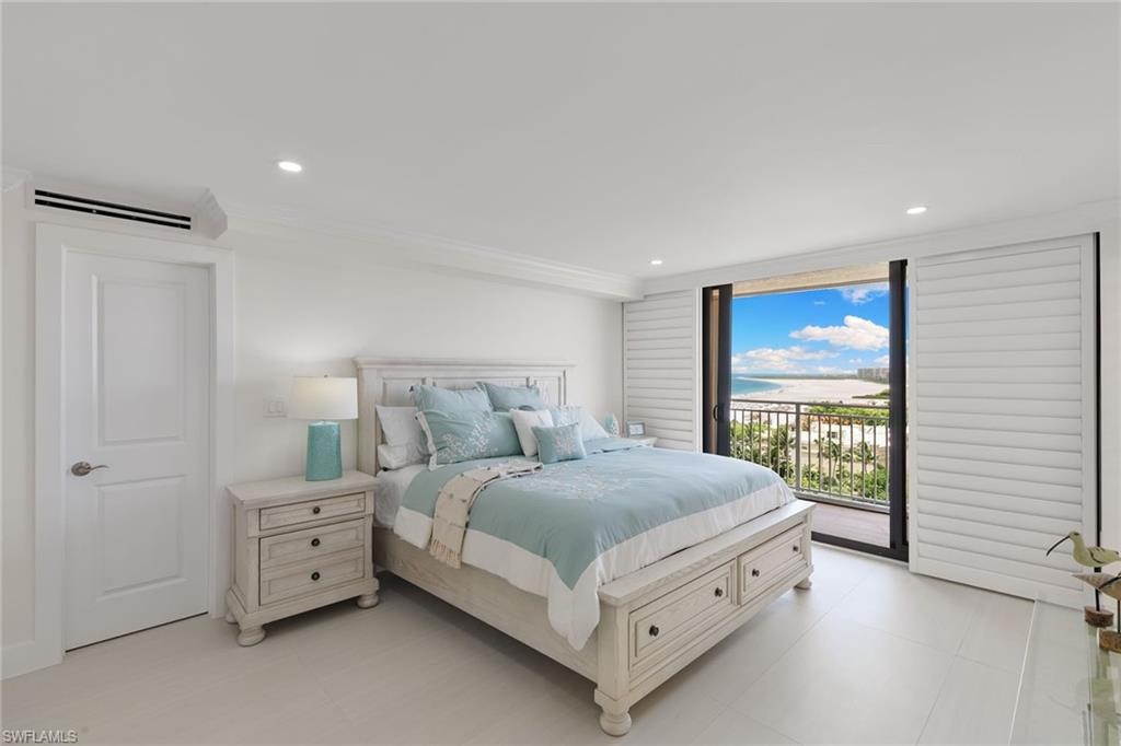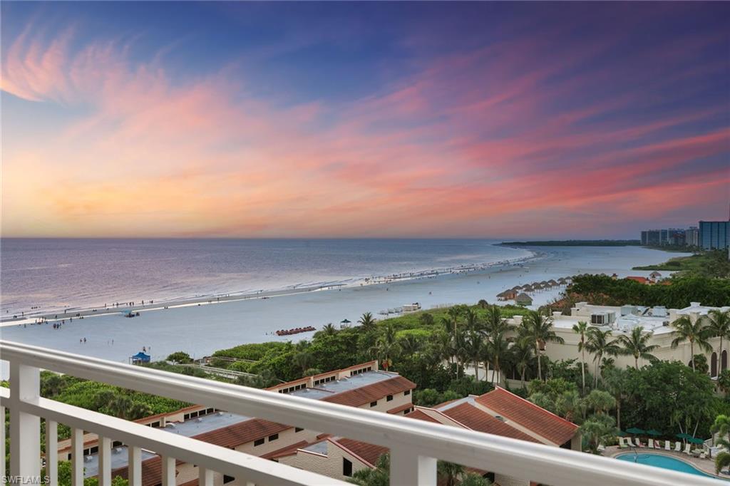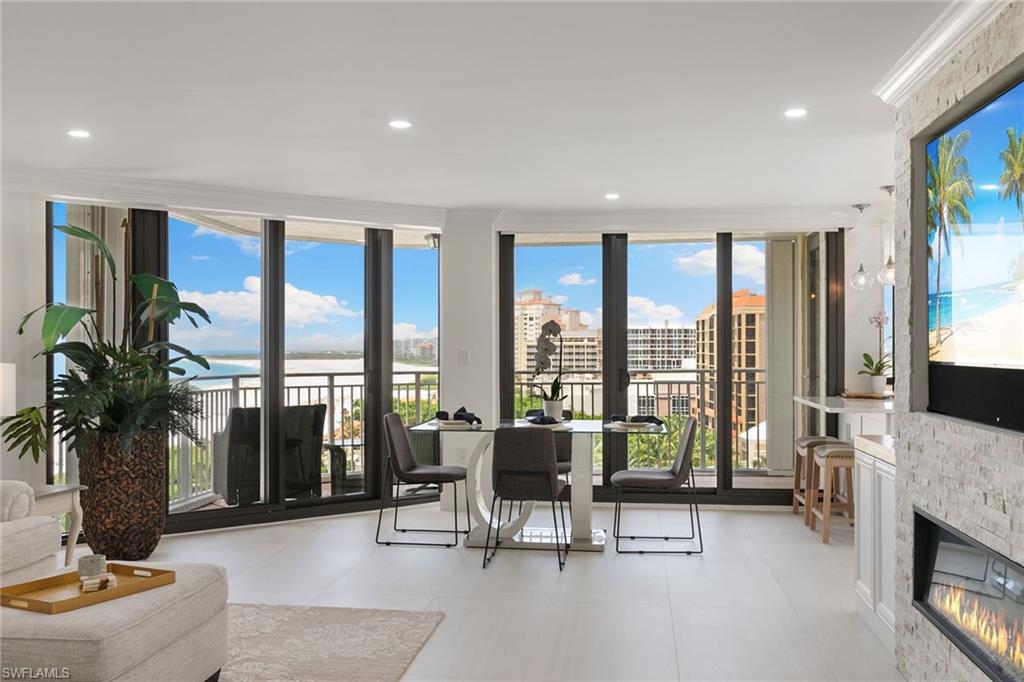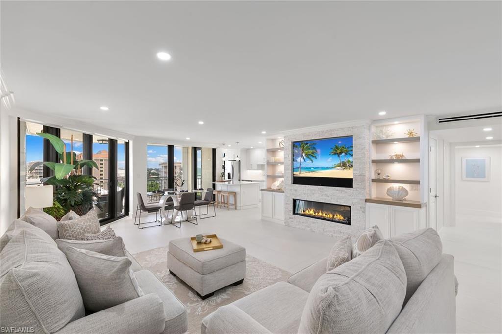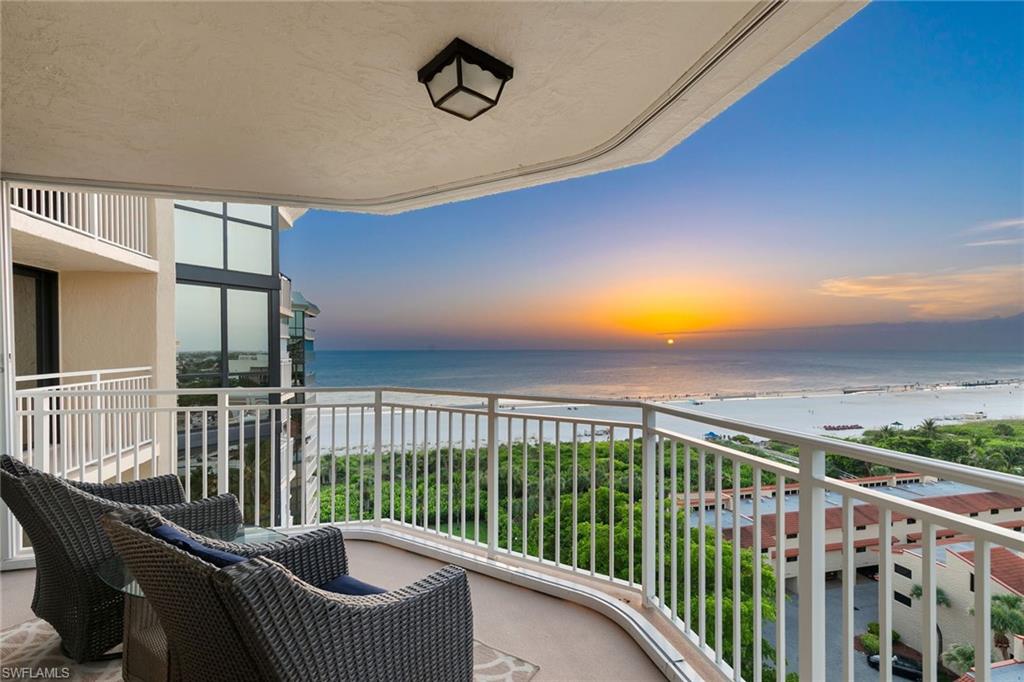 Positioned along Marco Island's iconic crescent-shaped shoreline, this fully reimagined 11-floor end residence captures commanding 90-degree views of the Gulf and city skyline. With 2, 193 square feet of interior space and four private balconies—one for each bedroom—this three-bedroom, three-bath residence offers seamless indoor-outdoor living from every vantage point. Completed in early 2025, the meticulous renovation showcases large-format tile throughout, a reconfigured kitchen with quartz countertops and backsplash, new appliances, upgraded baths, a new electric fireplace and extensive custom storage. Impact-resistant sliding glass doors and windows, paired with accordion shutters on all balconies to provide double storm protection. The open-concept layout is designed to maximize natural light, coastal breezes and captivating sunset vistas. This prestigious beachfront building features a soaring three-story atrium lobby, private beach access and resort-style amenities such as a heated pool and spa, fitness center with sauna, tennis and pickleball courts, social room, library, grilling cabana, and ButterflyMX security. On-site management and weekday front desk service offer unmatched convenience. One assigned covered parking space is included. Ideally near the JW Marriott, Hilton and Marco Walk Plaza, this residence delivers a rare blend of tranquility, sophistication and accessible luxury.