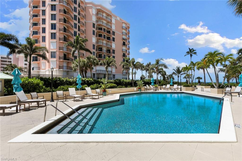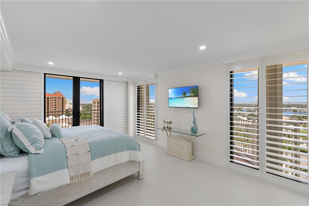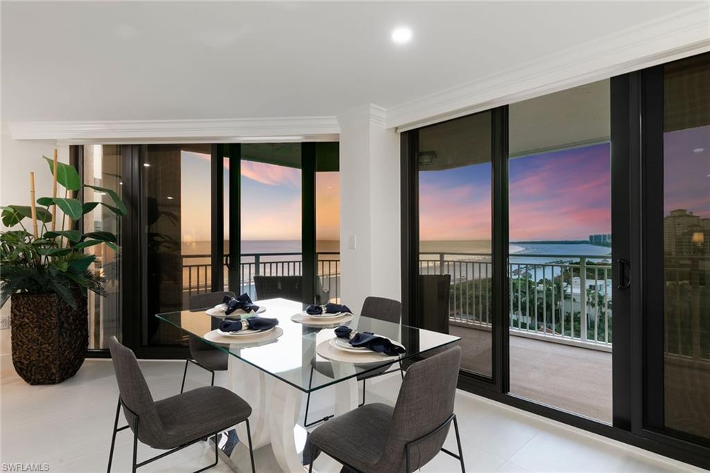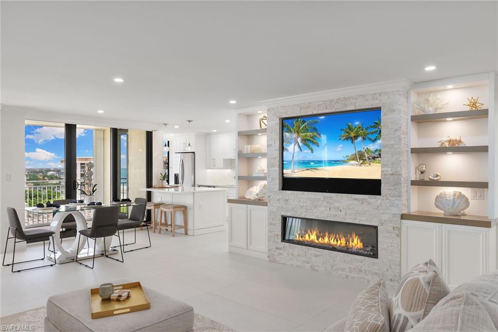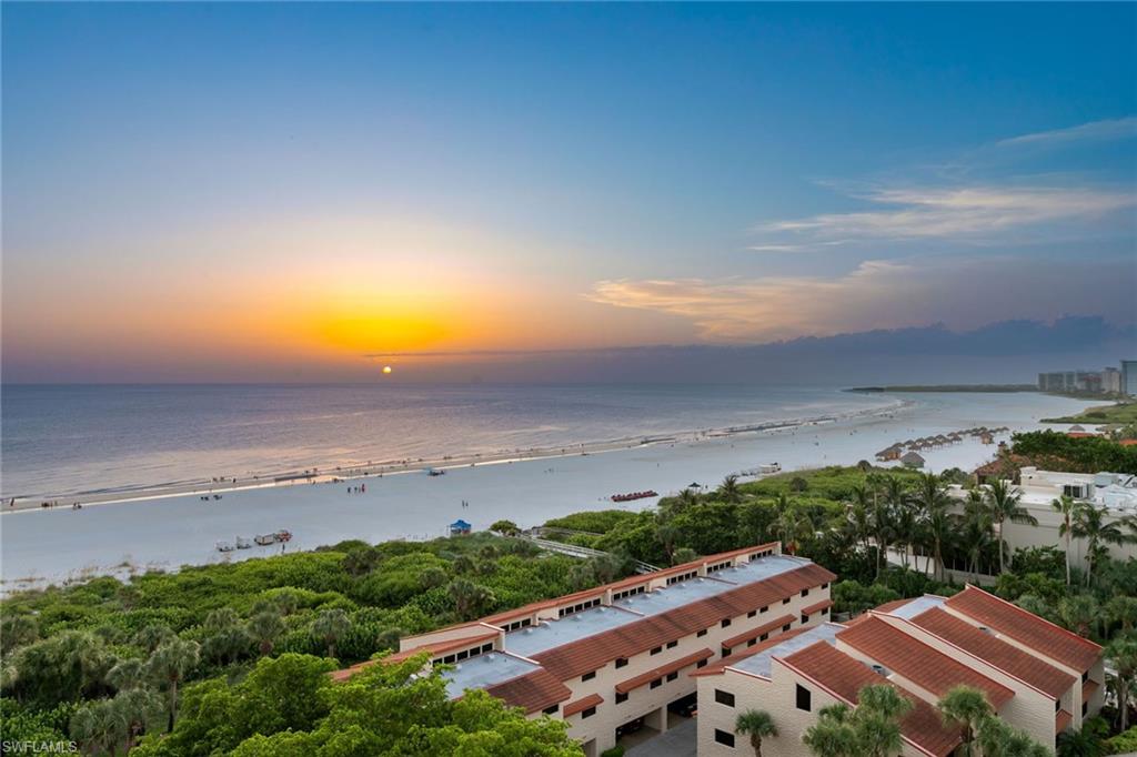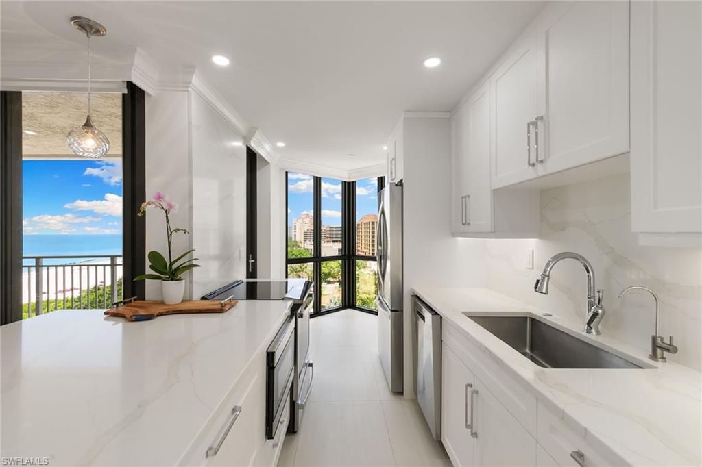 Positioned along Marco Island's iconic crescent-shaped shoreline, this fully reimagined 11-floor end residence captures commanding 90-degree views of the Gulf and city skyline. With 2, 193 square feet of interior space and four private balconies—one for each bedroom—this three-bedroom, three-bath residence offers seamless indoor-outdoor living from every vantage point. Completed in early 2025, the meticulous renovation showcases large-format tile throughout, a reconfigured kitchen with quartz countertops and backsplash, new appliances, upgraded baths, a new electric fireplace and extensive custom storage. Impact-resistant sliding glass doors and windows, paired with accordion shutters on all balconies to provide double storm protection. The open-concept layout is designed to maximize natural light, coastal breezes and captivating sunset vistas. This prestigious beachfront building features a soaring three-story atrium lobby, private beach access and resort-style amenities such as a heated pool and spa, fitness center with sauna, tennis and pickleball courts, social room, library, grilling cabana, and ButterflyMX security. On-site management and weekday front desk service offer unmatched convenience. One assigned covered parking space is included. Ideally near the JW Marriott, Hilton and Marco Walk Plaza, this residence delivers a rare blend of tranquility, sophistication and accessible luxury.
