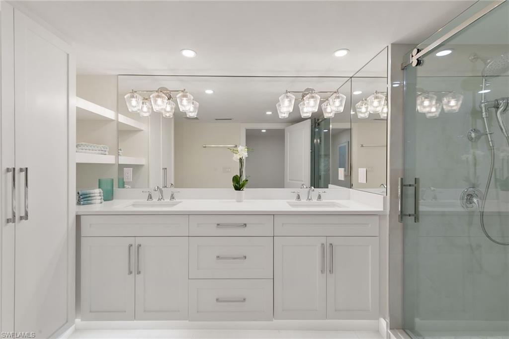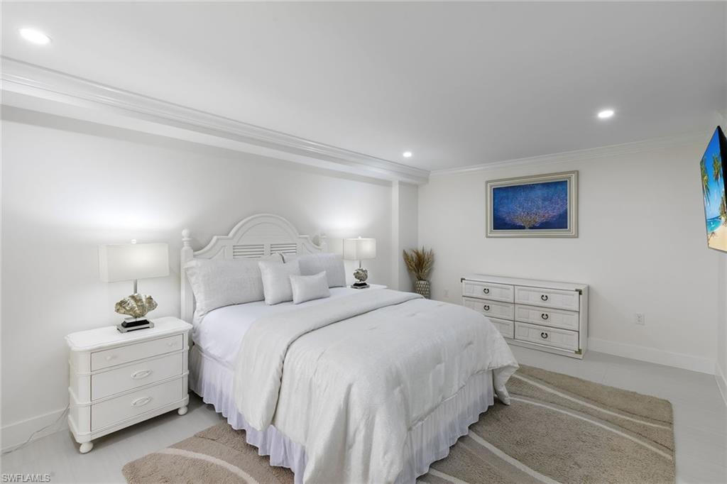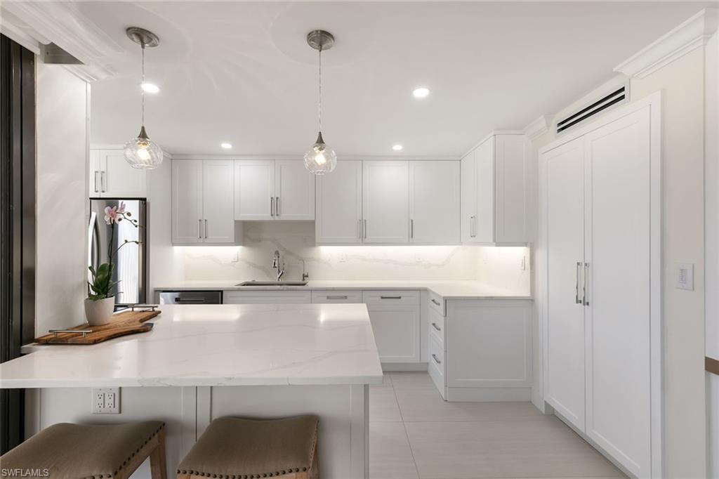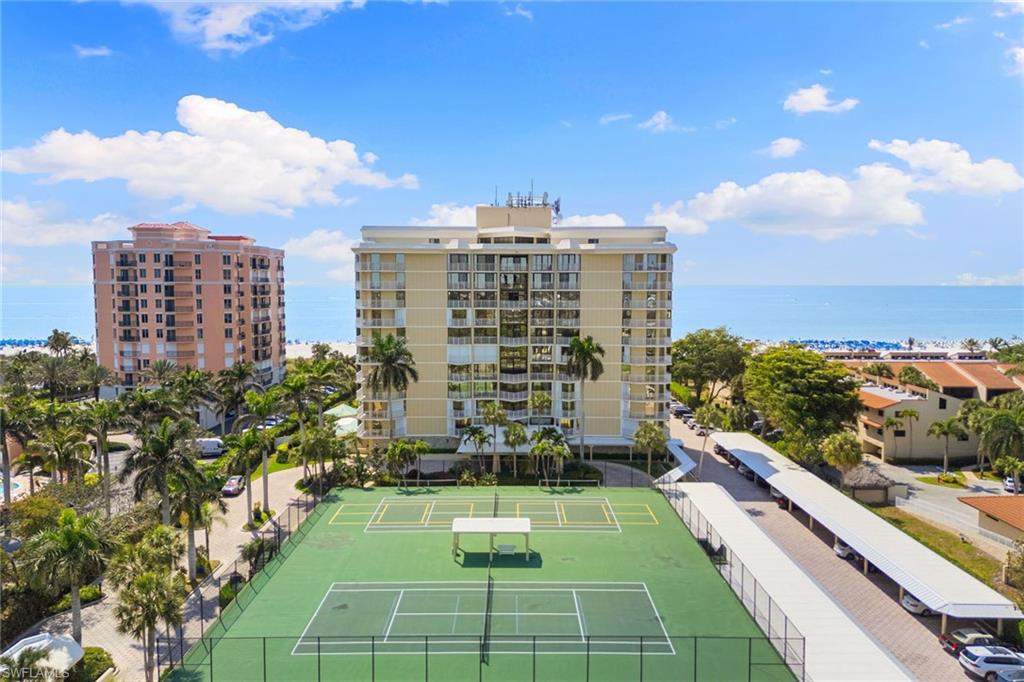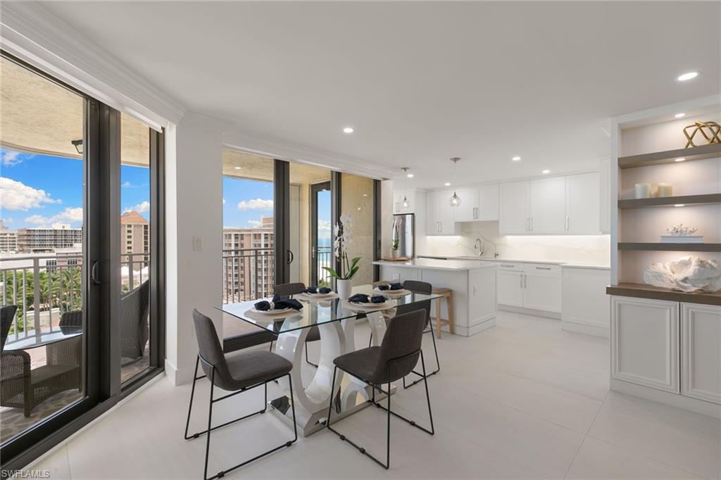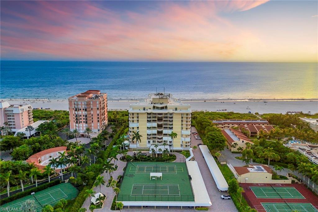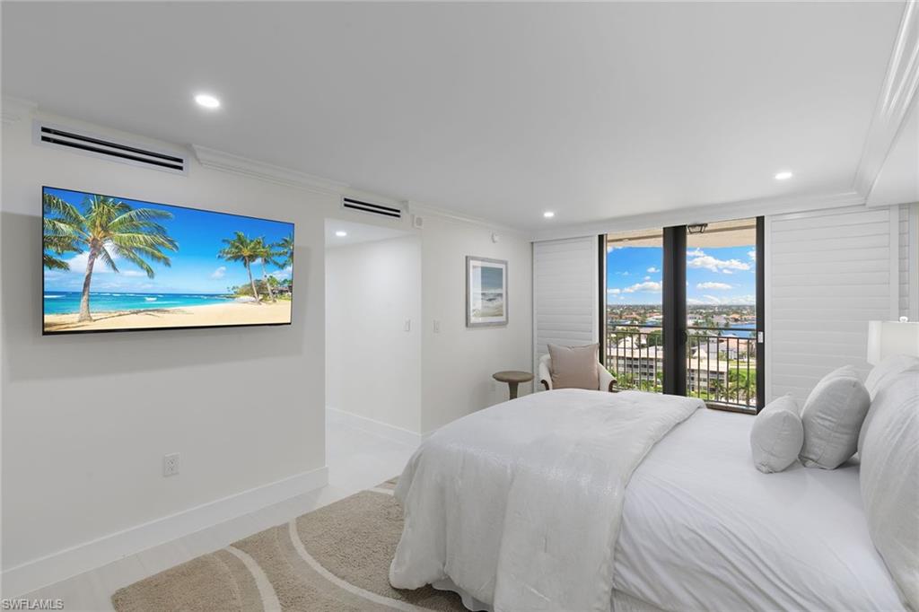 Positioned along Marco Island's iconic crescent-shaped shoreline, this fully reimagined 11-floor end residence captures commanding 90-degree views of the Gulf and city skyline. With 2, 193 square feet of interior space and four private balconies—one for each bedroom—this three-bedroom, three-bath residence offers seamless indoor-outdoor living from every vantage point. Completed in early 2025, the meticulous renovation showcases large-format tile throughout, a reconfigured kitchen with quartz countertops and backsplash, new appliances, upgraded baths, a new electric fireplace and extensive custom storage. Impact-resistant sliding glass doors and windows, paired with accordion shutters on all balconies to provide double storm protection. The open-concept layout is designed to maximize natural light, coastal breezes and captivating sunset vistas. This prestigious beachfront building features a soaring three-story atrium lobby, private beach access and resort-style amenities such as a heated pool and spa, fitness center with sauna, tennis and pickleball courts, social room, library, grilling cabana, and ButterflyMX security. On-site management and weekday front desk service offer unmatched convenience. One assigned covered parking space is included. Ideally near the JW Marriott, Hilton and Marco Walk Plaza, this residence delivers a rare blend of tranquility, sophistication and accessible luxury.