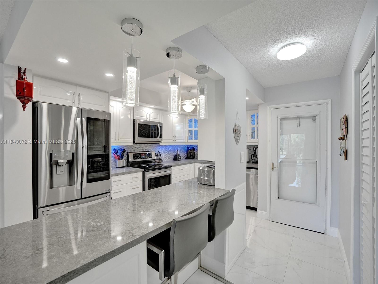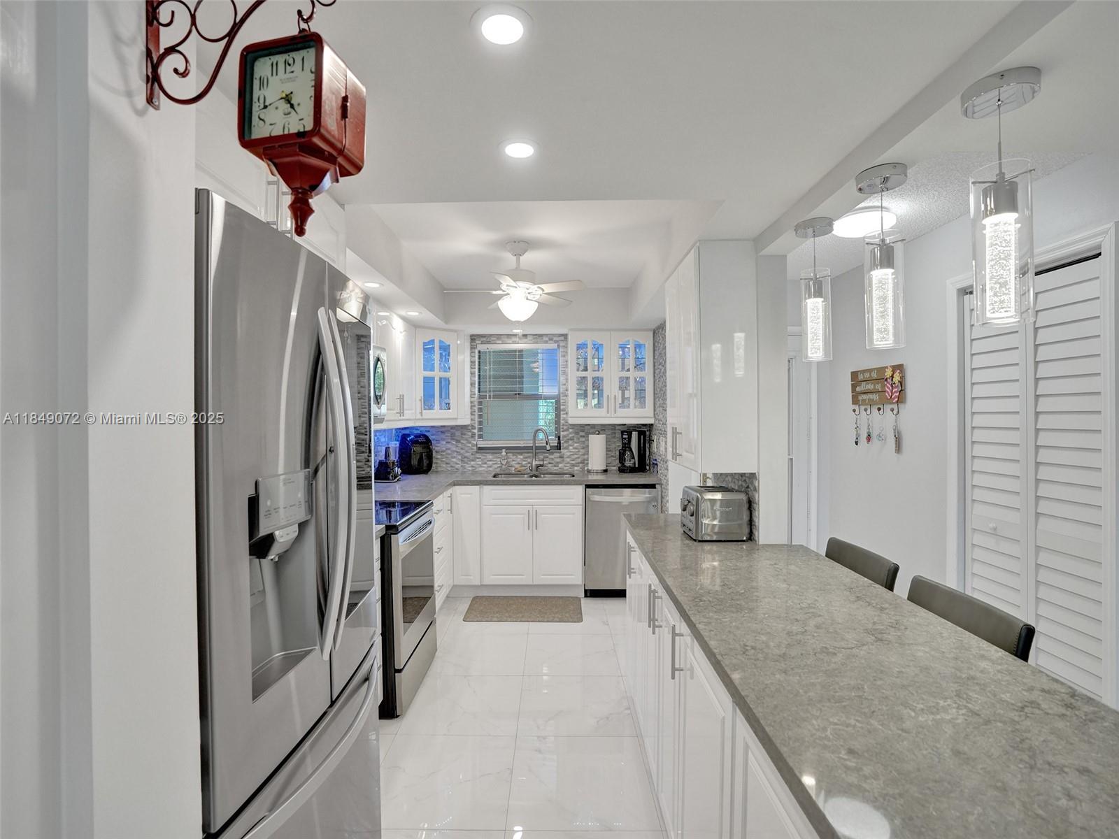 This beautifully renovated 2-bedroom unit is fully furnished and ready for immediate move-in, offering peaceful golf course views from the screened balcony. The sleek kitchen includes new stainless steel appliances, and ceramic tile flows throughout the entire space. A washer and dryer are located inside the unit for added convenience. Situated in a gated HOPA community with completed 40-year inspection, residents can enjoy amenities such as a heated pool, fitness center, clubhouse, tennis and pickleball courts, and a billiards room. Ideally located near shopping and restaurants, this unit is easy to show.