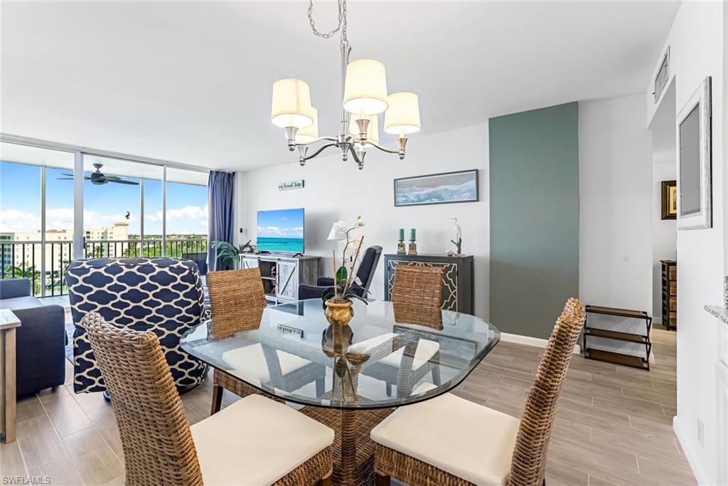 This beautifully updated condo in Vanderbilt Towers at 5 Bluebill Ave offers a delightful and comfortable vacation destination on the 8th floor. The one-bedroom, one-bath unit features wood-look tile flooring throughout and has been freshly painted, creating a modern and inviting ambiance. The kitchen and bathroom are both updated with elegant granite countertops, enhancing the overall aesthetic. The bedroom is equipped with two full-sized beds and a convenient dressing room with a sink situated between the bedroom and bathroom. Tastefully decorated and very cozy, this condo provides a perfect retreat. The gated community boasts a lovely community pool for residents, tenants, and guests, and the on-site manager's office on the first floor ensures assistance is readily available. Enjoy the close proximity to all the wonderful amenities that Naples has to offer.