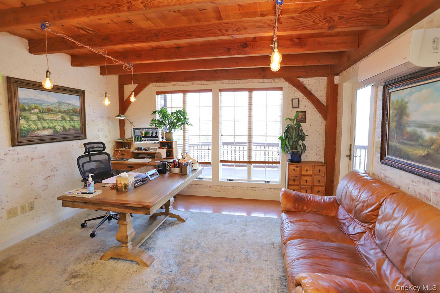 Could you live with stunning views of the Delaware River valley and the surrounding Catskills? Watch bald eagles and hawks glide past your windows? This Beechwoods contemporary is set in a hilltop neighborhood of upscale homes. Elegant Douglas Fir post-and-beam framing creates a high cathedral ceiling and open space. All rooms have soaring views of sky, mountains and the river. South and west siting provides all-day sun. Solar roof panels, low-E Andersen windows, and 4-zone radiant heat make for an energy-efficient home. Air conditioning is handled by a 2-zone ultra-quiet Fujitsu central system plus 4 Fujitsu ultra-quiet mini-split units, making a total of 6 AC zones. 5G cell service and Spectrum fiber-optic 1GB internet keep you connected, and a whole-house generator keeps you up and running. A wraparound deck, covered front porch, stone patio, and firepit provide easy outdoor spaces for relaxing, entertaining, and enjoying the view. With 4, 682 square feet, 5 BRs, 3 full baths (new fixtures) and spacious rooms, you'll handle a crowd. Kitchen has granite counters and new/recent Bosch and Samsung appliances. New washer & dryer. Family room has a pool table, propane fireplace, built-in surround sound, and a home theater. Fully equipped gym also has a sauna. The 6-car garage is insulated, heated, and houses a Tesla EV charger. All mechanicals are high-end and were installed 2018-2019. A new roof was installed in 2019. A large, side-attached garden equipment storage room provides exterior access to garden tools and equipment. The grounds are both landscaped and wild, with multiple outdoor walking and gathering spots. Mature plantings, a pond, and a hiking trail enhance the natural beauty of this special Catskills retreat. Just 2 hours from NYC; 5 minutes from Callicoon and the Delaware River.