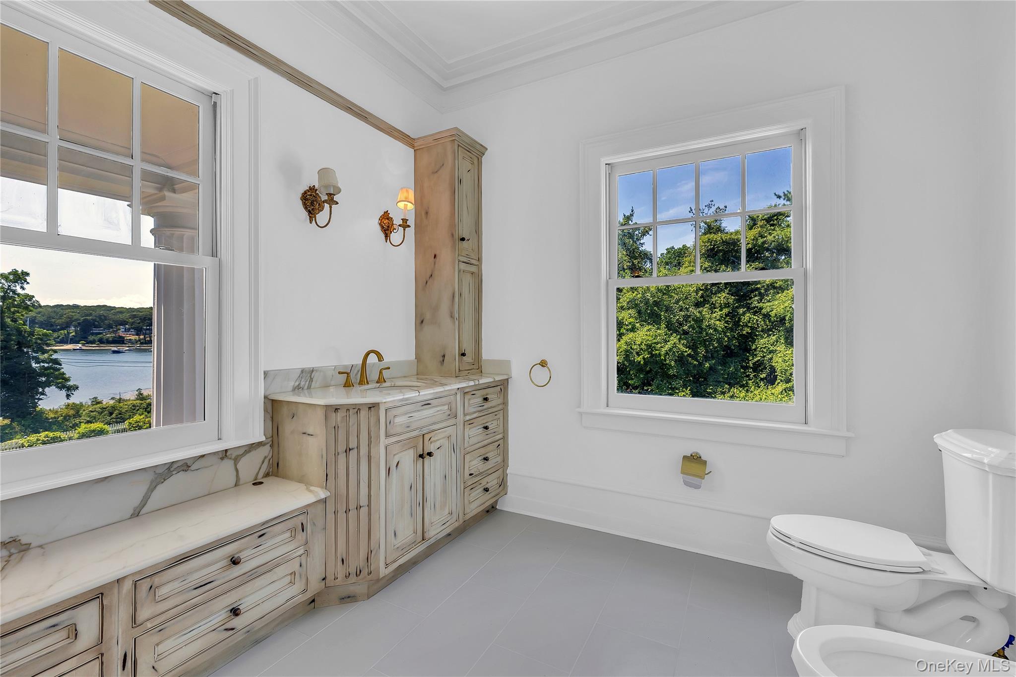 Spectacular restored Georgian Colonial Mansion on 2. 6 acres and 400 feet of waterfront! Yes! 400 feet of direct waterfront on Huntington Bay with spectacular views from every room. 7 bedroom, 7 bath, eat-in kitchen, formal living room with large fireplace, and other unique rooms. This 1917 updated home with incredible original details inside and out, and modern amenities including 7 zone central air conditioning throughout. Updated kitchen with fireplace and 7 bathrooms. Master suite with separate his and her bathrooms and closets, and even a waterview from the sunken bathtub! In-ground sprinklers, generator, shower/steam room, refinished wood flooring throughout, updated electrical, updated plumbing, and new gas boiler-hot water heater. High ceilings and unique architectural details throughout. Original brick patios, large Roman in-ground gunite pool. Large 3 car garage with high ceilings and huge 1, 000 sq ft room above garage with 12 foot ceilings. Quality fenced in property with new driveway. Taxes are only $48, 721. 18