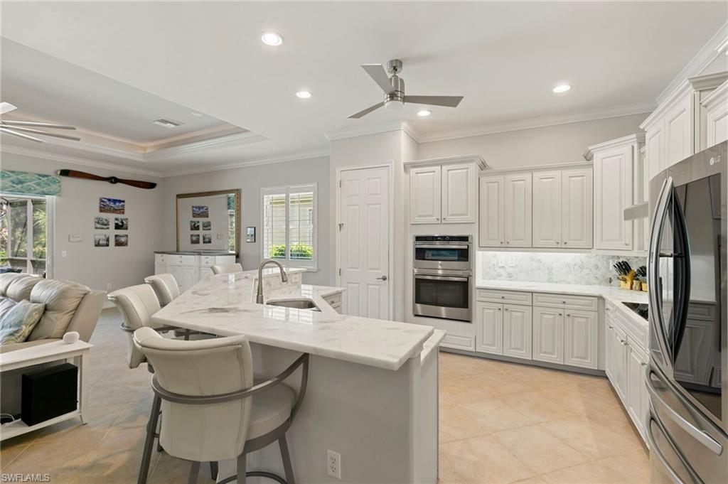 The upgraded kitchen boasts modern finishes, upgraded appliances, and sleek countertops, flowing seamlessly into the open and spacious living area with plantation shutters throughout.