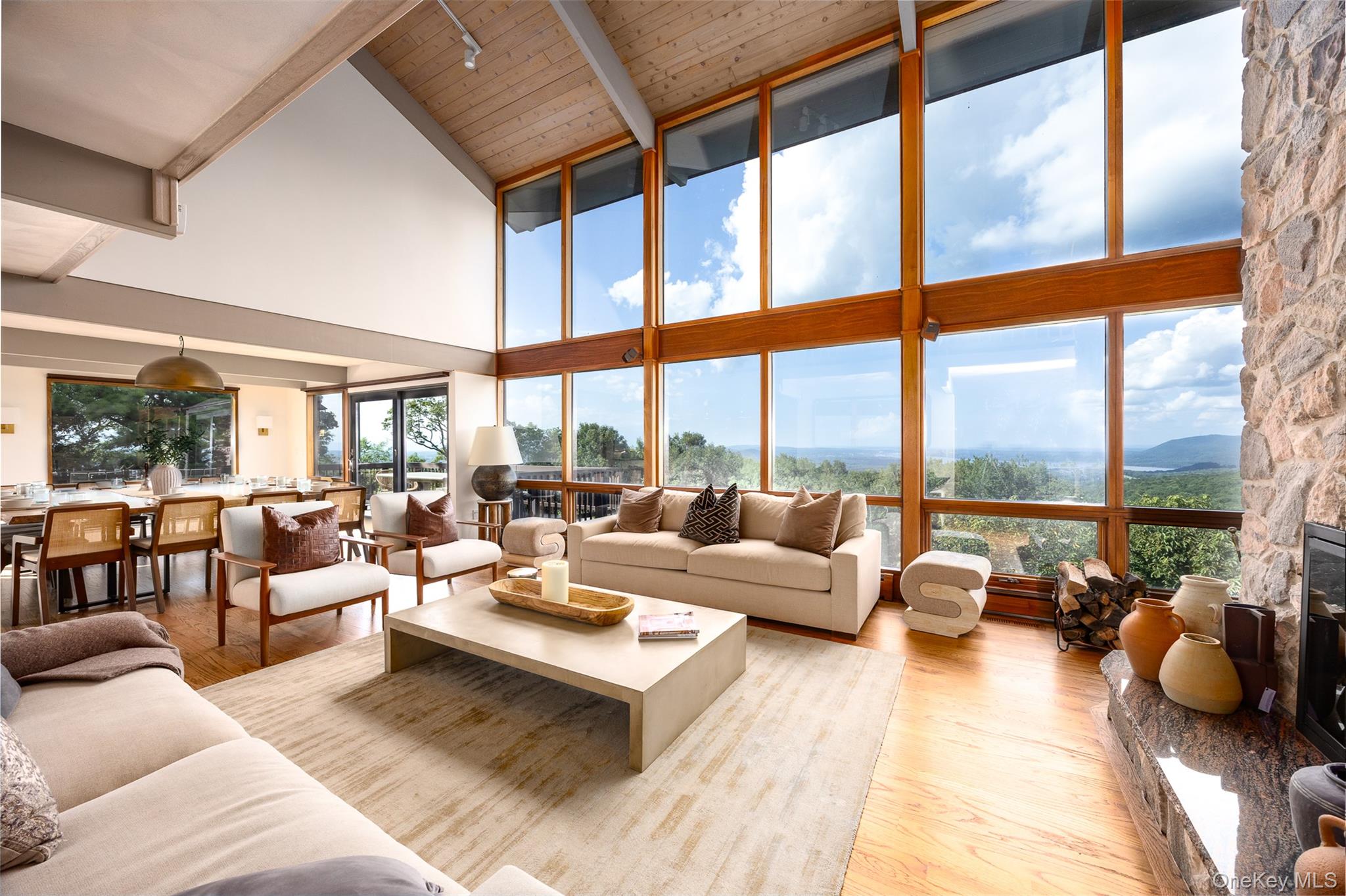 Welcome to Mountain Brook Estate, an ultra-private, luxurious mountaintop retreat encompassing 26+ acres on one of the highest elevations in the Hudson Valley. An hour from New York City and minutes from West Point, this nearly 8, 000 square foot contemporary estate has been meticulously renovated to showcase commanding views of the Hudson River, Storm King Mountain, and the surrounding Catskill and Shawangunk ranges. Blending modern design with timeless elegance, the open-concept residence offers a generous kitchen with two islands, adjacent dining area, 3 great rooms, 4 bedrooms, with a collection of (5) versatile bonus rooms and private offices that can be tailored for additional sleeping quarters, creative studios, or wellness spaces. The open-concept layout is framed by soaring ceilings and walls of glass, allowing natural light and panoramic vistas to flood every corner. Multiple fireplaces and thoughtfully designed living spaces create the perfect balance between comfort and sophistication. Every element of this estate invites rest and restoration. Start your mornings in the carriage house yoga studio, take a swim in the indoor lap pool, or relax in the brand new infrared sauna. Private manicured walking trails wind through the grounds, connecting curated viewing platforms, peaceful gazebos, and secluded seating areas, designed to immerse you in the landscape while offering moments of quiet reflection. Expansive wraparound decks, two outdoor fire pits, organic garden, a rooftop tower, and a broad great lawn provide an ideal setting for elevated entertaining or serene relaxation, all surrounded by nature at its most majestic. A 10-acre meadow on the property offers unlimited development potential. Additional features include an 1, 100 sq ft guesthouse or studio, a radiant-heated Finnish soapstone fireplace, an oversized 3-car garage, and a whole-house generator to ensure complete peace of mind. Whether you're envisioning a world-class weekend escape, a legacy compound, or an exceptional investment property, Mountain Brook Estate delivers unmatched luxury, privacy, and scale, just a short drive from the city, yet truly a world apart.