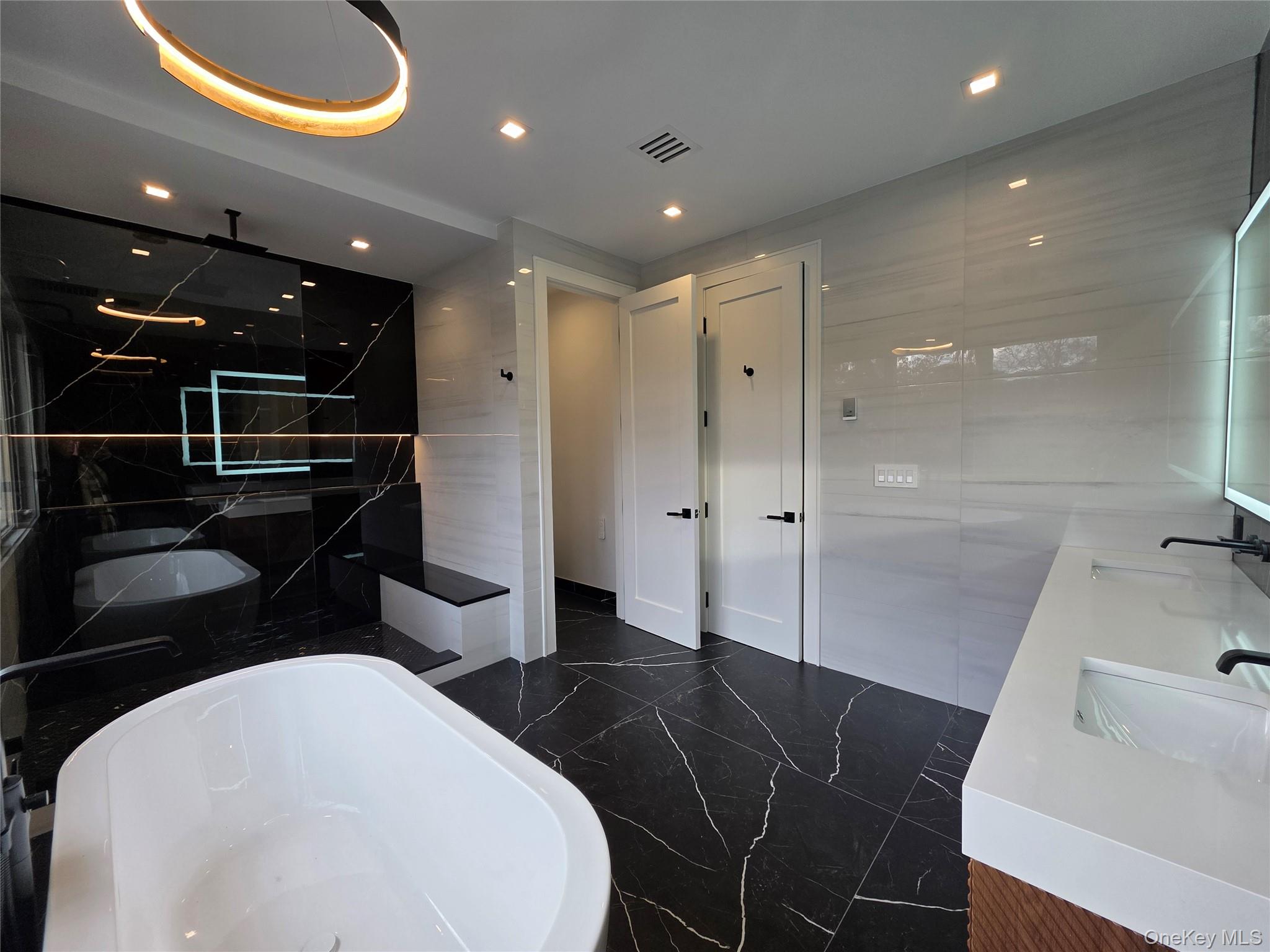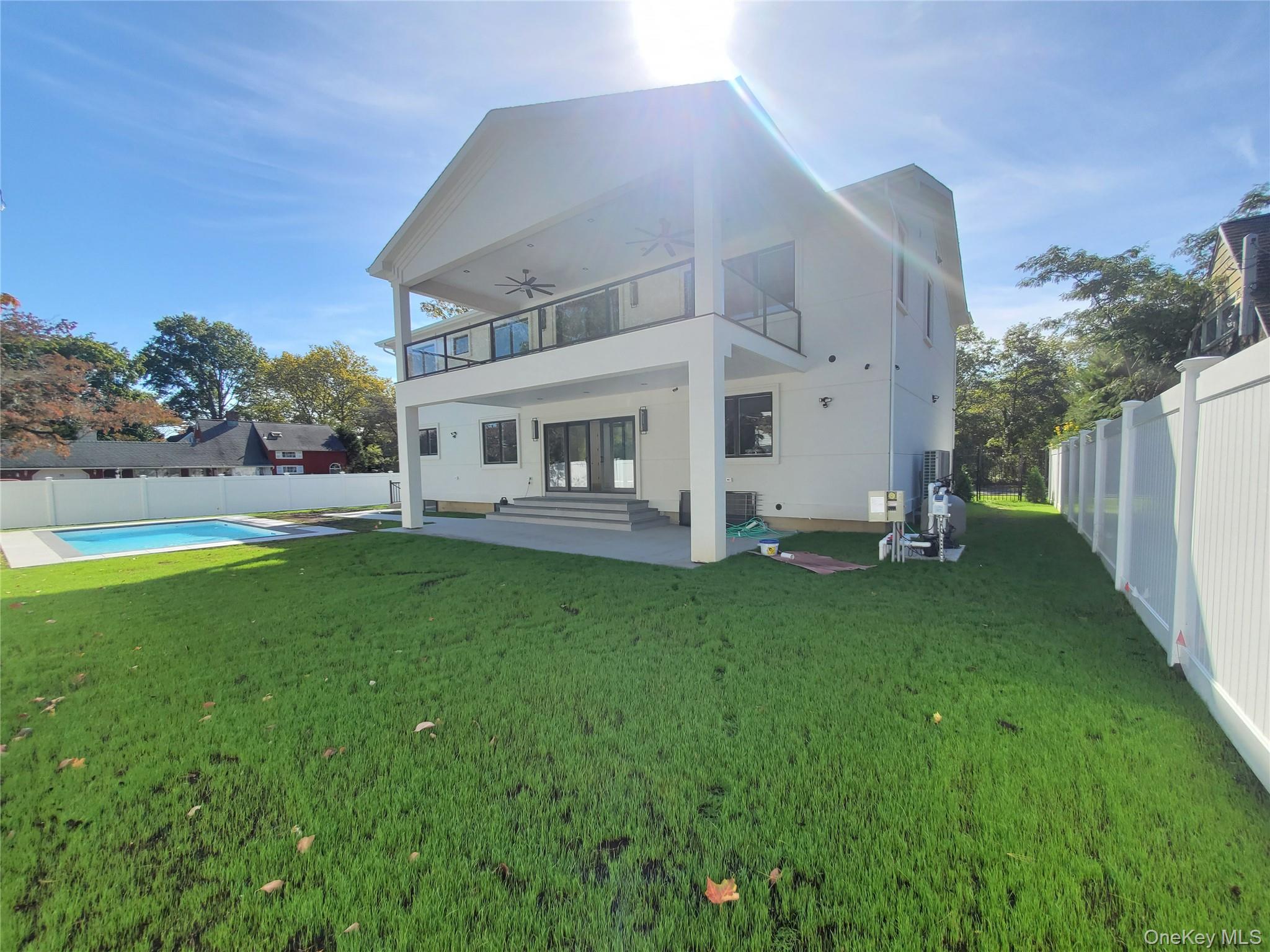 Welcome to your dream home—an extraordinary, one-of-a-kind 5 BR, 5. 5 BA post-modern masterpiece in the highly sought-after Salisbury Estates, East Meadow School District! Offering approx. 6, 000 sq ft of thoughtfully designed luxury, this brand-new construction is perfectly situated on a serene corner lot, showcasing unmatched curb appeal with its bold fusion of stucco, stone, & Andersen glass. This exceptional residence offers the rare opportunity to own a truly custom home built with style, comfort, & sophistication in mind. A private 2-car wide driveway leads to an oversized, EV-ready, oversized 1-car garage featuring a 200 AMP panel & overhead LED lighting. Enter through an 8’ custom steel double front door into a bright & airy layout, where 9’ ceilings, 8” wide-plank natural oak hardwood, and porcelain tile flooring flow seamlessly throughout the expansive 1, 700 sq ft main level. At the heart of the home is a chef’s kitchen that’s both functional and stunning. Featuring a custom oversized center island with natural Brazilian leather-finished granite, pendant lighting, and abundant matte white cabinetry with LED undercabinet and toe-kick lighting, this kitchen is a showstopper. Premium appliances include a Bosch dishwasher, 36” Frigidaire Professional refrigerator & freezer, a 36” induction stove, and a 36” hood. A hidden walk-in pantry and butler’s pantry offer exceptional storage and prep space. Host unforgettable dinners in your formal dining room with recessed lighting and a statement chandelier. The impressive great room boasts a tray ceiling, LED lighting, and a 12’ sliding glass door opening to your covered patio and concrete-formed 12'x24' saltwater pool with a vinyl liner, 4'-9' depths - perfect for entertaining! The 1st-floor guest suite includes a custom-lit built-in closet and an elegant ensuite bath with porcelain tile, floating vanity, LED-lit mirror, custom glass shower doors, and a European-style Duravit wall-hung toilet. A designer half bath features smart bidet toilet, porcelain tile accent wall and floors, and a backlit mirror. A stylish drop zone leads to the garage for daily ease. Ascend to the 2, 050 sf second level via a lit custom floating staircase with steel and glass railings, highlighted by a soaring floor-to-ceiling window wall that floods the space with natural light. The private Primary Suite is a sanctuary, complete with a tray ceiling, dual custom-lit, walk-through & built-in closets, and a spa-like bath with heated porcelain floors, freestanding soaking tub, smart mirror, bidet water closet, double vanity, and a large walk-in shower with seating and LED-lit niche. A junior suite includes its own ensuite with smart mirror, porcelain tile, lit niche, and bidet toilet. The 4th and 5th bedrooms feature custom lit closets and share a luxe Jack & Jill bath with tub, water closet, porcelain tile, and lit niche. The 2nd floor also offers a multi-purpose flex room with custom sliding glass doors leading to a 390 sq ft waterproof balcony with lighting and two ceiling fans. A full-size laundry room features custom cabinetry, quartz countertop, deep sink, and front-loading Electrolux washer/dryer. Attic access is available via drop-stair. The fully finished 1, 540 sq ft basement is the ultimate bonus space, with 9’ ceilings, porcelain tile, walk-in closets, and recessed lighting. Includes a private entrance, egress window, full bath with smart mirror and glass shower, dedicated panel for equipment, two 55-gallon electric Rheem water heaters, Samsung high-efficiency heat pump, and a 320 sq ft concrete mechanical storage room. Step outside into your private, fully fenced backyard oasis, featuring a saltwater pool, spacious patio, and 3-zone inground sprinkler system. Modern conveniences include central air conditioning, smart exterior camera system, underground electric utilities, and Verizon FiOS service throughout.