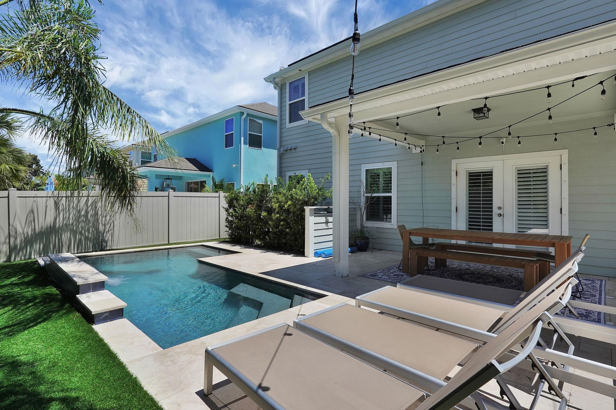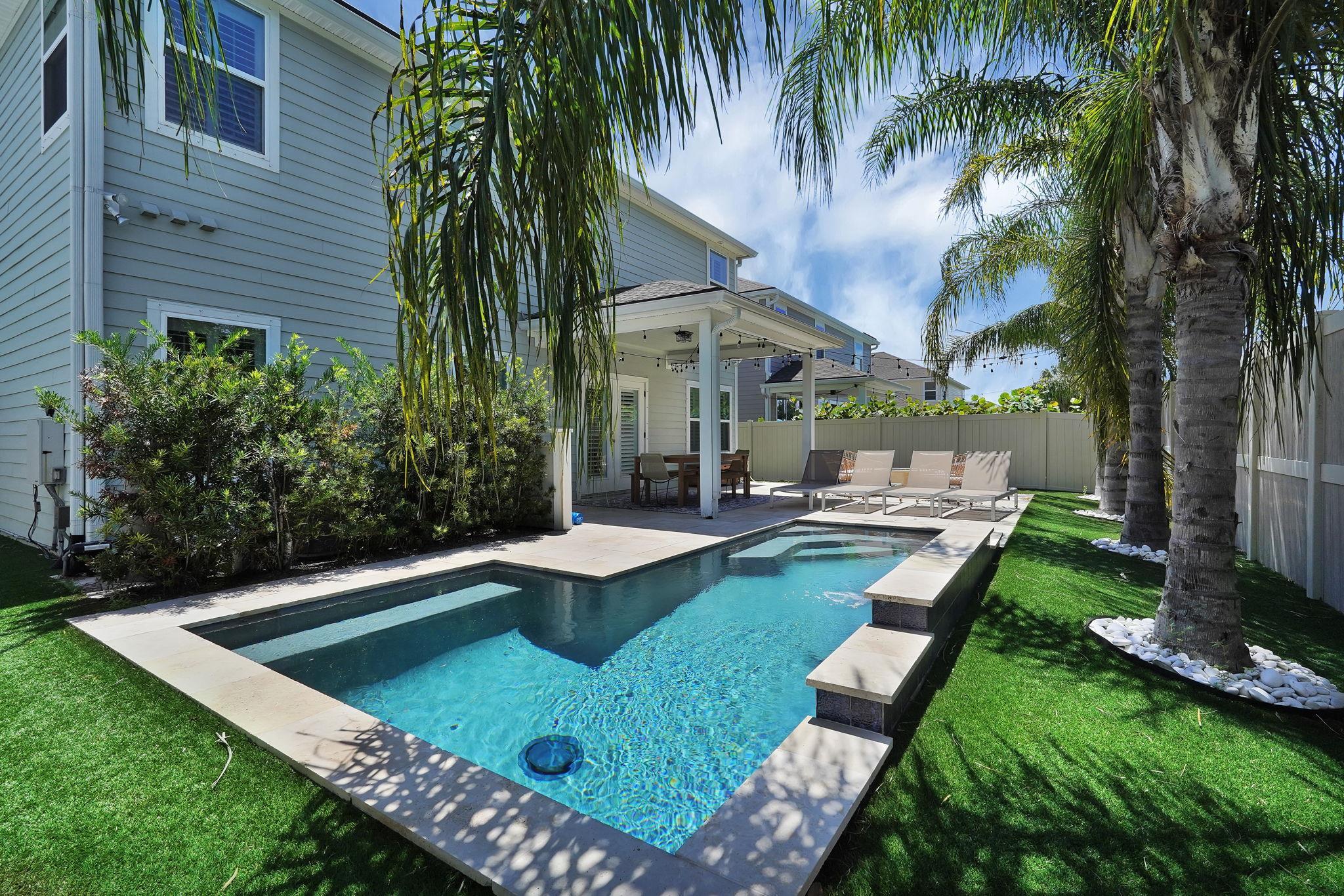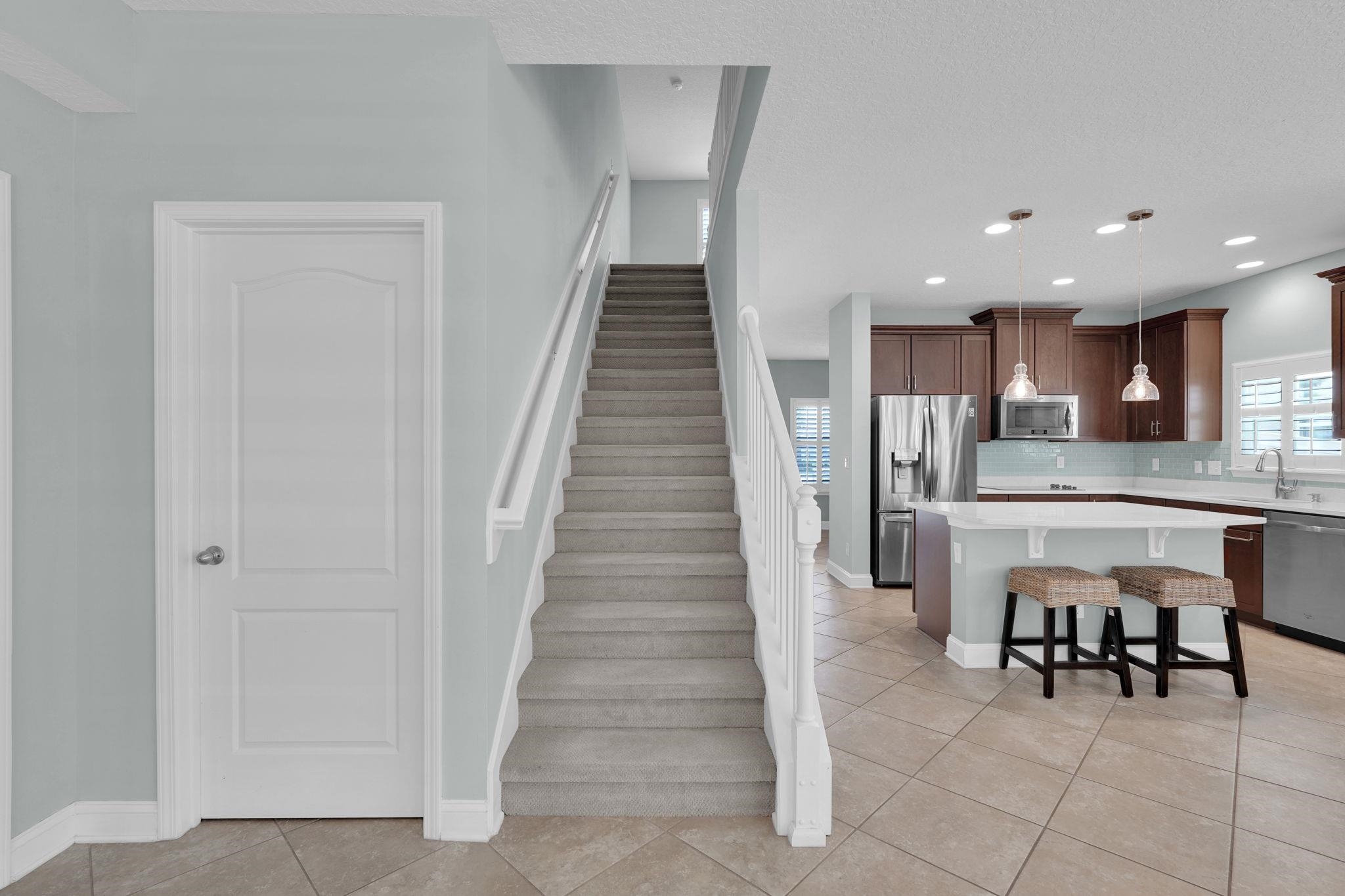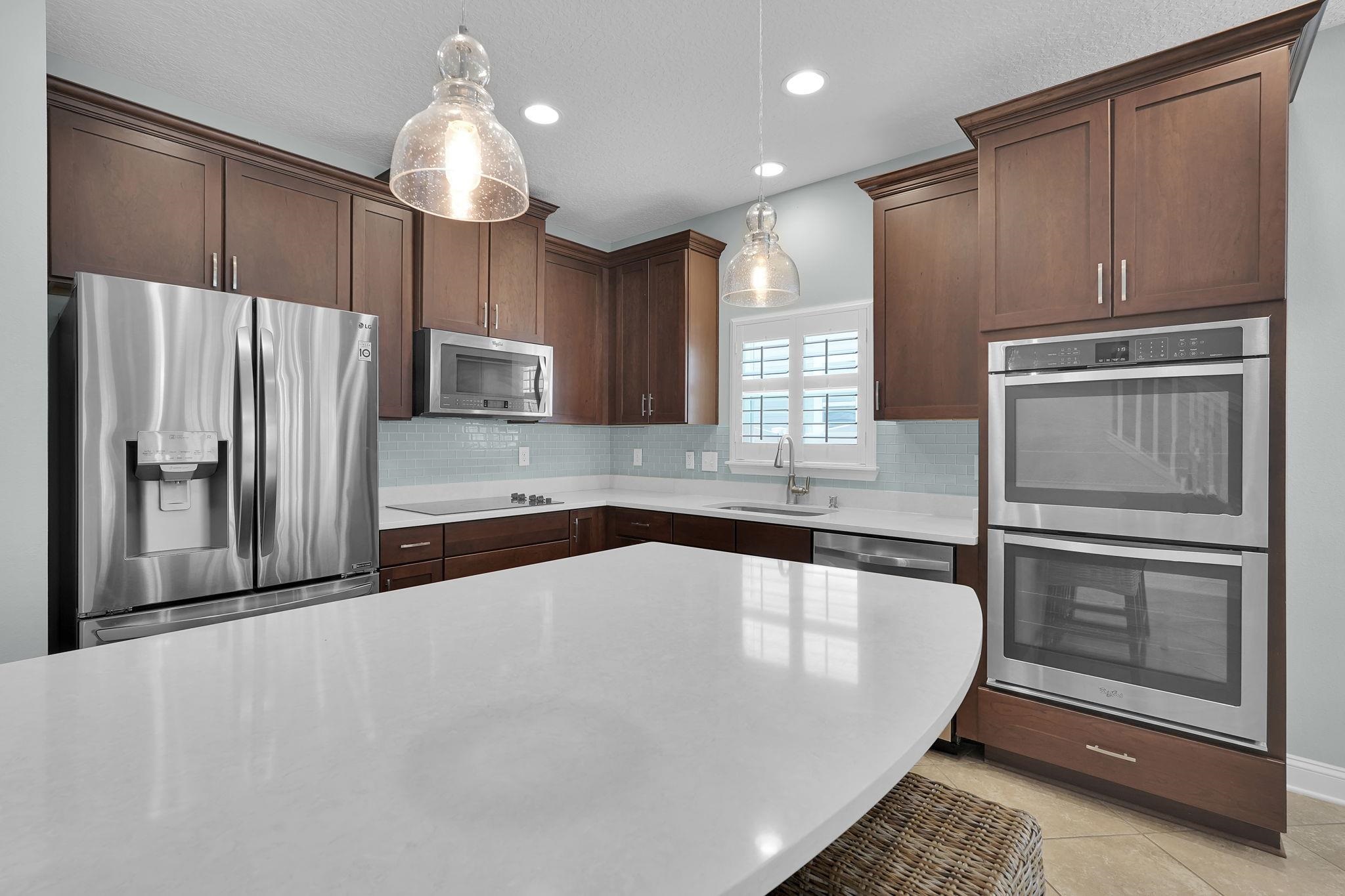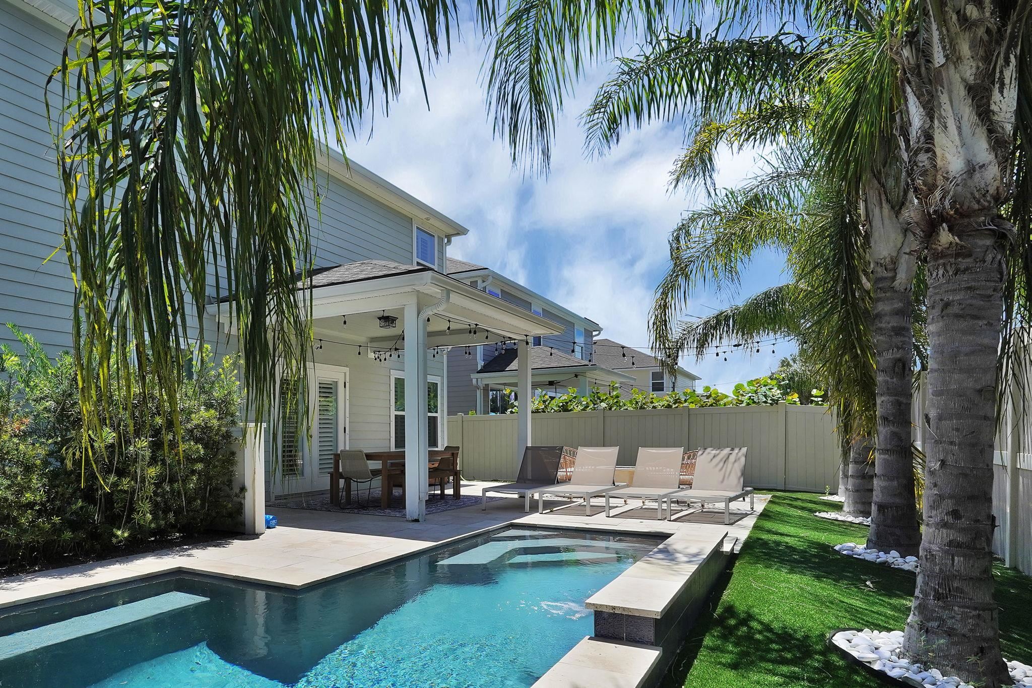 LOCATION, LOCATION! This coastal inspired home boasts four bedrooms, three and a half bathrooms and over 2, 900 sf of living space. The kitchen features quartz countertops, oversized floating island, 42' cabinets and upgraded stainless steel appliances. Light and bright living area with french doors leading to a pool oasis backyard with turf and palm trees. Extended oversize two car garage perfect for larger vehicles and additional storage. Downstairs master suite has his/her's vanities, garden tub and shower and a deep walk in closet with custom shelving. Upstairs you will find huge loft with a custom built entertainment space, three spacious bedrooms, two full baths and a laundry room (Washer/Dryer included!) with built-ins. This island oasis will is a must see!
