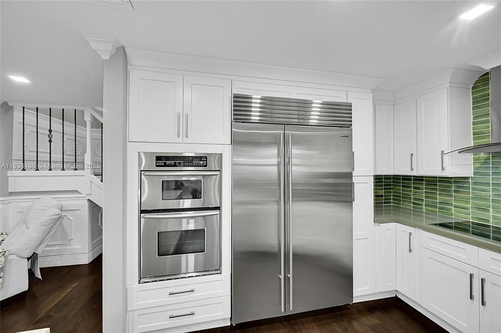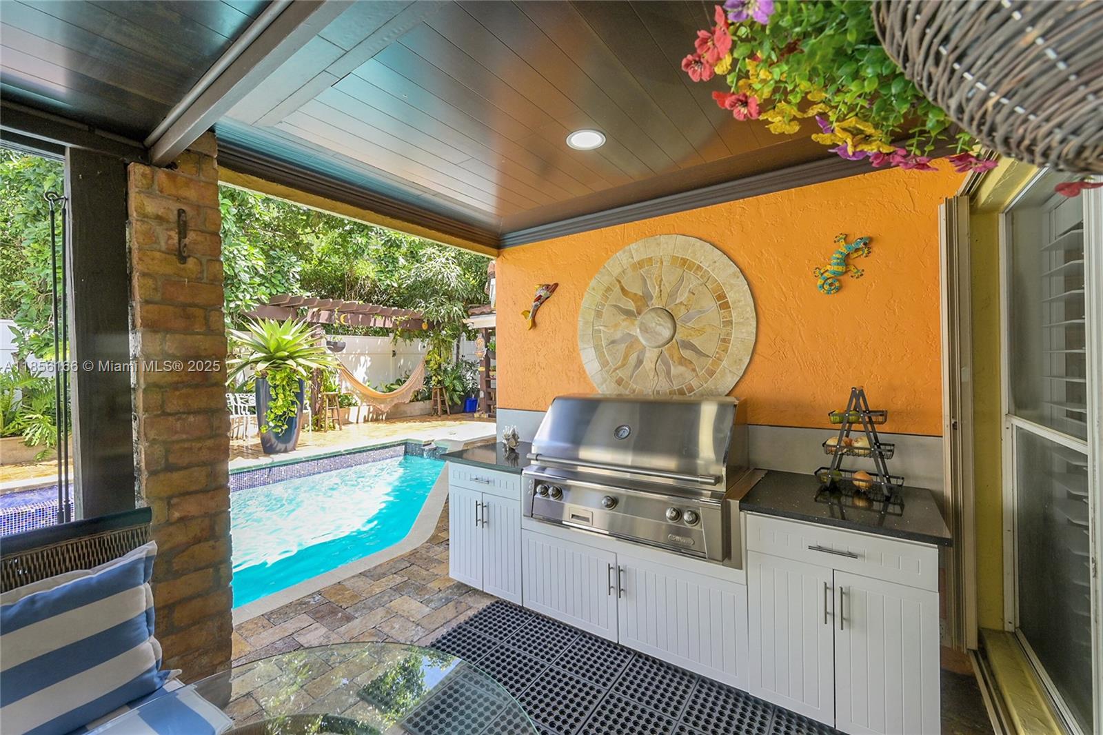 Beautifully upgraded 4-bedroom (2 suites), 3. 5-bath home with vaulted ceilings, crown moldings, plantation shutters, and hardwood floors throughout. Spa-style bathrooms with rain showers and jets; master bath with Italian marble floors and walls. Chef’s kitchen with newer appliances, Sub-zero refrigerator, waterfall quartz island, hot tower, tankless water Heater. Outdoor summer kitchen with Alfresco BBQ grill/with Rotisserie, pizza oven, under wood-paneled patio ceiling. Oversized pool with spa blower, spa bench with jets, marble pool deck, and tropical fruit trees. Also featuring are hurricane shutters, brick driveway, oversized garage with custom closet, upgraded half bath, mud room, and hi-hat lighting throughout. HOA offers tennis courts, pickleball courts, and kids playground.