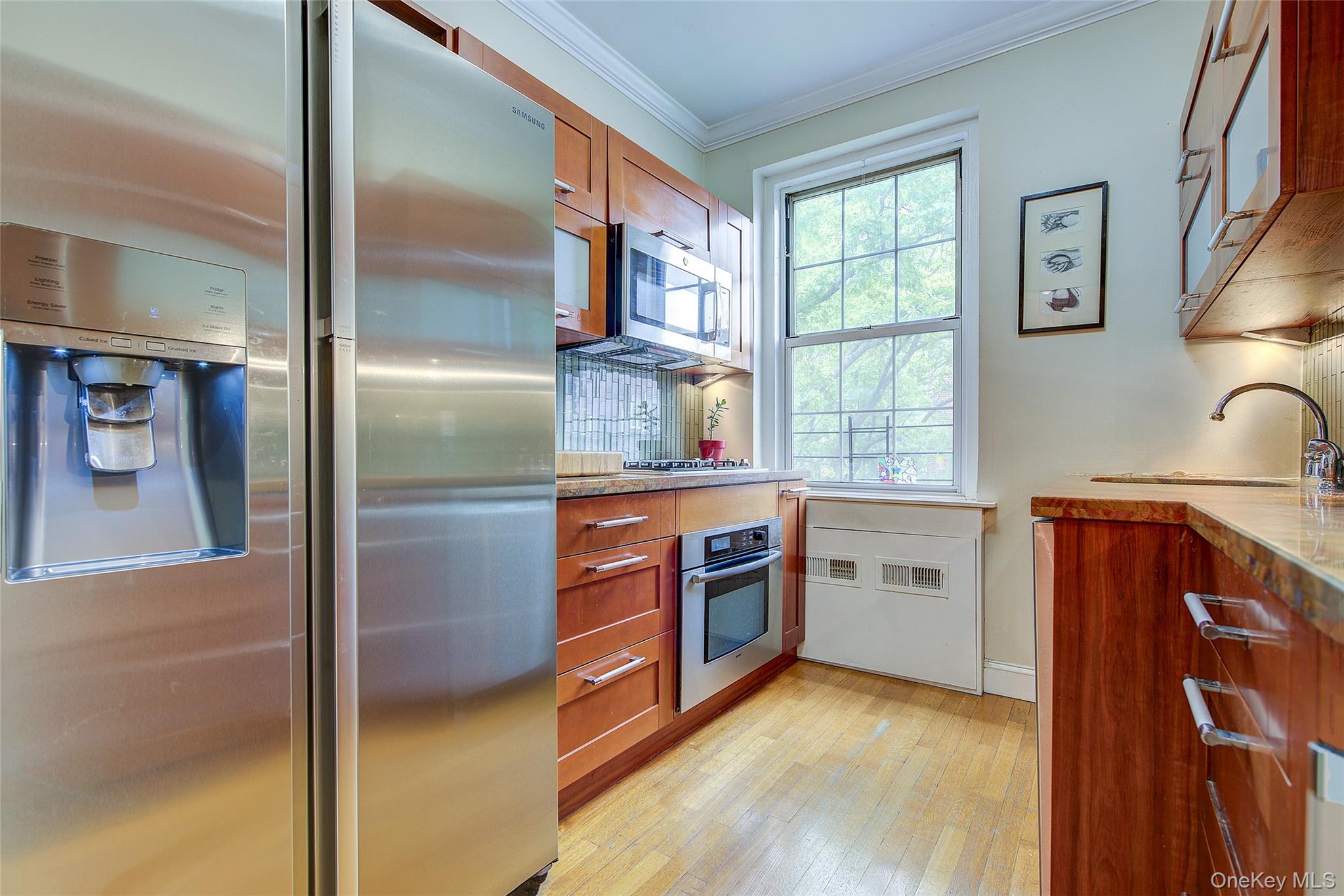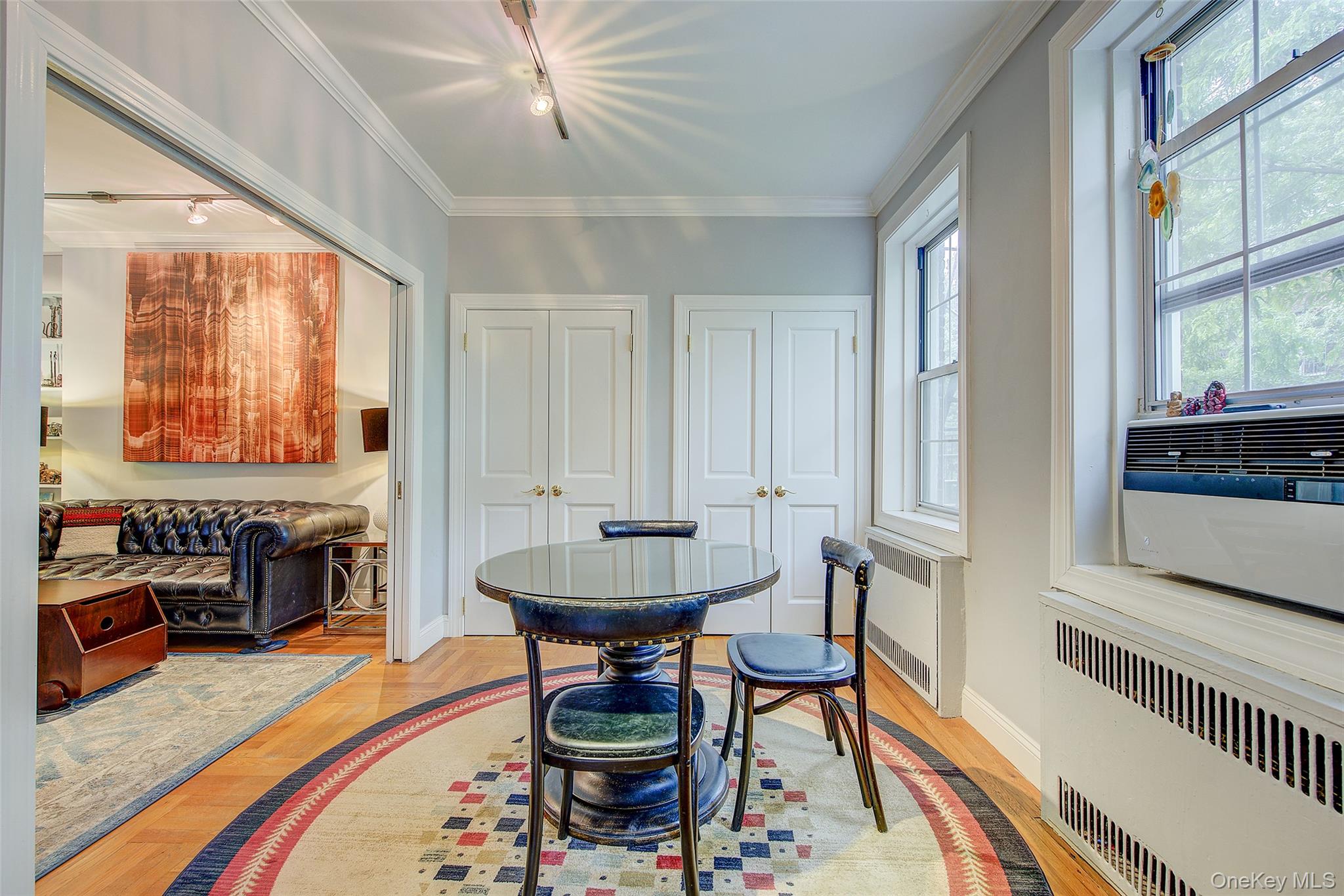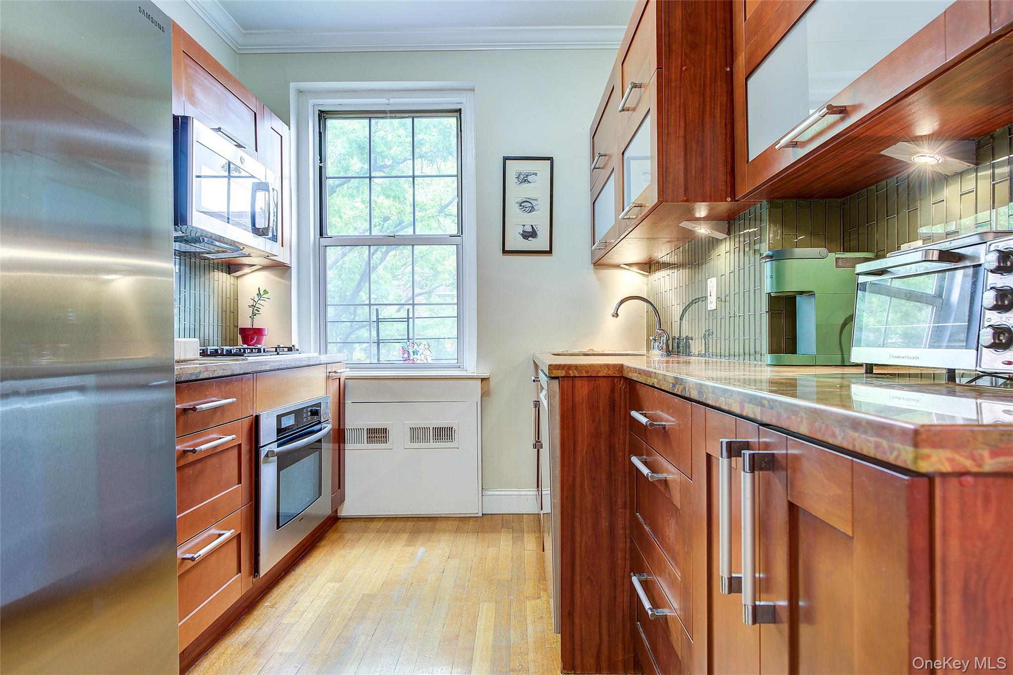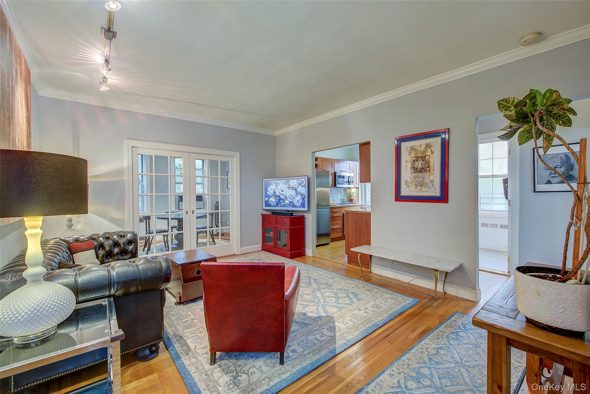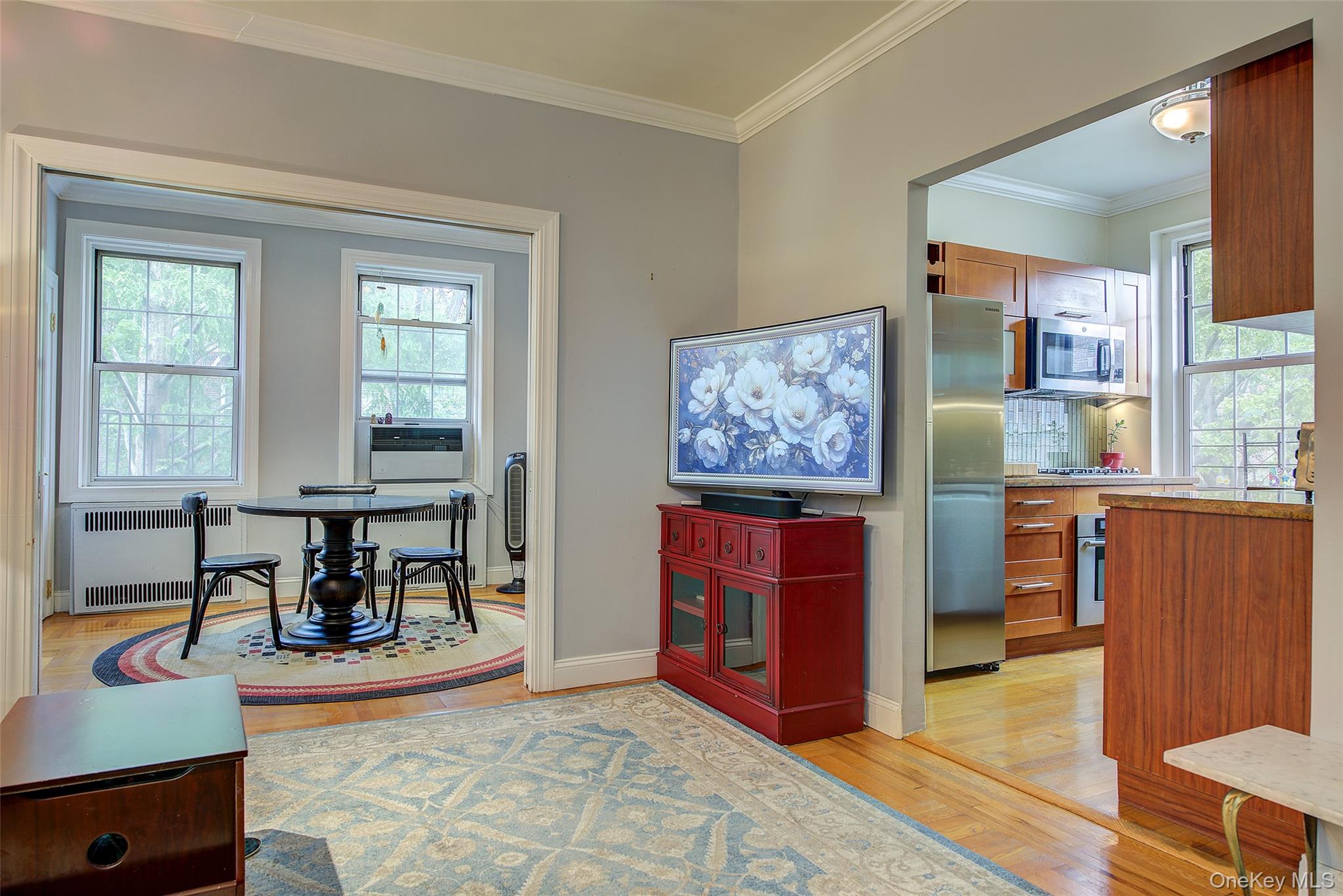 Open house for 8/15/2025 is cancelled. Beautifully reimagined top-floor corner residence in the classic Hampton Court! This thoughtfully updated apartment blends timeless pre-war charm with modern luxury. Highlights include refinished original hardwood floors, elegant French doors throughout, skim-coated walls, and a contemporary kitchen featuring stainless steel appliances, marble countertops, custom cabinetry, and a sleek glass backsplash. The large, windowed bathroom has beautiful marble tiling and modern fixtures. The layout was professionally redesigned to create an open living and dining space ideal for entertaining. The modern kitchen flows into the living room, which is elegantly separated from the formal dining area by custom French pocket doors. The airy primary bedroom is peacefully tucked away from the main living space for optimal privacy. It boasts a generous walk-in closet with a specially designed 11-shelf shoe rack (holding approximately 50 pairs), a pocketbook organizer, and dedicated luggage storage. Expansive Georgian-style windows fill the home with natural light and offer captivating views of Forest Park and the serene courtyard. The second bedroom/Jr. 4 (9' x 9') is bright and versatile, with two windows and its own heater: perfect as a guest room, child’s room, or home office. Additional features include high ceilings, distinctive moldings, and oversized windows that embody the building’s classic character. This home delivers a rare balance of functionality, elegance, and peaceful comfort. Beyond the apartment’s delightful features, the building itself carries its own historic charm, with an impressive pre-war architecture that stands the test of time. The scenic Hampton Court, which was recently added to the New York State and the National Register of historic places, contains four Georgian style buildings with a total of 316 apartments placed in a large and airy courtyard. Like a calm oasis in the middle of all this bustle the property is known for its well-kept buildings, landscaping design, and round the clock security. Additional amenities are laundry facilities, bicycle storage, storage rooms and live-in super. This pet friendly complex is conveniently located walking distance to the Long Island Rail Road and to the E and F trains. Great restaurants, a charming movie theater, coffee shops, organic stores and small grocery stores are only steps away. Less than 1. 5 miles to Trader Joe’s and more restaurant options on Metropolitan Avenue. Built on the grounds of Forest Park you can just step out and walk into one of the biggest parks in Queens with hiking, jogging, biking trails, horse rides, playgrounds, and a golf course.