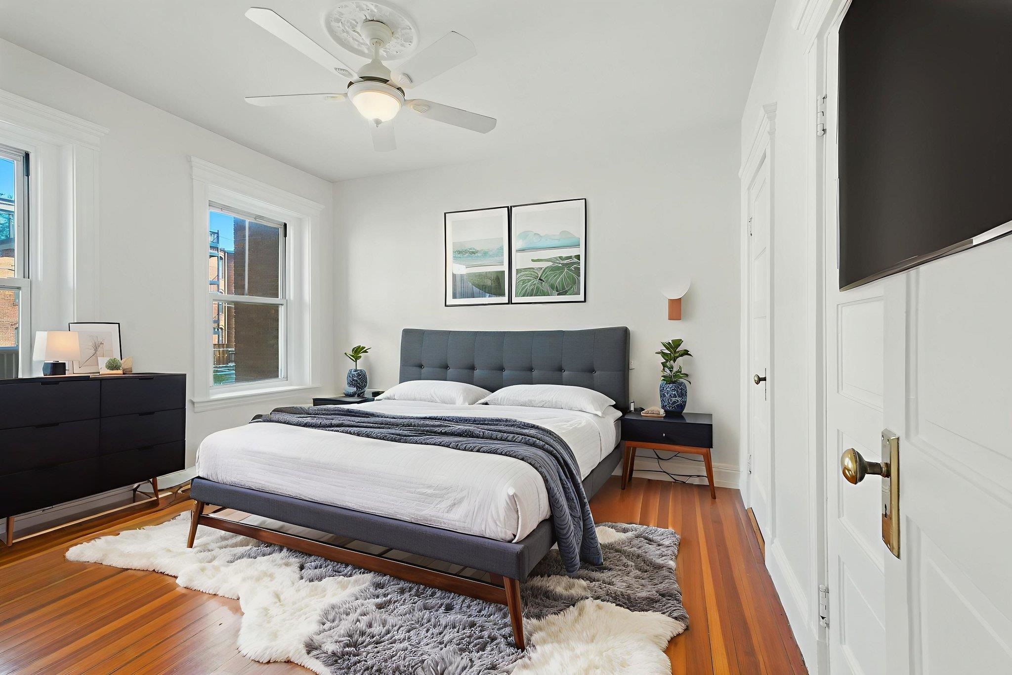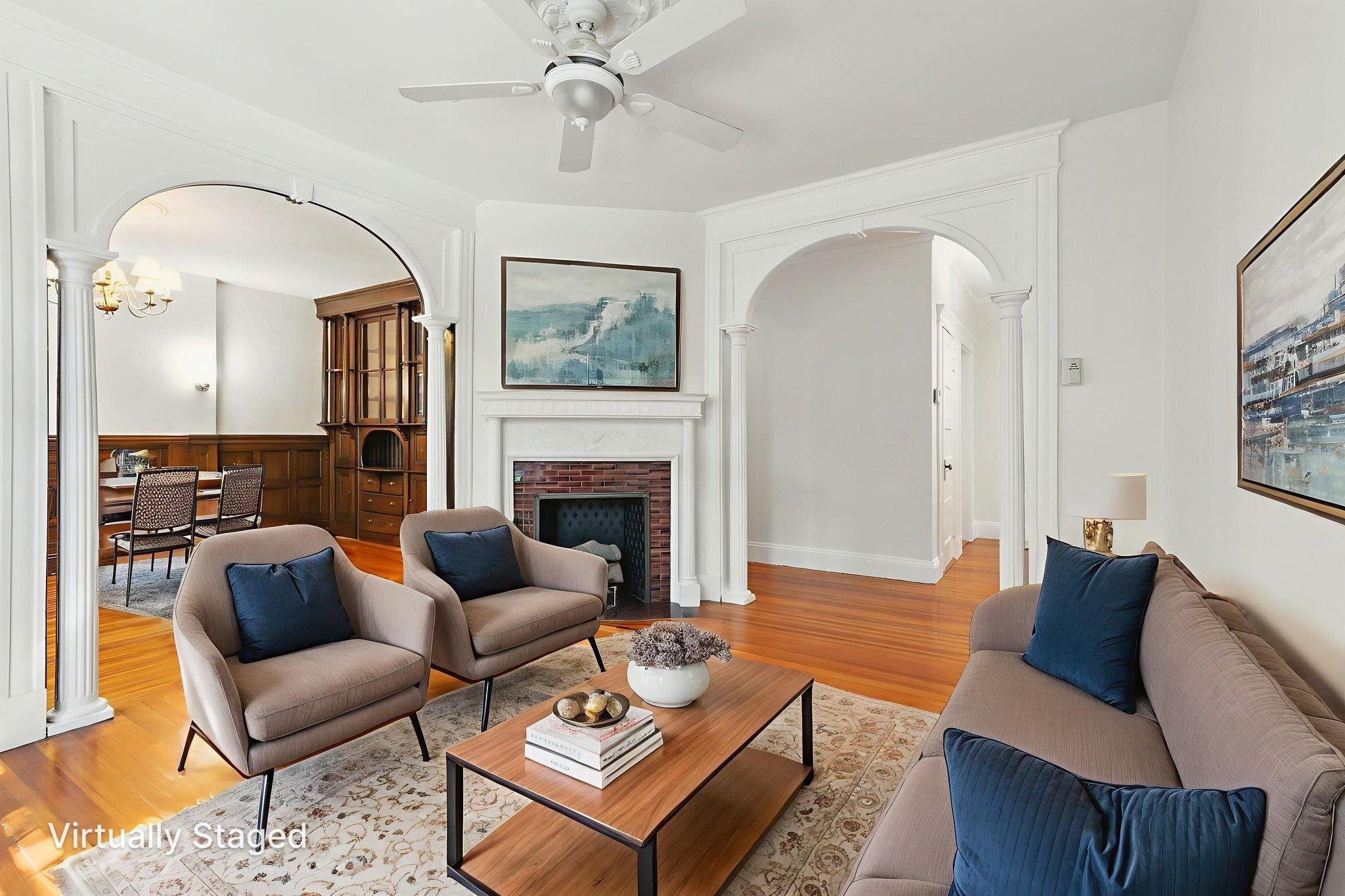 Welcome to this charming second-floor Brownstone condo in the heart of Brookline, MA—perfect for the discerning buyer seeking style, space, and convenience. Step into a marble foyer up to Unit 2 where you'll find beautiful hardwood flooring throughout. This thoughtfully laid-out home features, 3 spacious bedrooms with ample closet space, 1 full bath and an additional 3/4 bath, Laundry area in-unit, bright eat-in kitchen with a walk-in pantry, Formal dining room with built-in and views. Family room with a wood-burning fireplace and window A/C. Private back deck—perfect for relaxing while enjoying stunning sunsets. 2 Tandem Pk Spots. 1 mini split, 2 window ac's. Waldstein Playground & Tennis Club at end of the street. T stop for the B, C, and D lines and #86 Bus to Harvard Sq. Shopping, and restaurants. This home combines classic charm with unbeatable accessibility. Schedule your showing today!