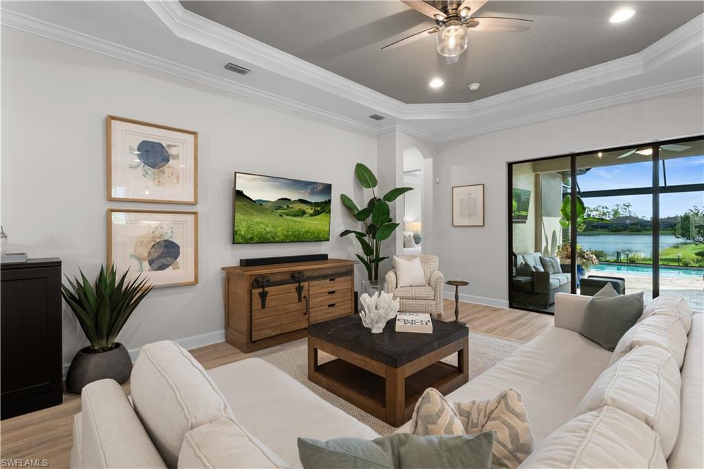 LIVE A VACATION LIFESTYLE IN ESPLANADE! FULL GOLF MEMBERSHIP INCLUDED! This immaculate and well appointed “Lazio” features expansive views overlooking the lake and over $175k IN RECENT UPGRADES! Inside, you will find 3 bedrooms, den, 3 full baths, and just over 2300 sq ft of open concept living space. From the moment you walk in the door, you are greeted with wood floors throughout the common areas & den and two sets of sliding glass doors to the extended lanai complete with custom outdoor kitchen, GAS heated pool with raised spa, picture window screen, motorized roll down hurricane shutters, stained cypress wood ceiling, and lush landscaping. The kitchen is the heart of the home and features shaker style cabinetry, Cambria quartz countertops, pantry with custom shelving, and GE Cafe appliances including a GAS cooktop & wall oven. This home is totally storm ready with a WHOLE HOUSE GENERATOR and complete hurricane protection. Other fine appointments include: BRAND NEW HVAC; BRAND NEW GAS POOL HEATER; plantation shutters on all windows; expanded primary & front guest bedrooms with bay windows; primary suite walk in closet with custom shelving/drawers; hurricane impact front door with matching sidelights; air conditioned extended garage with motorized ceiling storage racks & epoxy floor; freshly painted interior and exterior; spacious Laundry Room with cabinetry; rescreened pool cage (roof/2024); extensive crown molding; updated bathroom light fixtures; tankless GAS hot water heater; 8' doors/10' ceilings; extensive professionally enhanced landscaping with professional landscaping lighting; updated & upgraded bedroom carpet/padding; and more! Esplanade Golf & Country Club of North Naples offers a true “Lifestyle Community” with world-class amenities, including a resort pool with cabanas and the popular “Bahama Bar, ” tennis, pickleball, bocce, a 14-mile network of bike/walking trails, and an 18-hole private golf course. The impressive 15, 000 Sq Ft clubhouse features a restaurant, bar, wine-tasting room, wine lockers, and a Starbucks-style café. Best of all, the property’s landscaping, irrigation, golf membership, and all community amenities are covered under a quarterly fee of just $3, 743—no additional fees or memberships required! Don't miss your opportunity to own this exceptional home in one of Naples’ most sought-after communities. Schedule your tour of this stunning home and Esplanade Golf & Country Club today! COMING SOON TO ESPLANADE (2026): Fully renovated and expanded poolside Bahama Bar; expanded outdoor bar at the Barrel House; expanded golf practice range; and an AIR CONDITIONED INDOOR PICKLEBALL COMPLEX with four indoor courts.