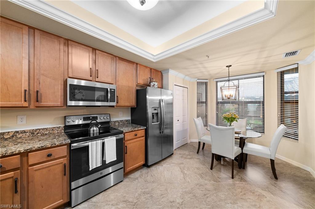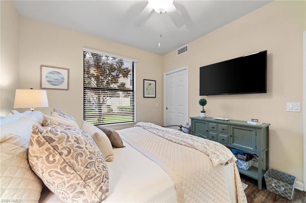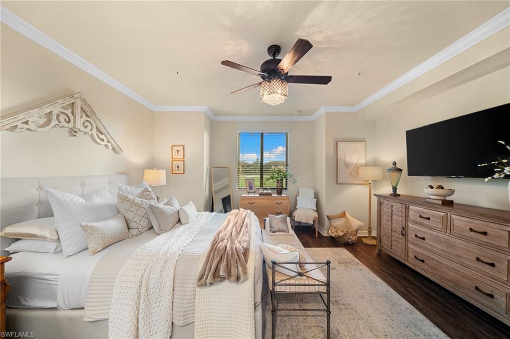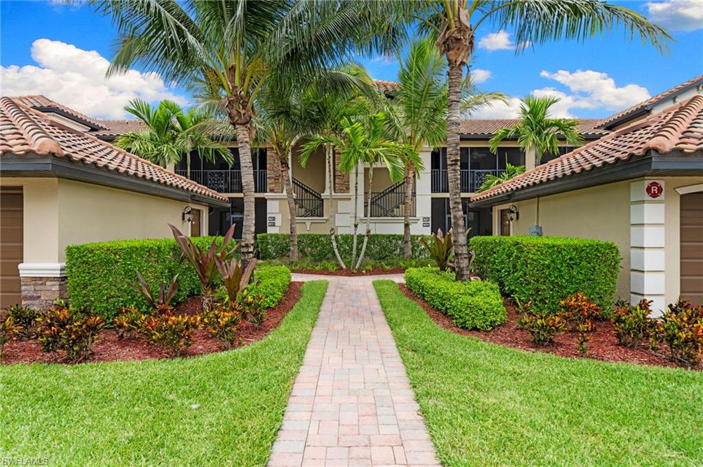 Step into this sought after ground floor, "Arabella" floor plan offering 2 bedrooms plus a den, 2 bathrooms, and a 1 car garage in the resort style community of Bonita National. As an end unit, this veranda home has additional windows and is bathed in natural light, enhancing its open and airy feel. The spacious living area flows seamlessly to a screened lanai with sweeping views of the lush golf course, perfect for enjoying morning coffee or evening sunsets. Thoughtfully upgraded, this home features no carpet for easy maintenance, crown molding, and is being sold partially furnished. Owners may golf unlimited from May - October. Bonita National offers world class amenities, including championship golf, tennis, fitness center, resort pool, multiple dining options and pickleball and bocce are being added soon! All just minutes from the beaches, shopping, dining and airport!