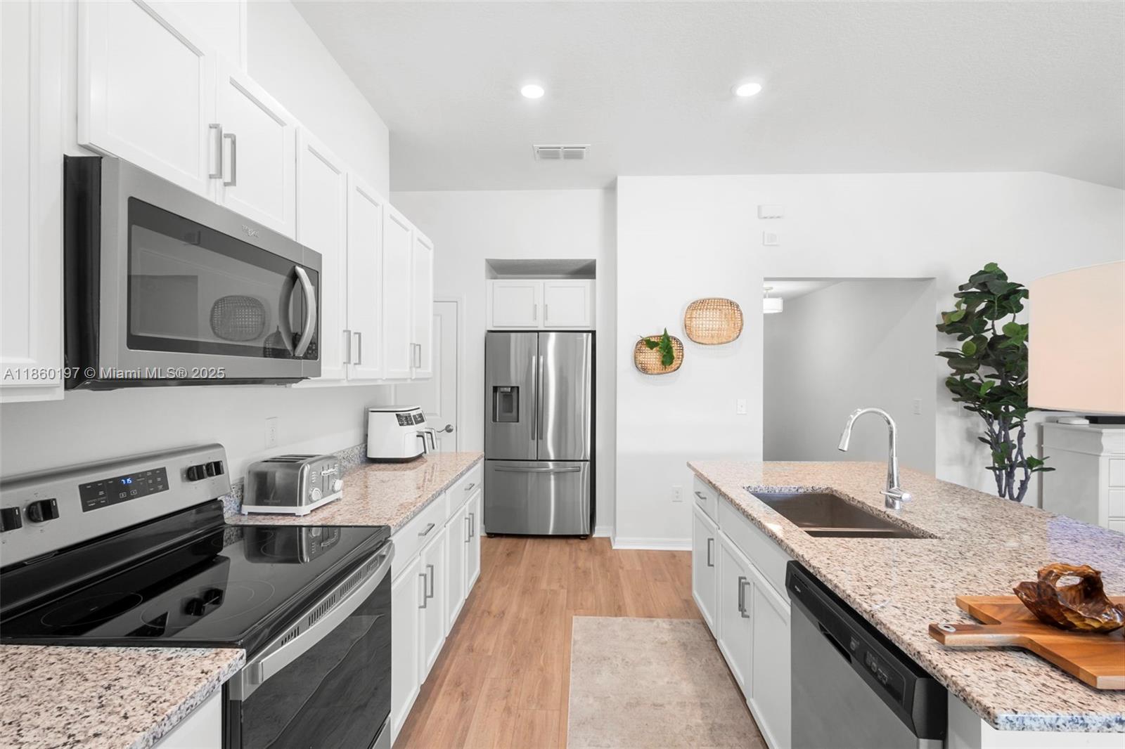 Experience refined living in this elegant 3-bedroom, 2-bathroom residence with a 2-car garage, perfectly situated in the coveted BellaVIVA community of Davenport. This modern home showcases an open-concept design filled with natural light, a gourmet kitchen with sleek cabinetry and premium countertops, and a spacious primary suite featuring double vanities and contemporary finishes. Each bedroom is thoughtfully enhanced with designer wallpaper, creating a unique blend of style and comfort. Residents enjoy access to resort-style amenities including a sparkling pool, scenic walking trails, and lush green spaces—all within a secure, serene neighborhood just minutes from Disney, fine dining, shopping, and top-rated schools. Low HOA $55 twice a year
