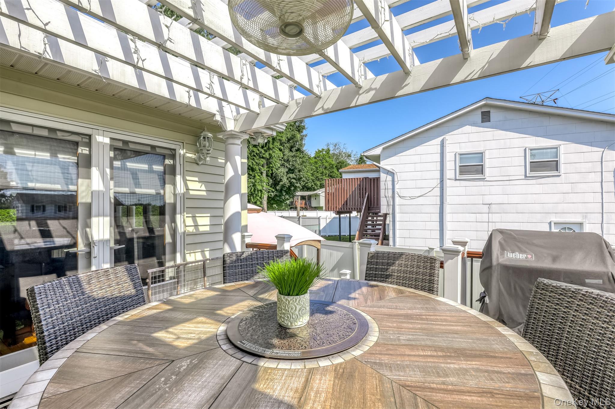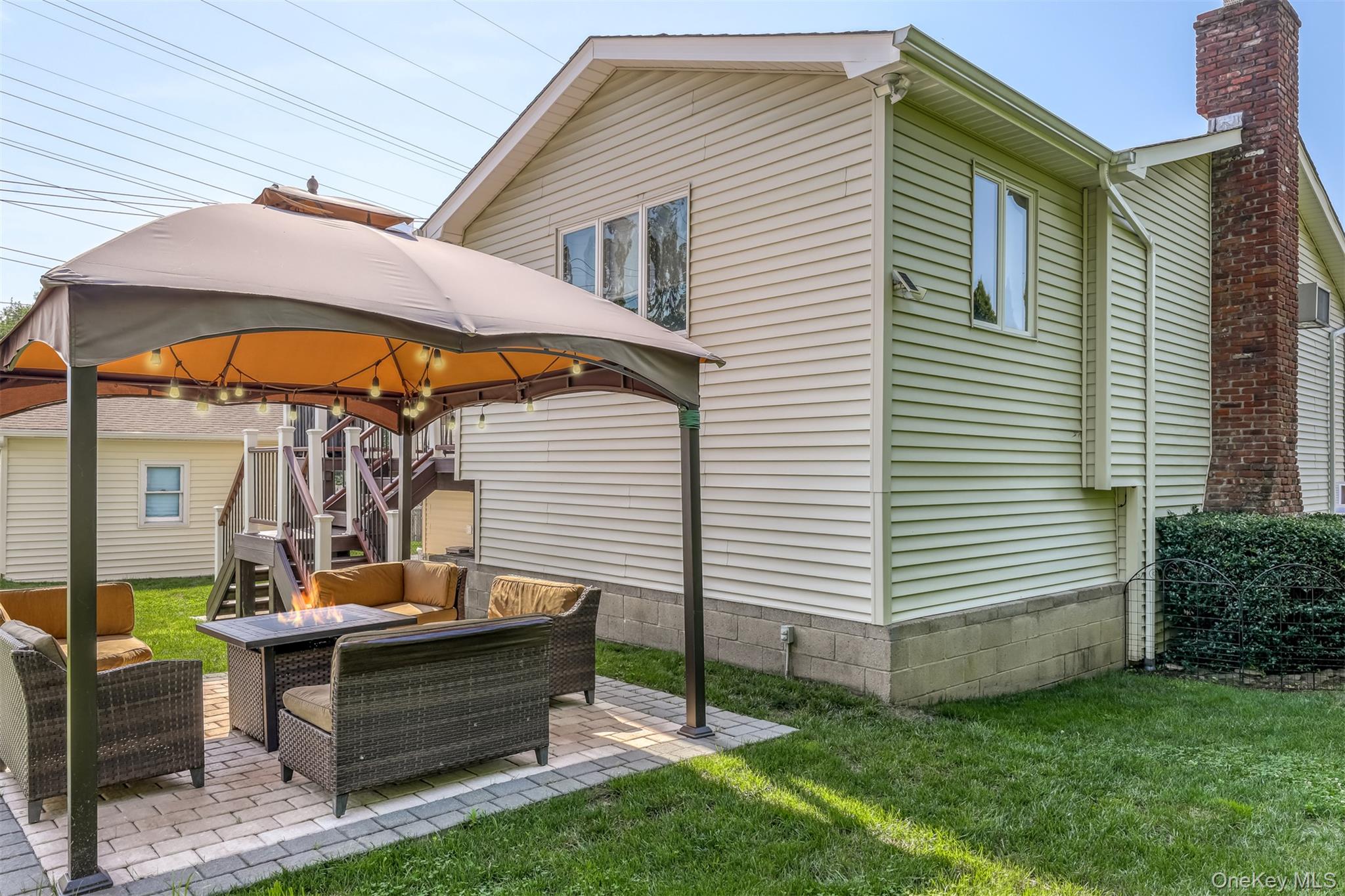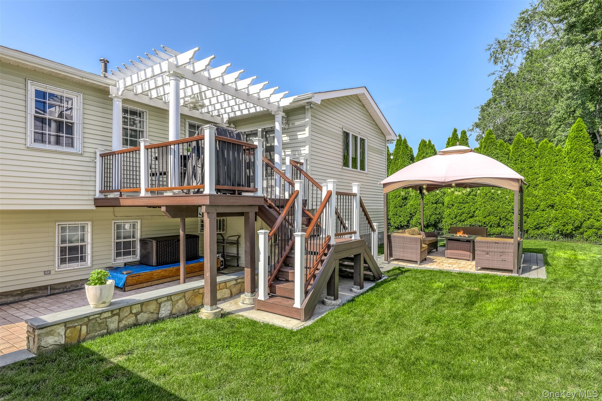 Welcome to this beautifully updated, move in ready, 5 bedroom, 3 bath, Raised Ranch situated on a spacious corner lot. This light-filled home features hardwood floors throughout, crown molding, and an open concept layout ideal for everyday living and entertaining. The designer kitchen boasts granite countertops, stainless steel appliances including a Wolf oven, island with seating, and stylish finishes throughout. A bonus sunroom with doors that lead to a Trex deck, perfect for summer barbeques or relaxing. Downstairs offers a versatile family room with a brick wall and remote controlled gas fireplace, ideal for a cozy retreat, plus a guest suite. All three bathrooms have been recently renovated. Additional highlights include a tankless water heater, new driveway, roof, paver patio, bluestone flower bed, shed (detached with electric), extra storage under the porch, security cameras outside and both a pergola and gazebo included. Don't miss this incredible opportunity!