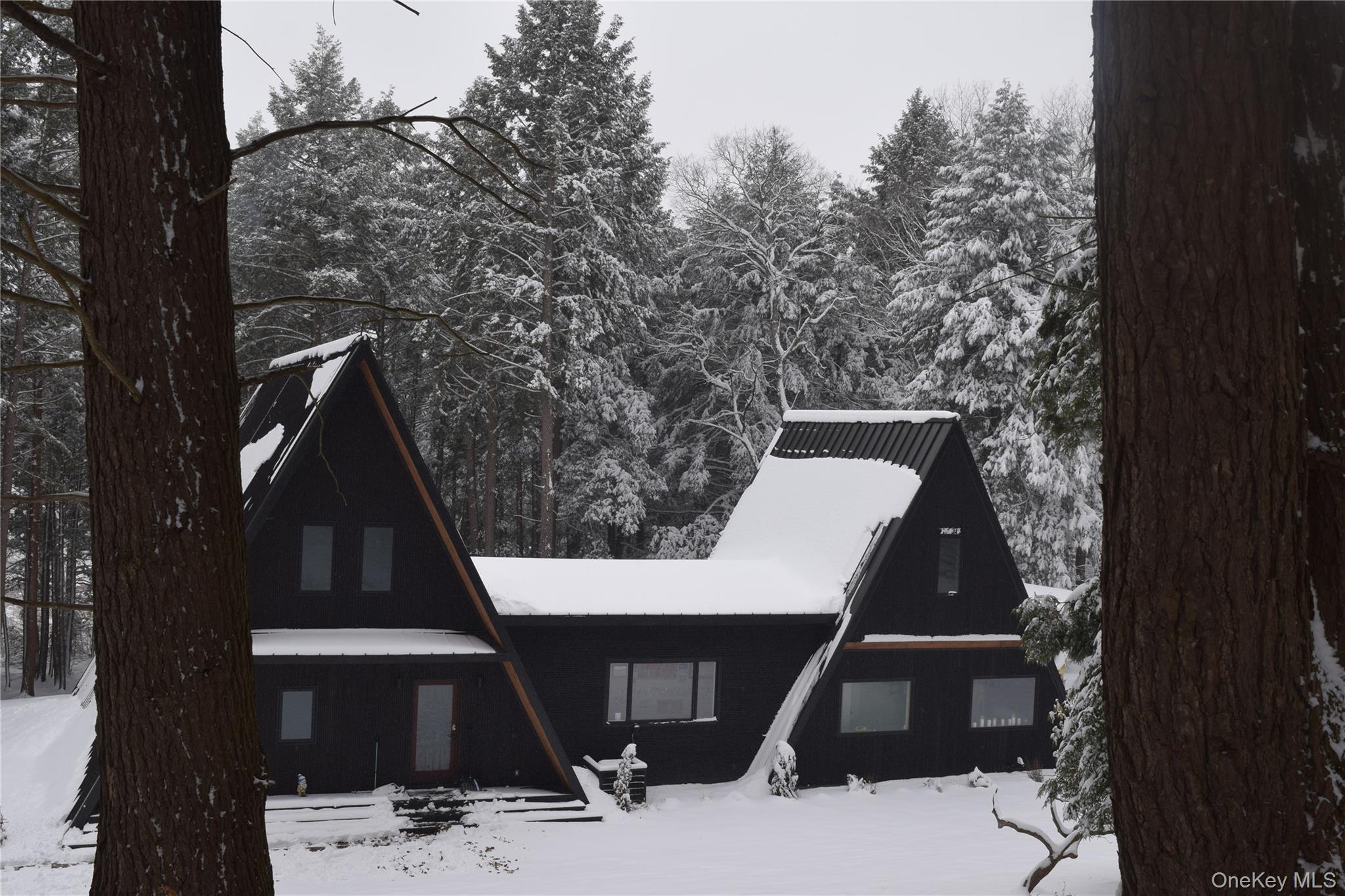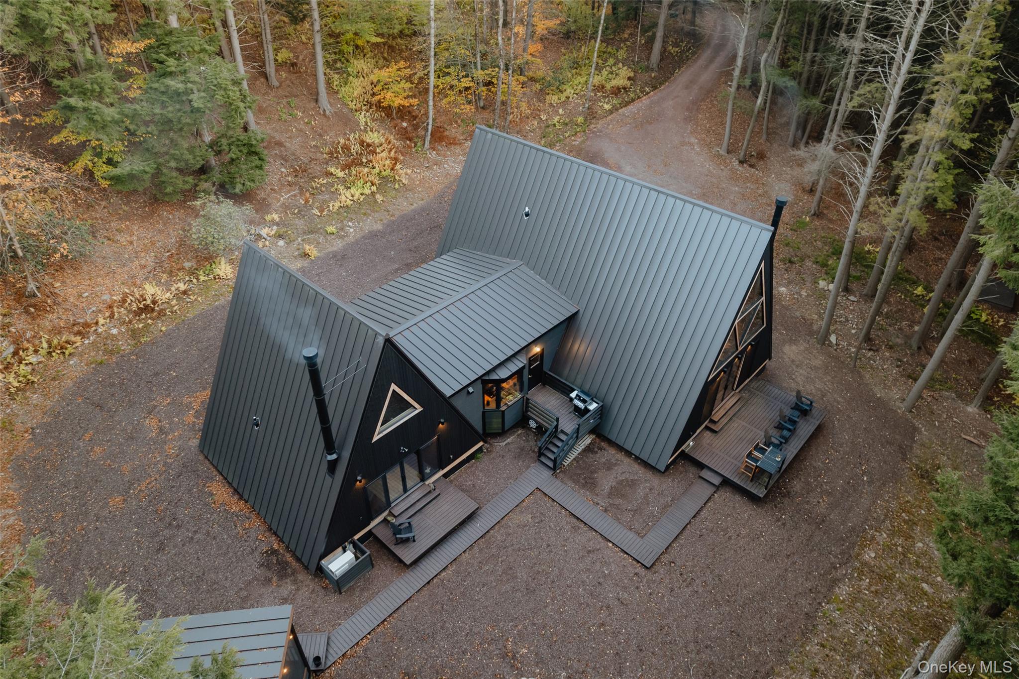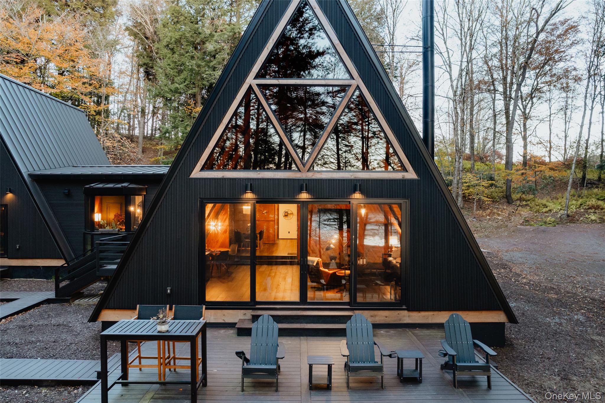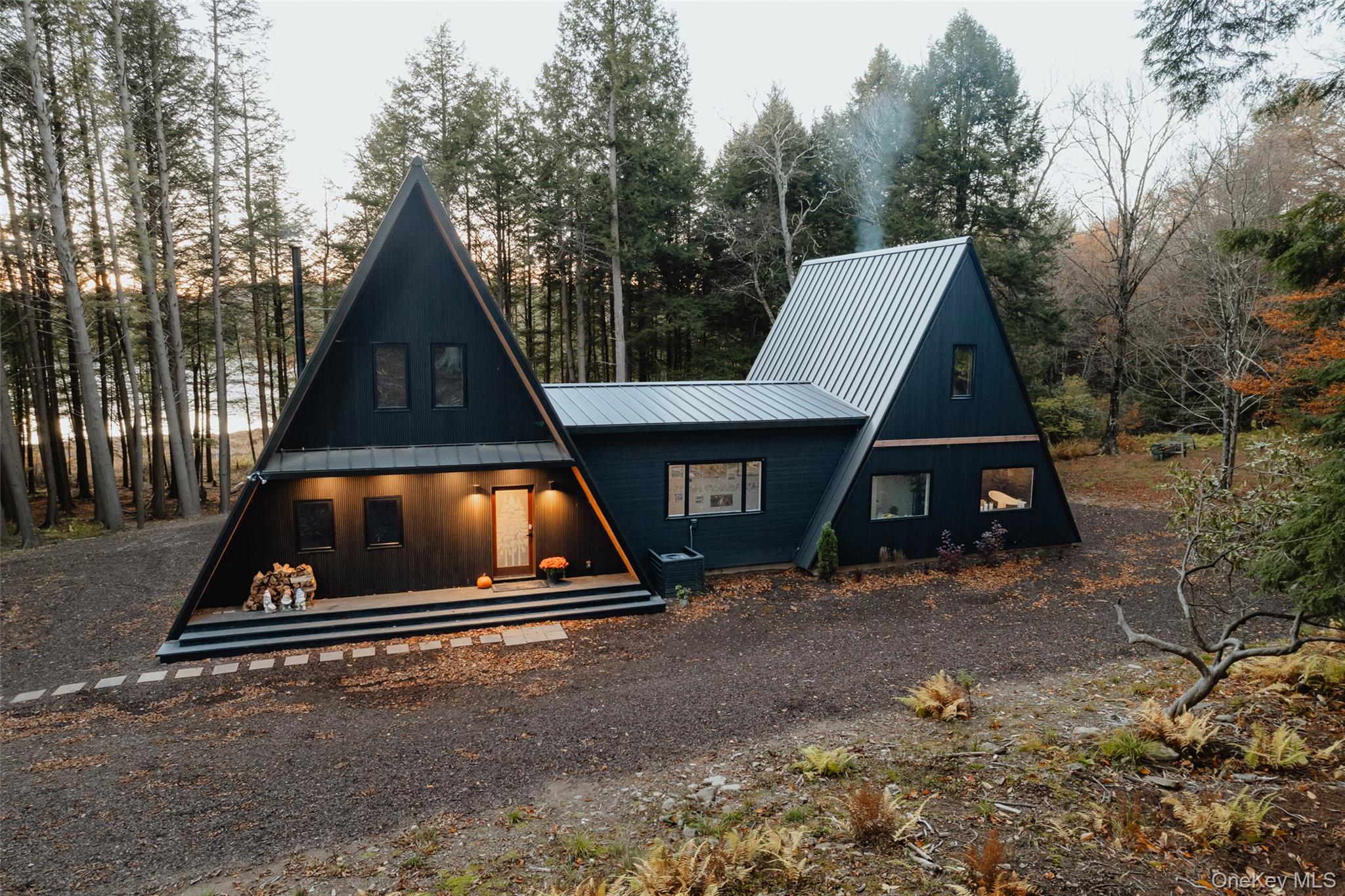 Escape to your own private woodland getaway in this striking double A-frame home, custom-designed by a local builder known for creating spaces rich in character and textures. Nestled on a secluded, lakeview-wooded lot, PerryWood exudes the charm and warmth of a classic A-frame, but delivers the space and comfort of a full-size home with 3 bedrooms and full baths, a chef’s kitchen, 2 dining spaces, loft office, yoga studio, equipped gym, screen room, and two back decks. The large unfinished basement provides opportunity for additional expansion of living space. Built in 2021, Perrywood is offered with most of its furnishings which have been creatively curated to complement its unique design. Two hours from NYC and minutes to Bethel Woods Center for the Performing Arts. This is a lake "view" not lake "front" property-- there is NO RIGHT OF ACCESS to the private lake.