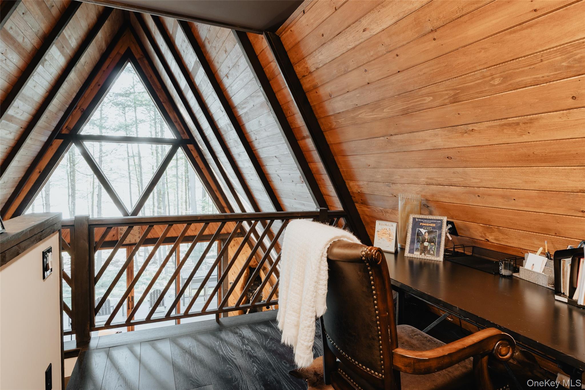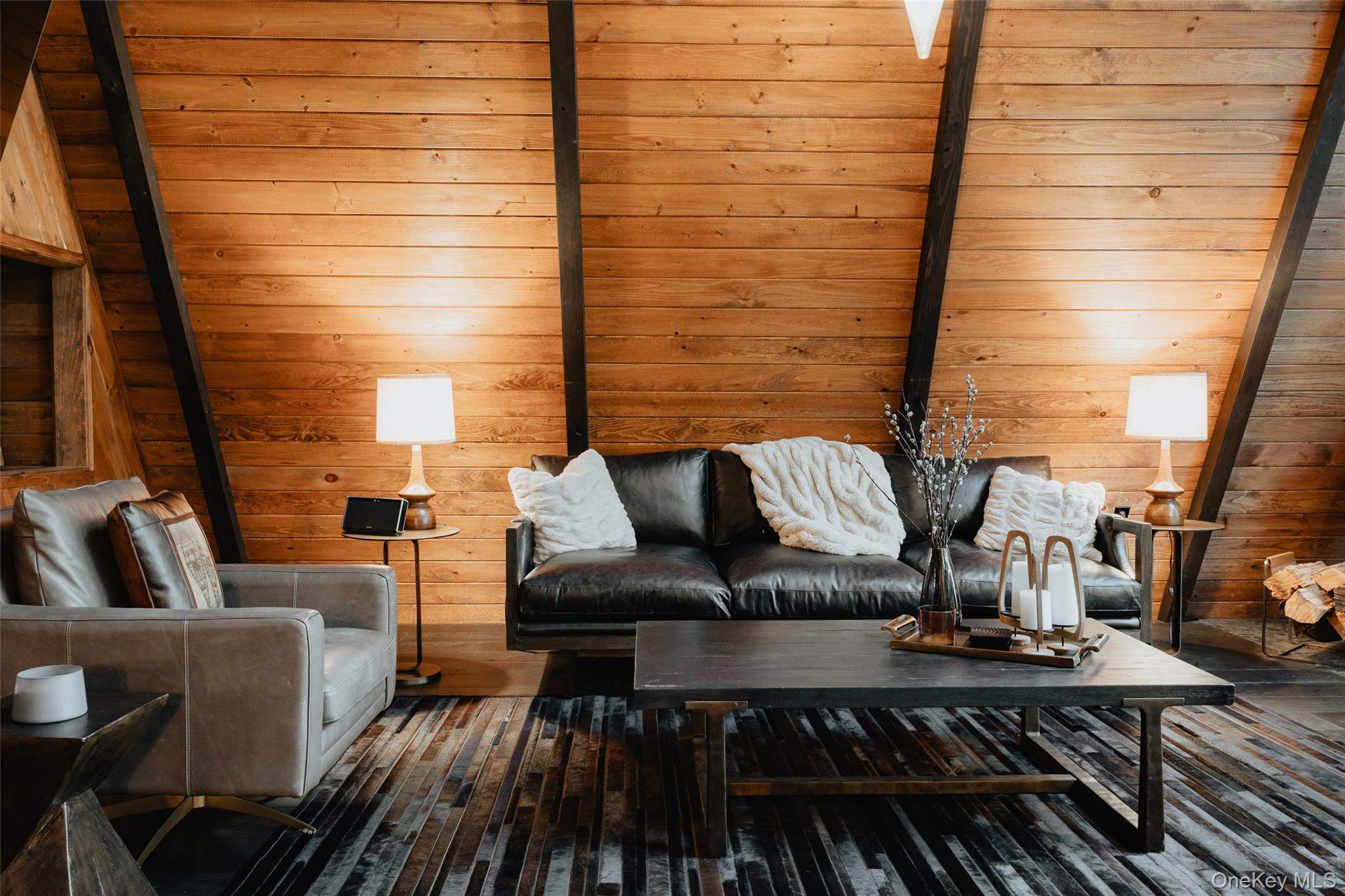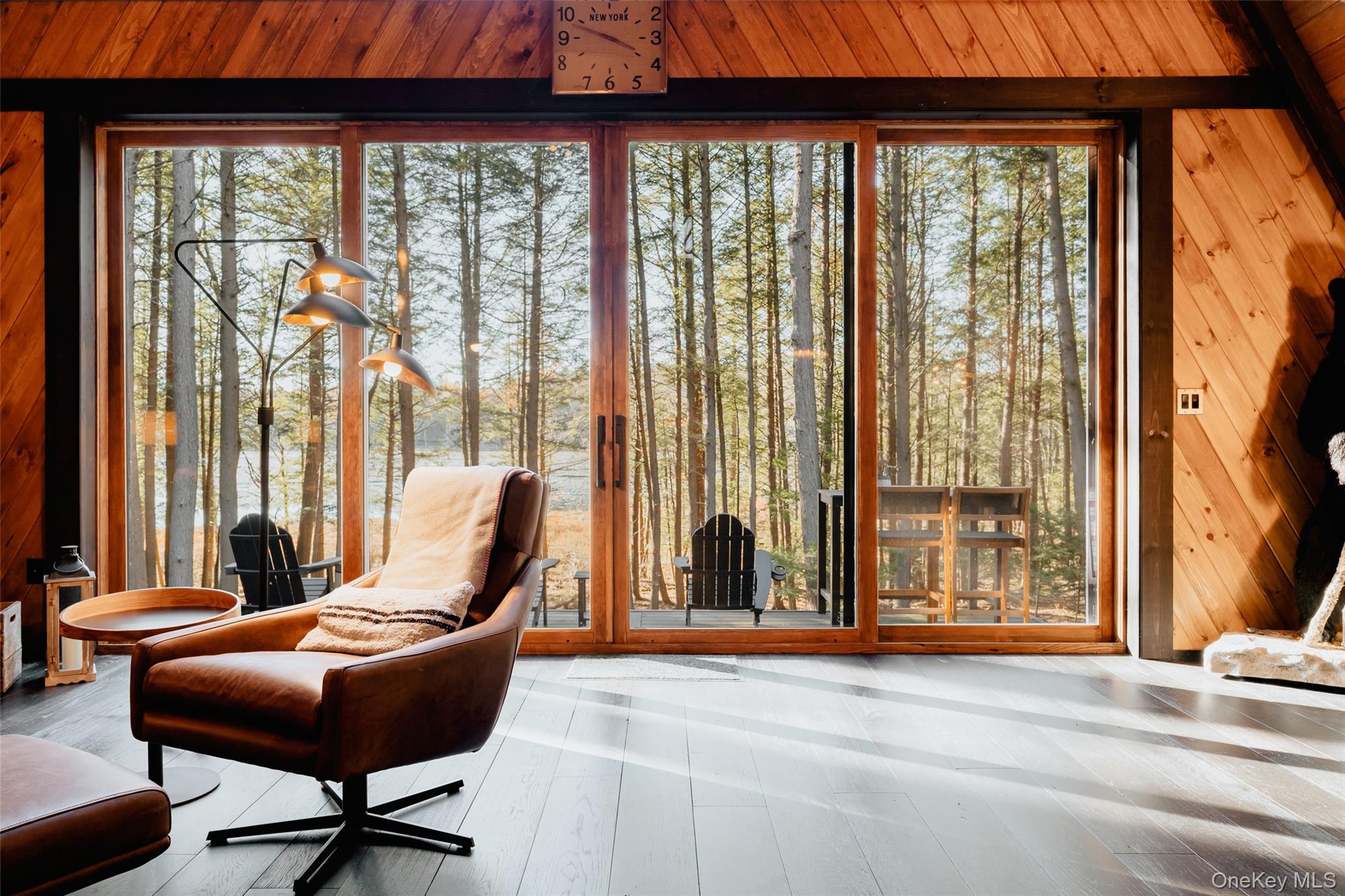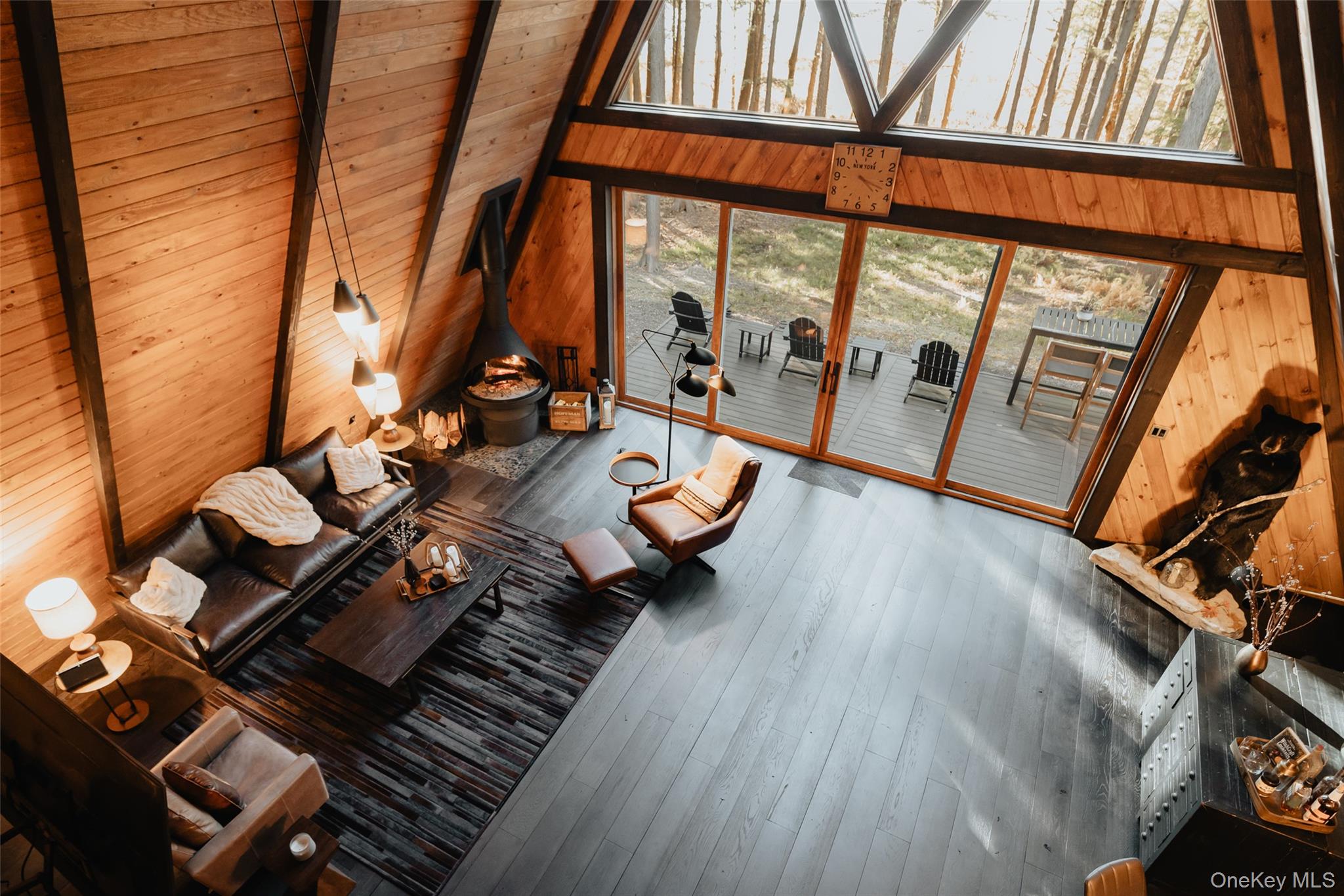 Escape to your own private woodland getaway in this striking double A-frame home, custom-designed by a local builder known for creating spaces rich in character and textures. Nestled on a secluded, lakeview-wooded lot, PerryWood exudes the charm and warmth of a classic A-frame, but delivers the space and comfort of a full-size home with 3 bedrooms and full baths, a chef’s kitchen, 2 dining spaces, loft office, yoga studio, equipped gym, screen room, and two back decks. The large unfinished basement provides opportunity for additional expansion of living space. Built in 2021, Perrywood is offered with most of its furnishings which have been creatively curated to complement its unique design. Two hours from NYC and minutes to Bethel Woods Center for the Performing Arts. This is a lake "view" not lake "front" property-- there is NO RIGHT OF ACCESS to the private lake.