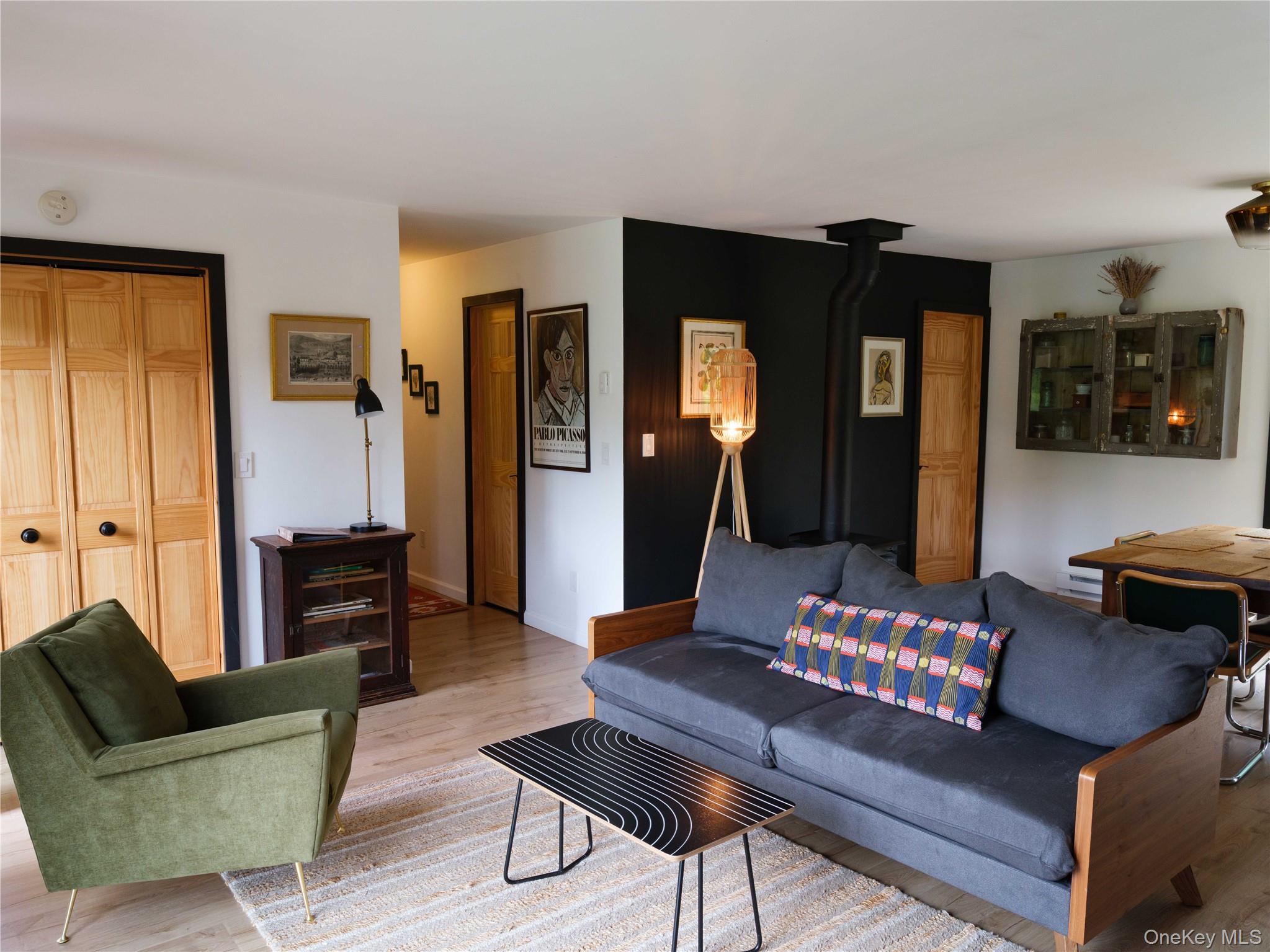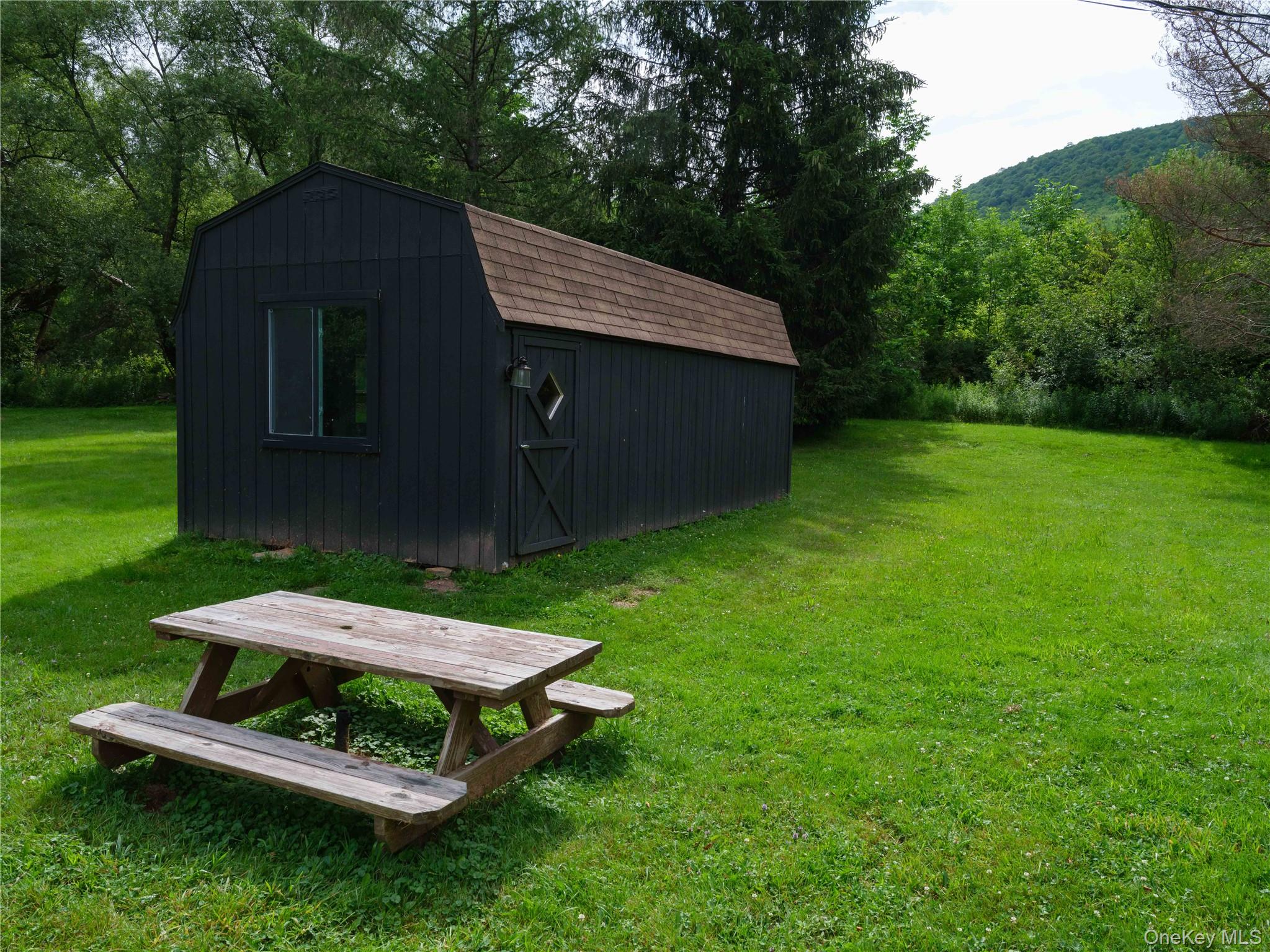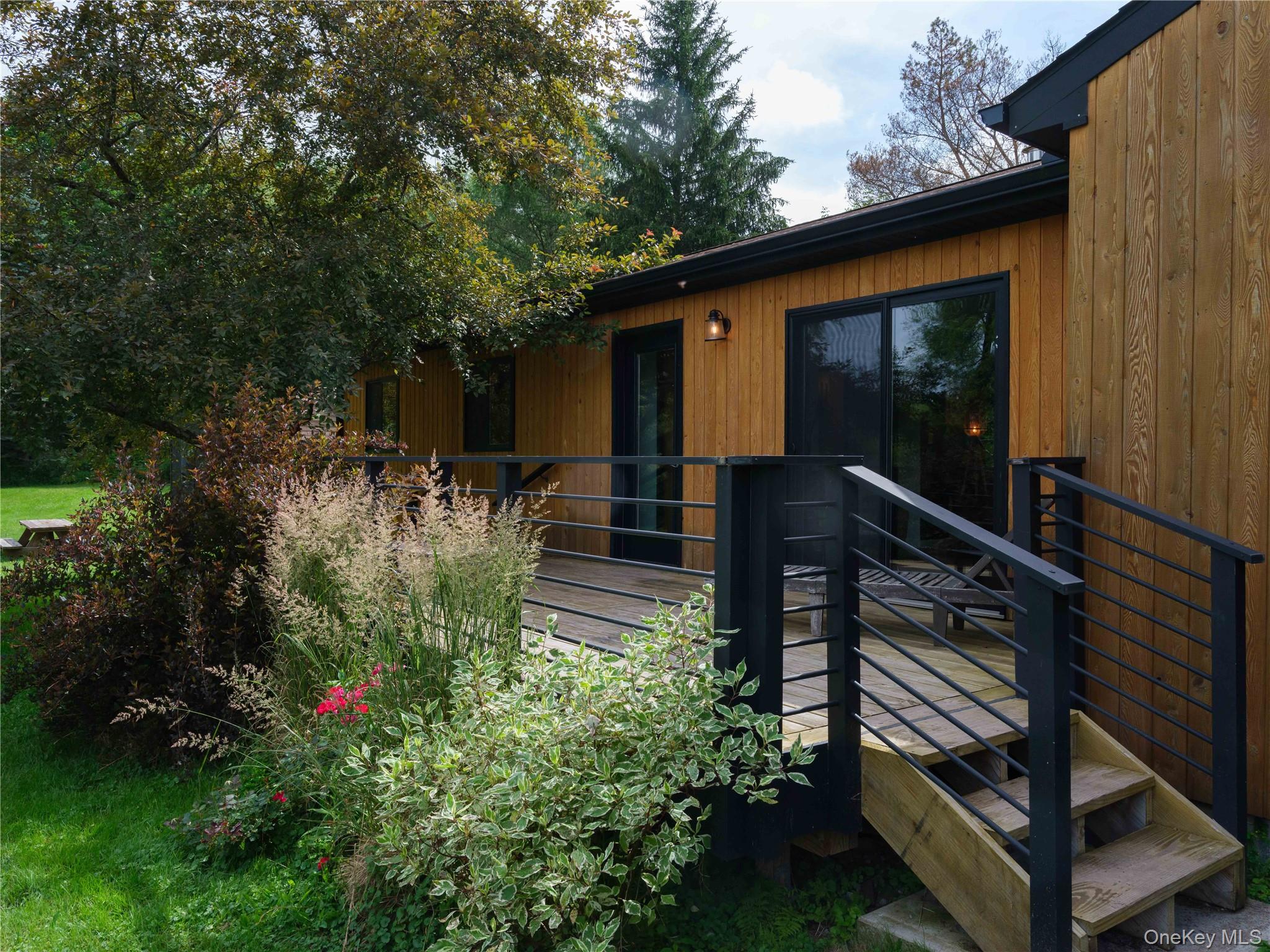 The Andes ‘Hemlock House’ is a renovated ranch-style home with Hemlock wood siding. It’s a tranquil and peaceful park-like setting for a home or a successful turn-key short-term rental property in the Catskills. The stylish décor has the perfect balance of modern and antique elements. The home has 3 bedrooms, 1 full bathroom with full-size tub and an airy open-floor plan: living room, Scandinavian-style kitchen and dining area. The Osburn woodstove makes a cozy home. The utility room with laundry is adjacent to the dining area. The light-filled rooms and layout allow an expansive viewshed of the property. The kitchen and dining area open onto a back deck that fits a table for four and has views of the verdure back gardens. The other deck is at the front entrance and is spacious enough for relaxing on wooden loungers. You’ll hear bullfrogs from the pond and many native birds; you may see the majestic Great Blue Heron, who has been seen flying from the pond. PARCEL: The home is setback and is on the 1. 7 acres. There is a private front view of the pond, creeks and a lawn area perfect for outdoor play and relaxation. There are many tree specimens including a small apple orchard. OUTBUILDINGS: an office shed + an utility shed. The office shed is a light-filled office space with heating, and it can accommodate two workstations. It’s ideal for remote work or could be transformed into a quiet meditative space for yoga or a cardio-pumping exercise area. The office shed is located steps away from the main house and surrounded by gardens and trees. The utility shed is near the 2-car garage and a perfect size for garden supplies and more. The attached garage is a 2-car bay with electricity and has a landing and a few steps to the kitchen. ANDES: Located just minutes from the Village of Andes with amenities: grocery, antique store, galleries, restaurants, coffee shop, tap room, swimming pool, tennis courts, yoga, and Tompkins Falls. Andes Historic District is listed on the National Register of Historic Places. Andes is located between Margaretville and Delhi in Delaware County. OUTDOORS: Hiking and camping in the Catskill Park, a part of New York’s Forest Preserve; Cycling includes the Catskill Scenic Trail; and 5 main downhill ski and snowboard areas are in the Catskills (25 minutes to Belleayre Mountain). BUS & CAR: 20 minute walk to the NYC bus stop and 2. 5 hour drive to George Washington Bridge.