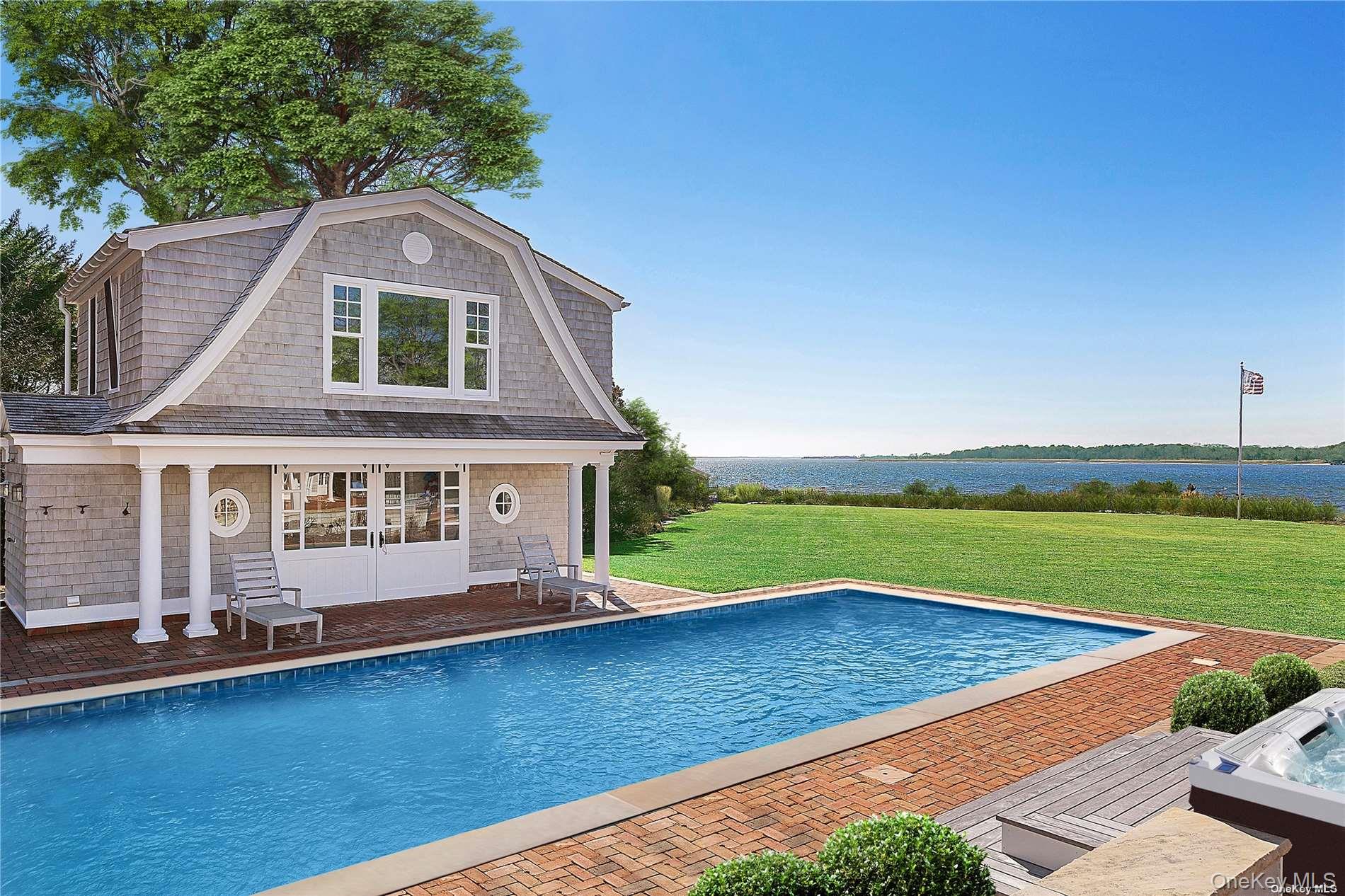 This majestic, one-of-a-kind estate is set on 4+ private, resort-like acres in the Town of Southampton. Its unique location on the southwest-facing waterfront provides incredible sunset views over Seatuck Cove and Moriches Bay from large windows throughout the bright, airy main residence. Perfect for entertaining, the meticulously updated 9-bedroom, 9. 5-bath main home features a chef's kitchen with granite countertops, Wolf stove, dual ovens and dishwashers, and a 17-foot island. There's a living room with a built-in bar and wood-burning fireplace, a dining room, family room, handsome library and sunroom with wood-burning fireplaces, and a temperature-controlled wine cellar; and French doors lead to an ample patio overlooking the water. The primary bedroom has dual closets, custom built-ins, a bathroom with radiant floor and dual vanities, and a porch with sweeping water views. A former 19th century hunting lodge, the home blends old world charm with modern-day amenities, including an elevator and state-of-the-art mechanical systems, and features a porte cochere for shelter when getting in and out of vehicles. The sprawling property, which is bordered by tall perimeter trees and accessed through a gated entrance, includes a four-bedroom guest house with full kitchen; a detached five-car garage with commercial-grade hydraulic car lifts; a charming, refurbished, old-fashioned windmill; and a pool house with sauna, and gym overlooking the 45x20 heated saltwater gunite pool. A sweeping, lush lawn extends down to 234 feet of waterfront, where there are docks, a sandy beach and a boathouse. Har-tru tennis courts complete the country club experience. There's little reason to ever leave!