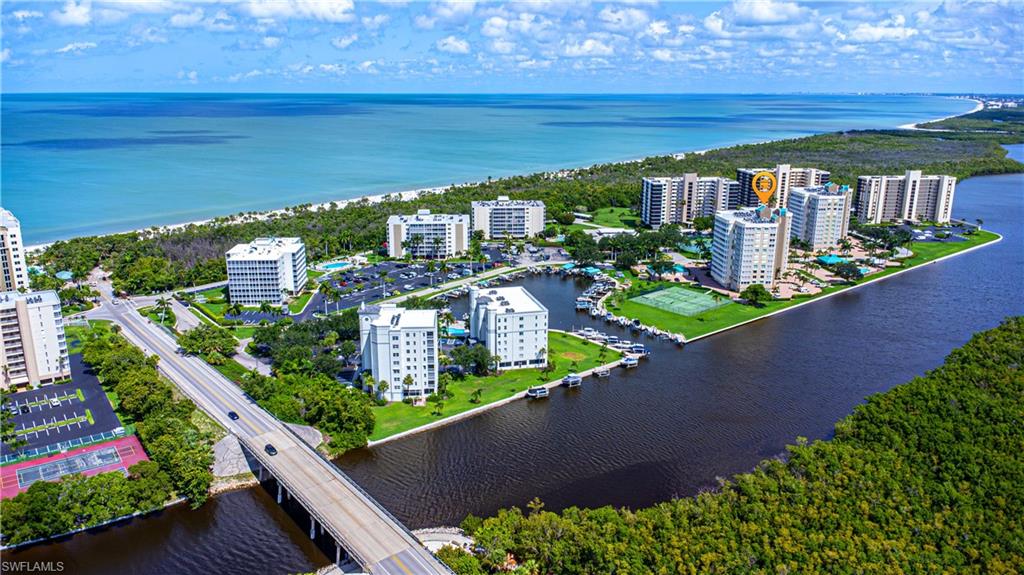 AVAILABLE FEB 2026. Amazing views from this end unit located directly on the Vanderbilt channel - something is always happening, whether it be the boats going out to the gulf or the dolphins and manatees swimming by, not to mention a good sunset at the end of the day. Gulf Breeze is located in a gated community and secure building offering waterfront condos on the bay with views of the Gulf of Mexico. Naturally light and bright with an abundance of windows and sliding doors, 2 lanai's, completely refurnished and painted - this unit has never been a rental. Secondary bedroom has 2 twin beds and the master bedroom is a king. Just a short walk to Delnor Wiggins and Vanderbilt Beach. Gulf Breeze has an active social agenda. Tennis, pickleball and bocce sports court, heated swimming pool, car wash and large parking lot for your guests. The Shops at Mercato are a mile away and include shopping, dining, nightlife, Whole Foods. Waterside shops are 3 miles away and Olde Naples approximately 9 miles. 20 minutes from the airport and onto the pure white sand that edges the turpuoise water of the Gulf of Mexico.