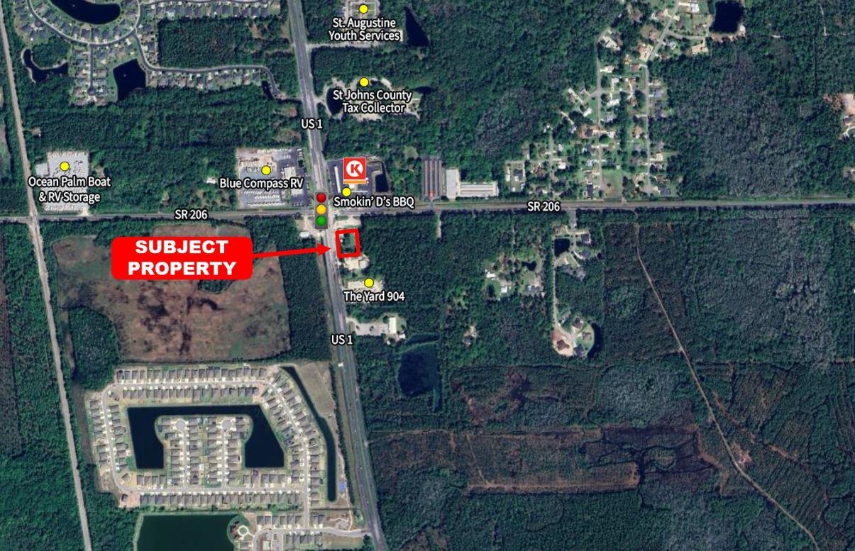 Property Description: Prime Commercial Opportunity at High-Traffic Signalized Corner! Located at the bustling intersection of State Road 206 E and US 1 South in the thriving Dupont Center area of southern St. Johns County, this commercially zoned (CG) property offers unmatched visibility and access. Strategic Location: Front and center for daily commuter traffic between Palm Coast and St. Augustine. A major route for travelers from Gainesville, Ocala, and Putnam County heading to St. Augustine Beach and Crescent Beach. Directly across from busy retail anchors Circle K and the popular Smokin’ D’s BBQ. High Growth, High Traffic: With continued population growth in the Palm Coast region and increasing tourism to nearby beach destinations, this location is positioned for explosive traffic volume growth—making it an ideal spot for future development or a high-visibility business. Investment Highlights: Zoning: CG (Commercial General). Current Income: $60, 000 annually (6-month lease). Flexible Use: Maintain as income-producing or redevelop for retail, office, or service use. Daily Traffic Counts at this intersections: US 1 N. @ State Rd. 206 = 24, 500. US 1 S. @ State Rd. 206 = 17, 000. State Rd. 206 E. @ US 1 S. = 12, 500. State Rd. 206 W. @ US 1 S. = 9, 400. PLEASE DO NOT APPROACH THE TENANTS.