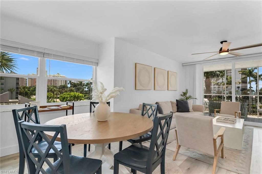 Rarely available and completely renovated, this bright corner three-bedroom residence offers the ideal South End Marco Island location just two blocks (. 25 miles) to the famed crescent beach! With southern exposure and quick access to the South Beach entrance, you can leave your car in the covered carport, grab your chairs and beach toys from the private storage, and be on the sand in minutes. A prime investment or second home, this property combines modern finishes with desirable amenities in one of Marco’s most convenient neighborhoods. The spacious layout features a private open lanai by the entrance, impact doors and windows, electric shutters and manual shutters, and a screened lanai for covered outdoor living. Inside, wood-look laminate tile flooring extends throughout the entire residence. The kitchen showcases white cabinetry, a tile backsplash, recessed lighting, a bar counter with seating, a window above the sink, and newer stainless steel appliances, including a range, microwave, dishwasher, and refrigerator with icemaker. An adjacent dining area opens to the living room, which flows seamlessly to the lanai. The owner’s suite features an en-suite bath with dual quartz vanities, a frameless glass walk-in shower, and a walk-in closet with shelving. Two guest bedrooms with modern ceiling fans share a bath with a shower-tub combo and glass enclosure. A newer Whirlpool washer and dryer complete the home. Perfectly positioned on the south side of the building closest to the pool, this residence places you near Marco Walk’s dining, shops, entertainment, movie theater, and mini golf. Community amenities include a heated pool bathed in all-day sun, tennis, pickleball, BBQ areas, bike storage, and elevator access. Investors will appreciate the weekly rental policy, a recent engineer’s study for peace of mind, and HOA fees that cover cable, internet, water, and public insurance. This meticulously maintained community makes island living effortless.
