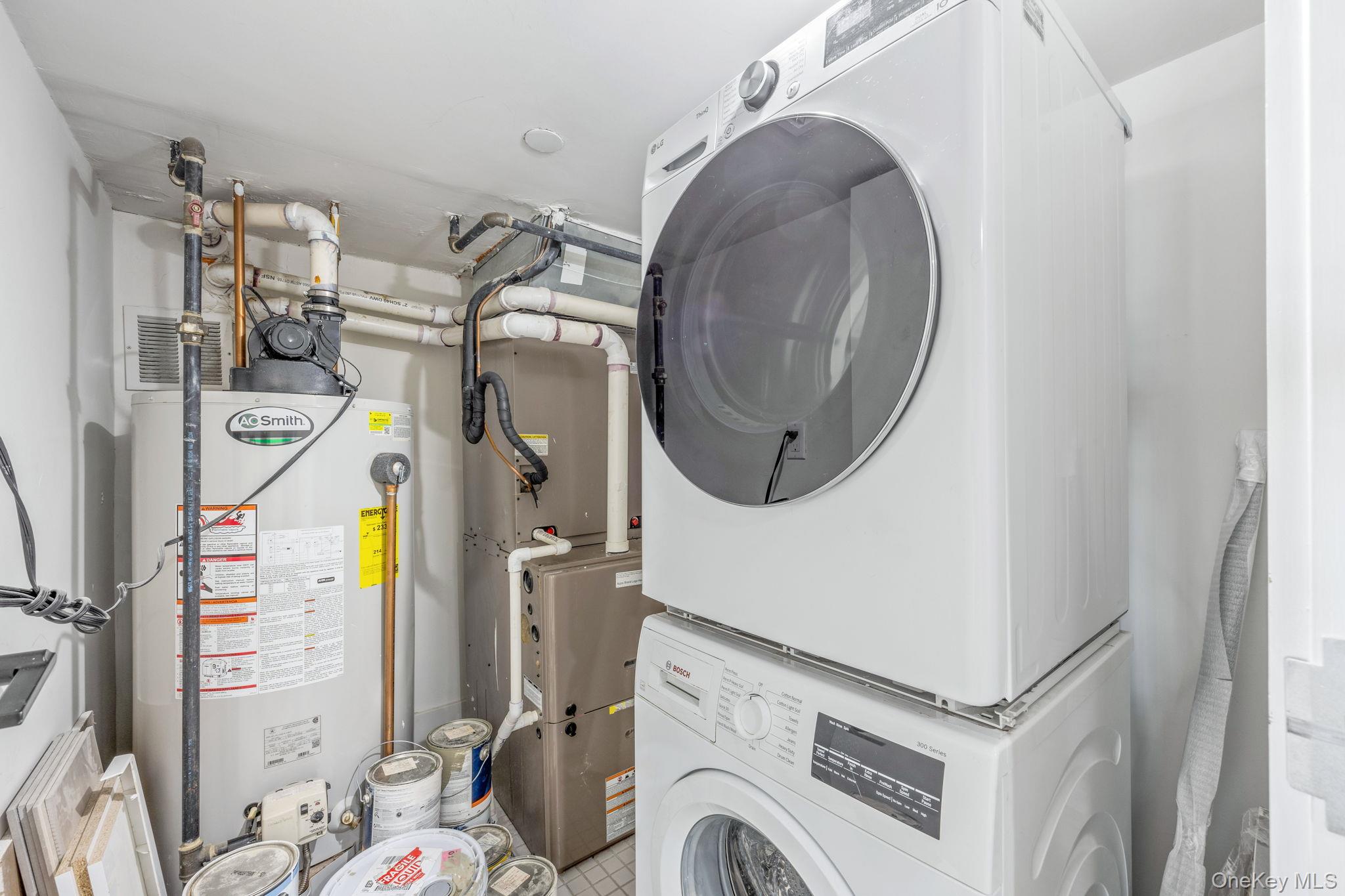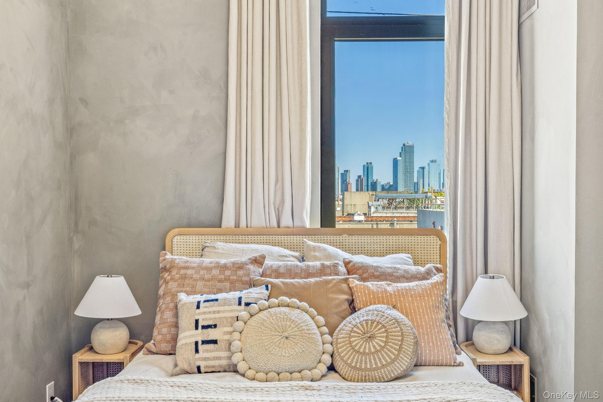 Exceptional 1BR/2BTH + Office Duplex Condo in Greenpoint! This sun-filled 1BR/2BTH condo is a thoughtfully reimagined duplex where modern luxury meets custom design in the heart of Greenpoint. This unit offers soaring 14-foot ceilings, curated finishes, and an effortless blend of style and functionality, all within a boutique 7-unit condominium. Step inside through a foyer accented with shiplap detailing and custom hooks, leading into a chef’s kitchen outfitted with Miele and Bosch stainless steel appliances, quartz countertops, and soft-close cabinetry with a stone backsplash. Just off the entry, two oversized closets provide abundant storage. The spacious living room boasts new ceiling boards, custom built-in library shelving, and striking board-and-batten millwork across every wall. From here, step onto your private balcony with open skyline views, perfect for morning coffee or evening unwinding. The bedroom has been freshly painted in a sophisticated Forrest Green limewash, complemented by all-new millwork in the massive closet, blackout curtains, and a woven statement light fixture. The main bathroom offers spa-like tranquility with a deep soaking tub, bidet toilet seat with remote, and integrated Bluetooth speaker lighting. Upstairs, discover a versatile office/guest room with designer touches: full board-and-batten walls, wallpapered ceiling, and a shiplap accent wall. The second bathroom features a rainfall shower with body jets and Bluetooth speaker lighting. A dedicated laundry room with washer/dryer sits conveniently next to the bathroom, providing modern comfort and practicality. Additional highlights include: - Upstairs office can also be a flex second bedroom or guest room - Low common charges of only $492/mth - Brand new HVAC condenser controlled by Nest - ButterflyMX video intercom system with smartphone access - Thoughtful lighting throughout, including illuminated stairwell - Common rooftop deck with panoramic skyline views and a stunning vantage of the Kosciuszko Bridge With its flawless renovations, boutique setting, and rooftop amenities, this condo is a true turnkey home in one of Brooklyn’s most vibrant neighborhoods. *Disclaimer: All Information provided is deemed reliable but is not guaranteed and should be independently verified.