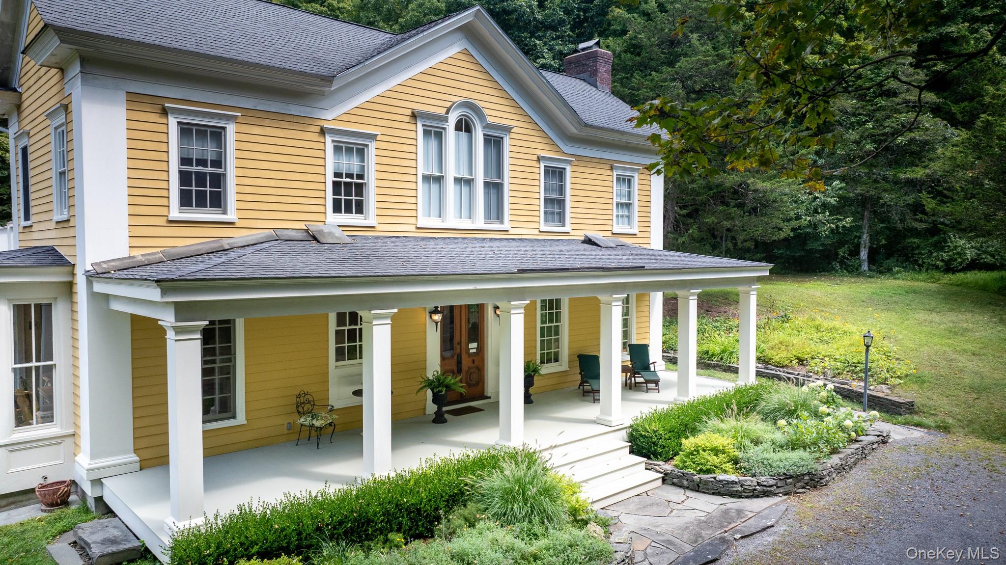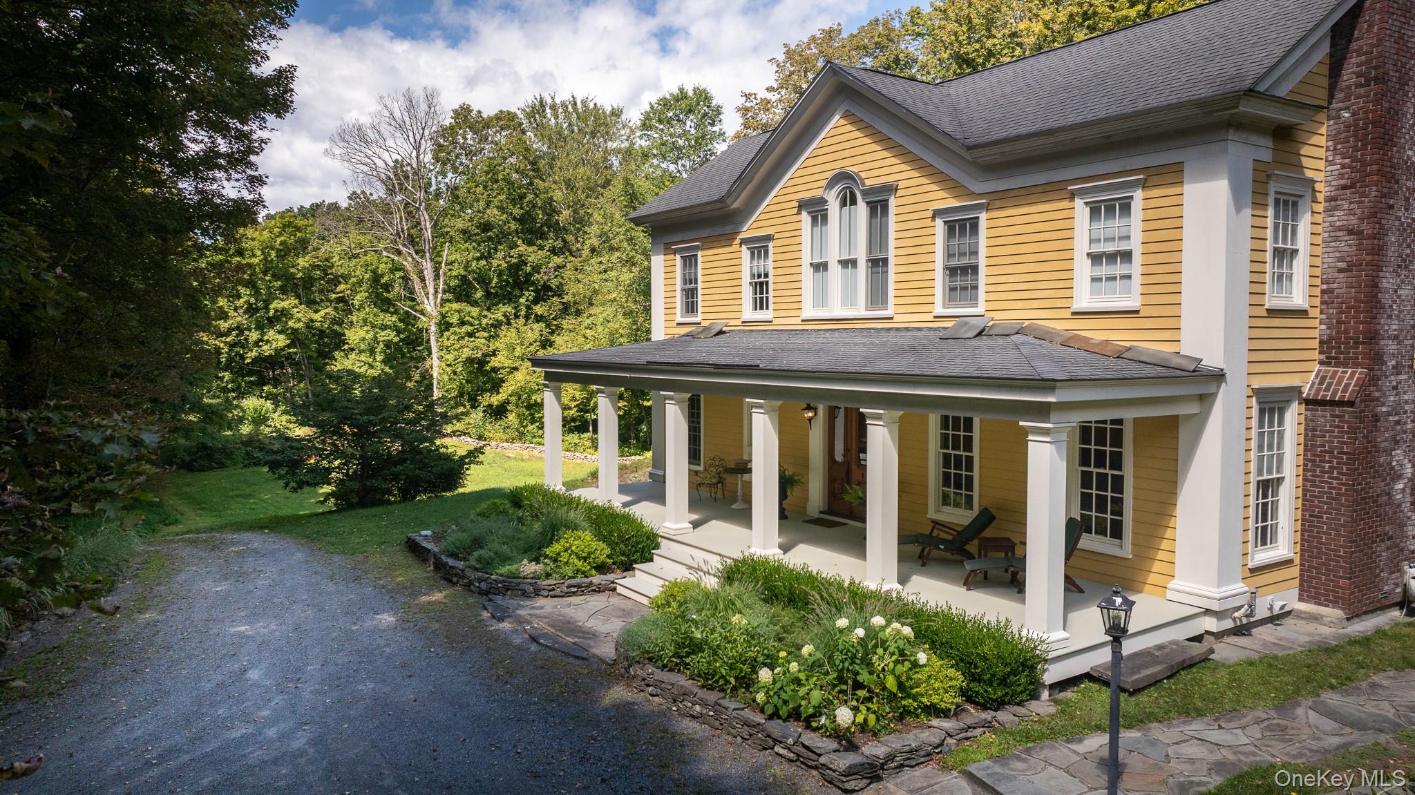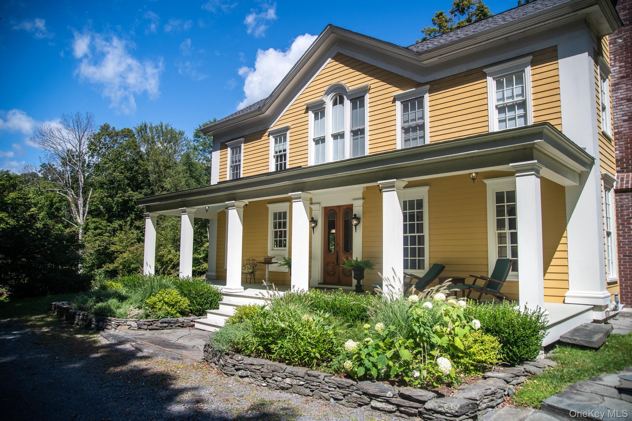 The Taj is a Hudson Valley Reverse Gabled Farmhouse and tucked away like a secret waiting to be revealed. Evocative of the early 19th century with timeless grace. A winding approach meanders through old-growth trees and stone walls. The drive ends in a roundabout that frames the home’s stately exterior. Greeted with an inviting, long, wide porch supported by six elegant columns. A vast field stretches beside the house, offering many possibilities. The interiors exude spaciousness with soaring ceilings and a gracious entry foyer. The thoughtful layout features east and west wings, creating an open flow between living and dining areas, anchored by a unique Rumford wood-burning fireplace. Energy-efficient mechanicals ensure lasting performance, while modern appliances, a first-floor bedroom, and bath offer convenience without compromise. Located near the Parkway, Rhinebeck, Red Hook, and the Amtrak train station.