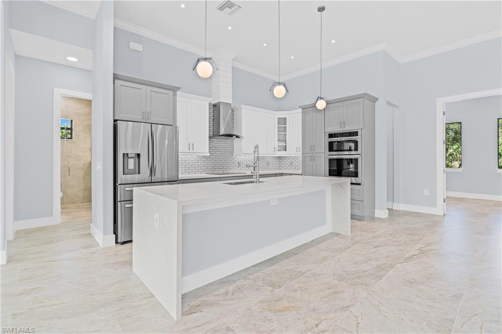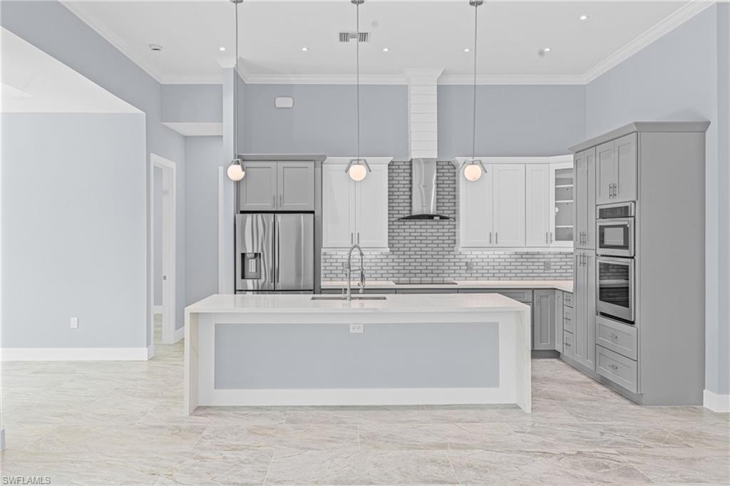 A chef’s dream, the kitchen features custom wood cabinetry, quartz countertops with a stunning waterfall island, a mix of white and gray cabinetry, under cabinet lighting, and high-end built-in appliances including a wall-mounted oven/microwave and range hood.