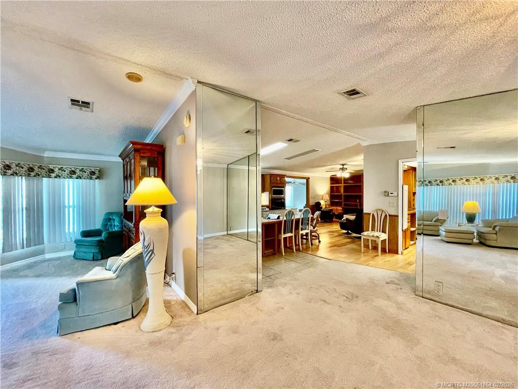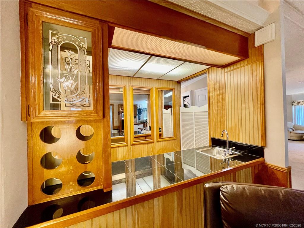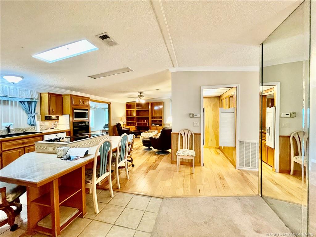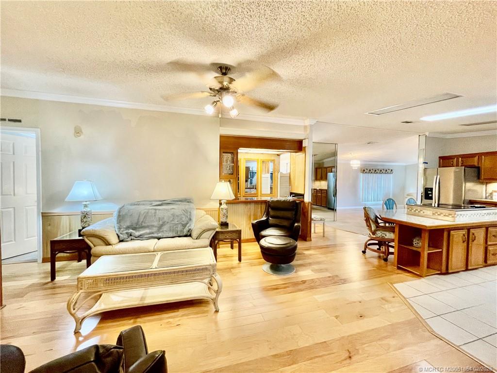 Invite your family & friends to this spacious 2030 sq ft home w/plenty of room for entertaining! Enjoy the wet bar and a premium location w/a natural wooded area & no rear neighbors. The home features a newer roof with a 3M membrane and a lifetime guarantee, hickory hardwood floors, and birch-paneled walls in the main living areas. Crown molding is present throughout. It includes formal living and dining rooms, a family room, great room, and a craft/office area with new windows and marble windowsills. The kitchen boasts a pantry, granite sink, skylights, an eat-in island with a cooktop, and a newer refrigerator. Main bedroom has a large walk-in closet, bathroom w/double sinks, a walk-in shower & makeup vanity. Nearby, enjoy a public golf course and a full-service restaurant with a bar and outdoor seating overlooking the lake & golf course. Pet friendly 55+ community. $1200 monthly land lease, $79. 70 passthrough fees & $75 for internet/TV. HOA requires 650+ credit. Partially furnished.
