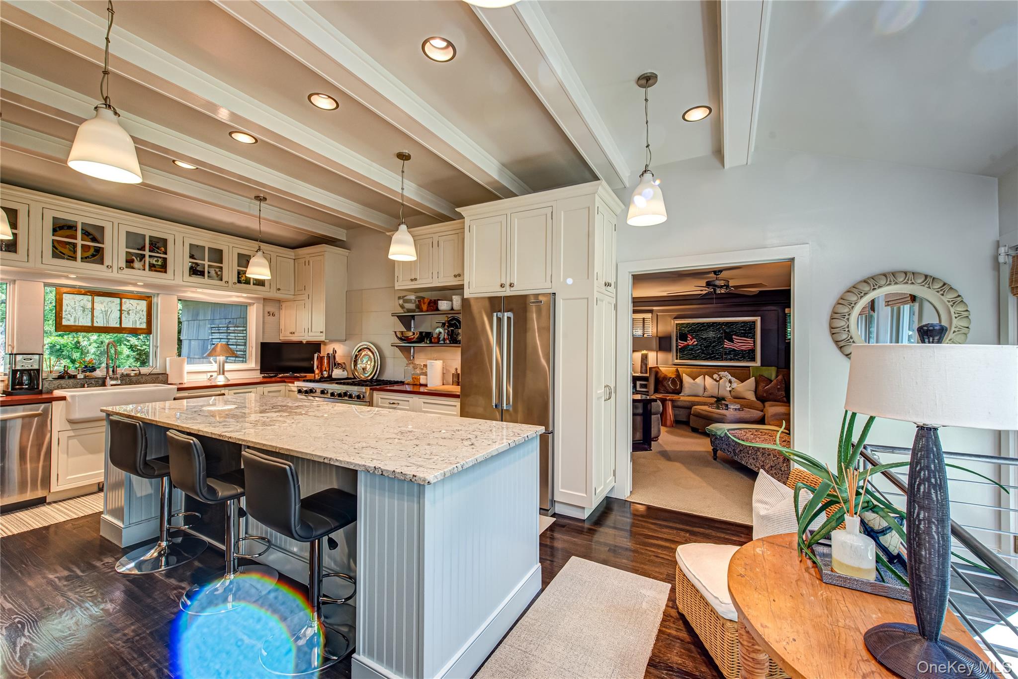 Southampton Gem with Designer Touches. Nestled in the heart of Southampton, this beautifully designed residence showcases timeless elegance and thoughtful details throughout. The interiors, styled by a professional designer, feature stunning coffered ceilings that add depth and character to the main living spaces. Currently offering 2 spacious bedroom suites and 3 full baths, the home can easily be converted back into 3 bedrooms to suit your needs. The 3rd bedroom was converted into an incredible walk in closet. A versatile bonus room provides endless possibilities—perfect for an art studio, woodworking space, home office, or gym. A bright four-season sunroom overlooks the meticulously landscaped grounds, creating the perfect spot to relax and enjoy the view year-round. Step outside to your private backyard retreat complete with a classic inground propane heated salt water pool, ideal for summer entertaining. This home blends sophistication with comfort, offering flexibility for both everyday living and weekend escapes.