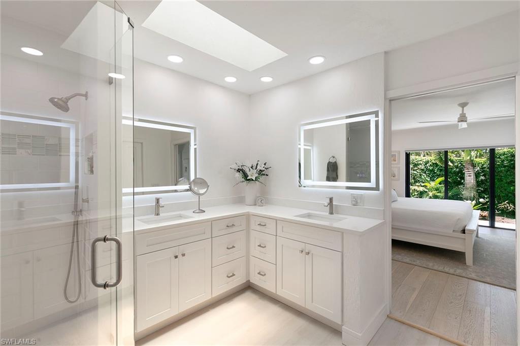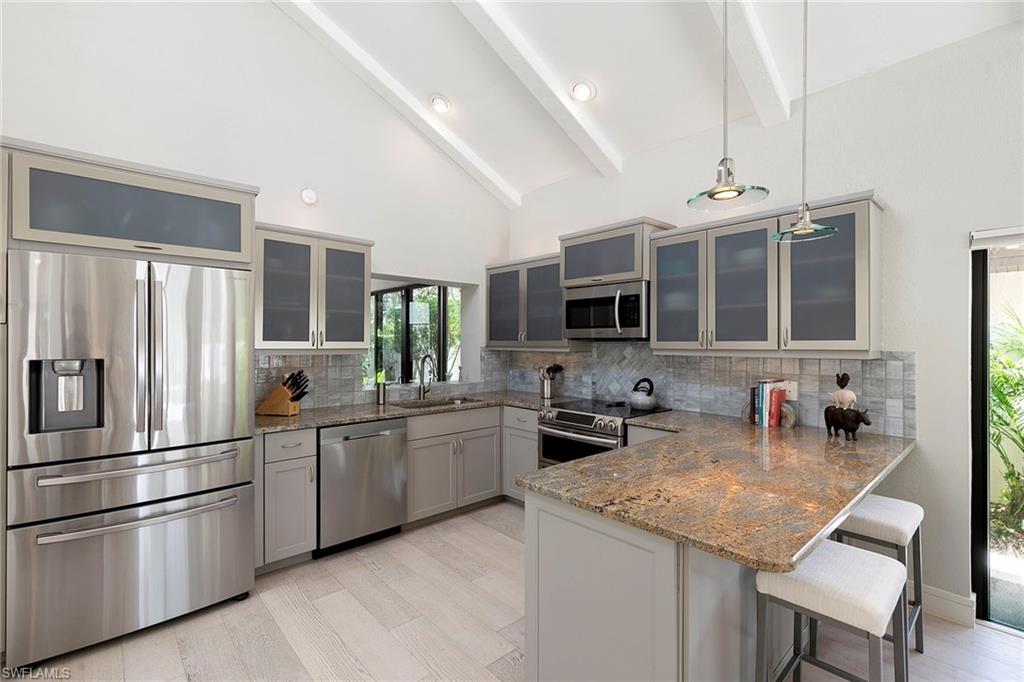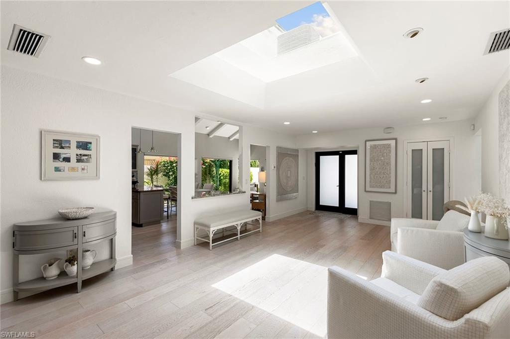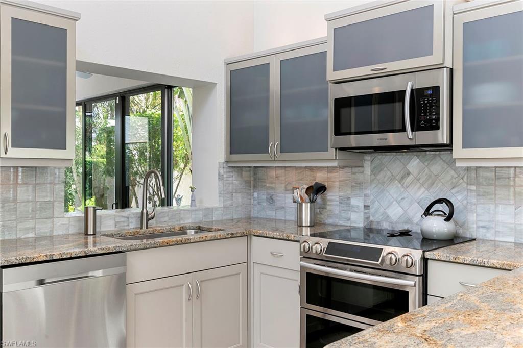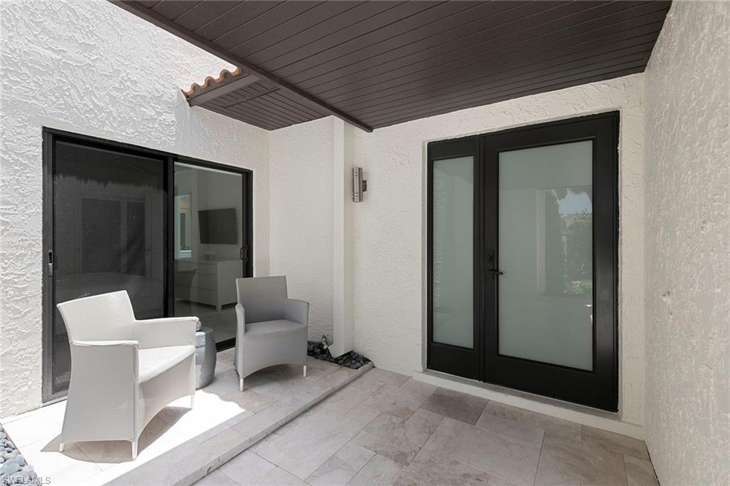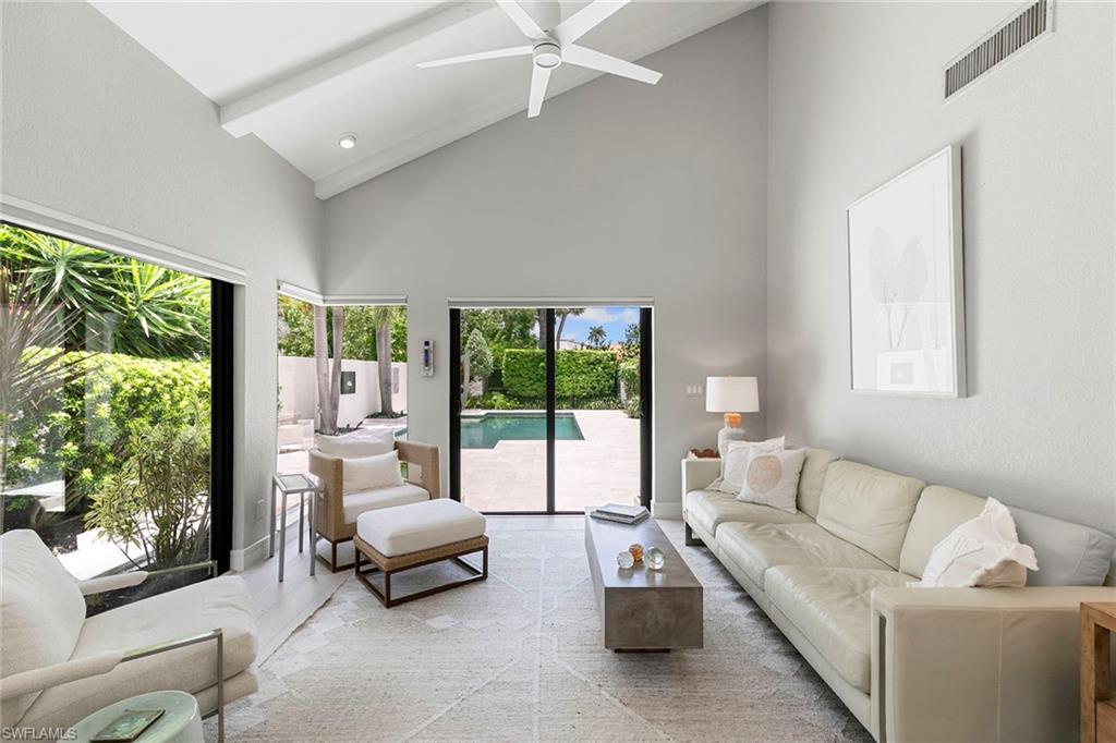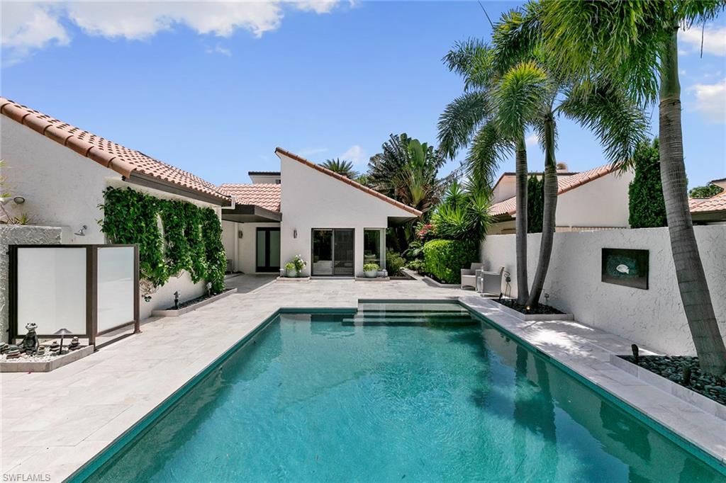 Welcome to Tierra Mar and a beautifully renovated villa in Pelican Bay offering an ideal balance of seclusion and convenience. This single-story residence is a private tropical retreat, with soaring ceilings, generous closets and walls of glass that frame tropical landscaping from nearly every room. The thoughtfully updated interior features a spacious living room, a modern kitchen, and a flexible second den/family room, ideal for guests to enjoy their own comfortable space to read or watch TV. Both baths have been recently renovated so there's not a project left to do in this villa. Go outside to your resort-style courtyard, complete with an enormous sparkling solar-heated pool and lush landscaping that is dramatically lit at night to create a tropical outdoor setting. Thoughtful additions are a home office and a screened-in back porch, ideal for morning coffee outside. An oversized two-car garage adds convenience, while the villa's south Pelican Bay location places you minutes from Artis-Naples, Waterside Shops and the beach. Pelican Bay residents enjoy private beachfront dining, tennis, a fitness center and miles of recreational paths. This is one of Naples desired outdoor and wellness-focused lifestyles, all in an X-500 flood zone.