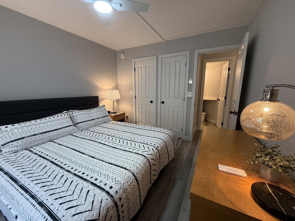 Completely renovated as of April 2025. Check out the virtual tour for a close-up look at the updates. This is an Upper Phase unit with lovely light filling the condominium. List of upgrades are in documents and photos. Just a few of the improvements are new windows in the living room, ceiling fans in all rooms, blackout blinds in bedrooms, total kitchen and bathroom upgrades, LVP flooring throughout and new doors. Peaseful and private setting with Clay Brook running outside your living room windows and off the deck. Privacy from neighbors too. There is Direct access to the winter shuttle to Sugarbush Resort, Lincoln Peak for great skiing and riding. Make this your new getaway. New upgrades to the complex are EV parking at the recreation center, new water pump house and fiber optic is actively at the property. Additional perks to ownership at the Bridges are the two outdoor heated pools, indoor year round heated pool, workout room, sauna, two outdoor hot tubs, playground, BBQ areas, outdoor Har-tru tennis courts as well as two indoor and during the winter, shuttle to the mountain that pick you up every 18 mins to the mountain. Pet friendly complex on 45 acres.
