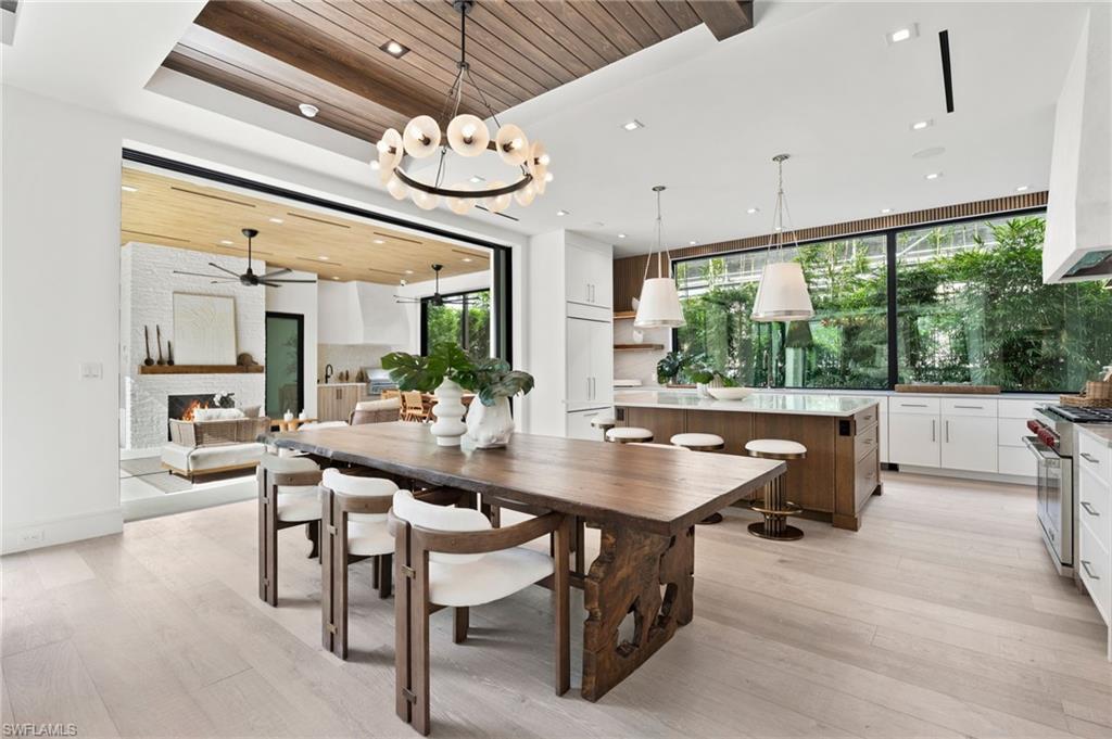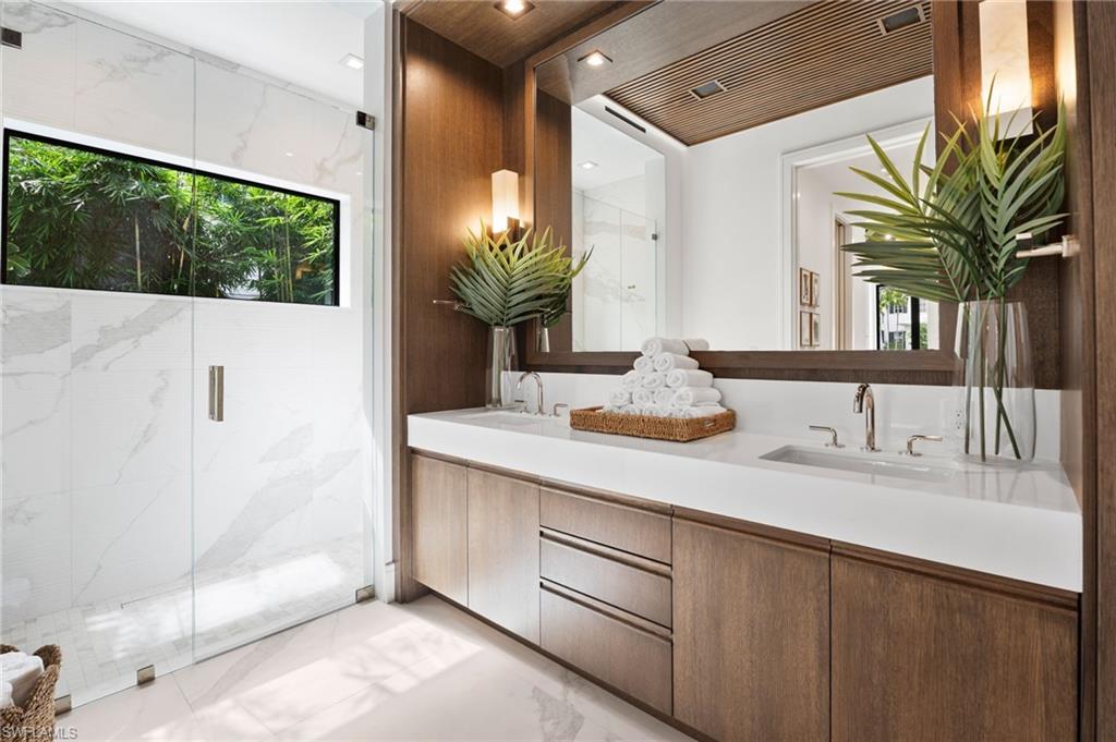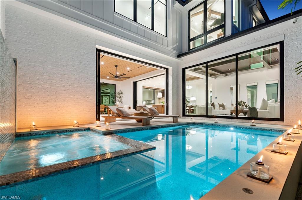 Just minutes from the world class shopping and dining on 3rd Street South & Fifth Avenue South, this brand new, never lived in residence embodies refined living in the heart of the highly sought after Olde Naples neighborhood. Blending natural textures with contemporary elegance, the home offers five bedrooms + study, light-filled interiors, and a seamless connection to the outdoors. Walls of sliders open the flexible outdoor living area & kitchen to the pool, creating a harmonious flow between inside and out. Unwind as the sun sets, a glass in hand, embraced by the privacy of your own retreat. At the heart of the gourmet kitchen, a dramatic Calacatta Lasa quartzite island anchors the space, complemented by custom SOHO cabinetry and Wolf appliances, while a striking counter to ceiling window bathes the room in natural light. Multiple stone and wood selections throughout create a warm yet modern atmosphere, while the open design makes everyday living and special occasions effortless. The main level wet bar with chilled wine storage is detailed with a romantic blue Quartzite setting the scene for evenings of gathering, while the upstairs morning bar invites guests to begin each day with ease and elegance. Additional details of note include a built-in generator, motorized screens, Control 4 automation, three car garage and quality of construction to last a lifetime. This Olde Naples gem is the perfect balance of luxury, comfort, and location—steps from the Gulf and curated for the ultimate Naples lifestyle.