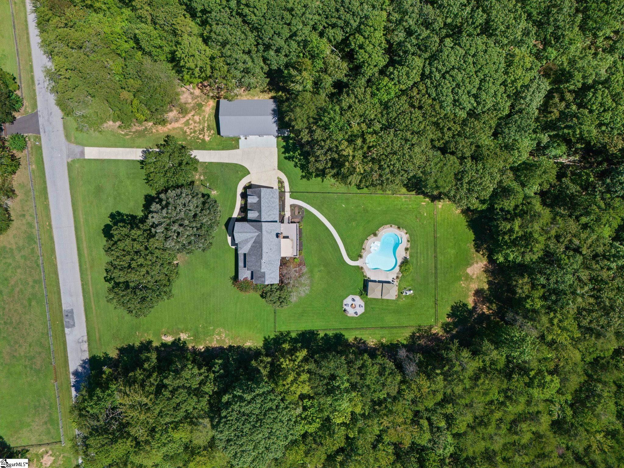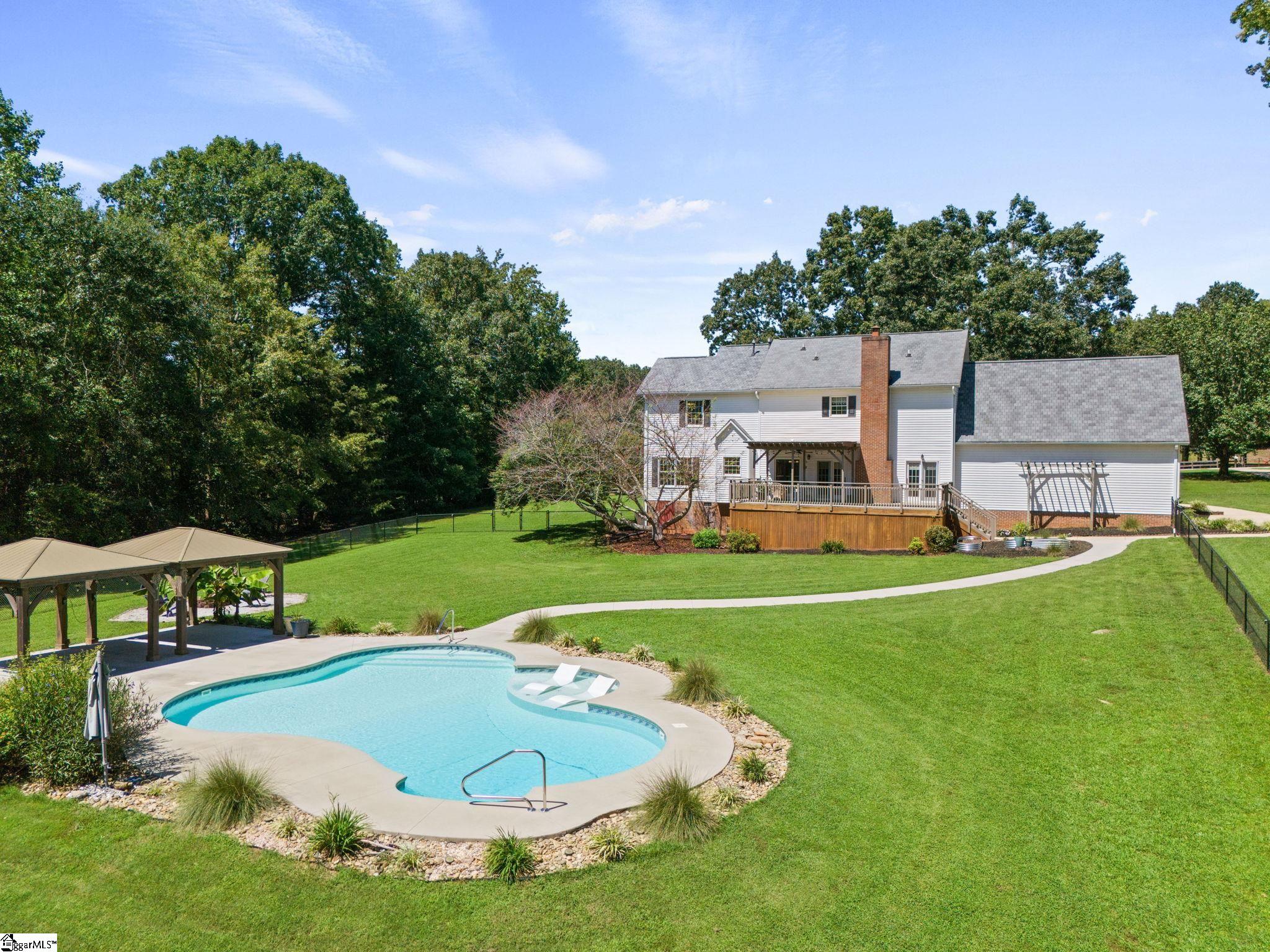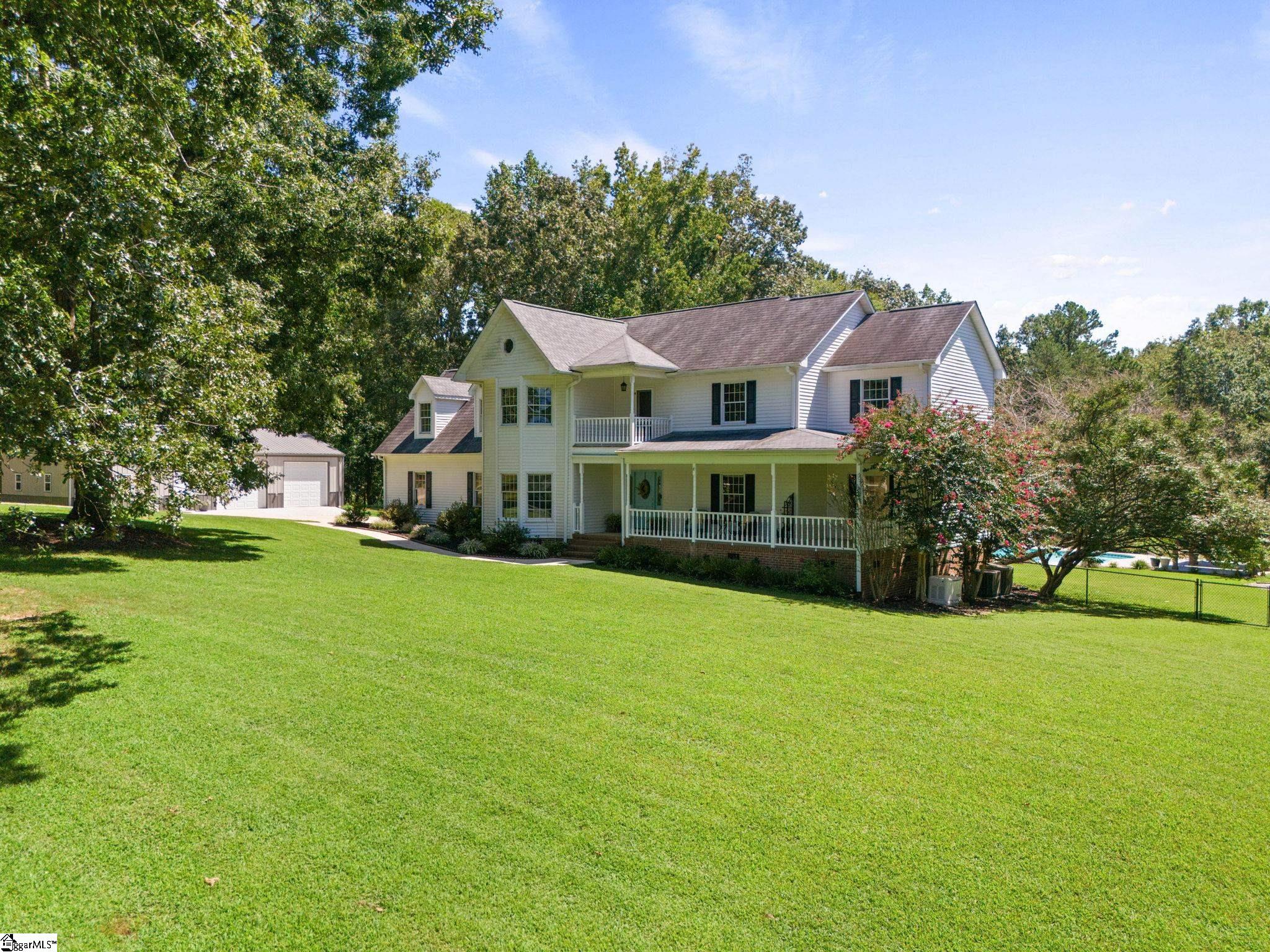 Do Not Miss this opportunity to own this Southern home nestled on an Approximately 5 ACRE lot and loaded with charming quality features. Escape the chaos and enjoy the serene privacy from the covered wrap around front porch. The traditional floor plan offers a foyer entry and a FormalLiving Room, . Dining Room is a nice size and features picture moldings and tons of natural light. Kitchen has been transformed into a modern oasis with a nice garden window, neutral paint, and beautiful white cabinets. Stainless appliances complete the space along with a pantry and breakfast area. Enjoy the open Great Room with gas logs, the perfect place to entertain and be part of all the action in the kitchen or on the deck. Office could also be used as a 4th bedroom with easy access to a full bath on the main level. Upstairs has the large master suite with an inviting SITTING AREA, full bath, and generous size walk in closet. Flex space / Bonus is located off the master with plenty of room and excess storage. Covered Balcony access near master is a great place to sit and take in all the gorgeous wildlife in the area. Two additional bedrooms, bathroom, and laundry closet complete the upstairs living space. THe attached two car garage is oversized with work bench and storage. The oversized garage will accommodate 2 large vehicles Outside is equally nice as the inside the large back deck features a covered PERGOLA and overlooks the gorgeous flat wooded, private back yard with inground Salt Water Resort style pool built in 2021 that is heated for swimming year around. Around the pool are 2 pergolas and fire pit area for the fall evenings. Featured also is the 30x50x10 Building built in 2021 with electricity that is fully insulated with 2 bay garage doors. Great for at home mechanical business or wood working shop. Never be without power as this home is equipped with whole house Generac Generator less than 3 years old. Water heater and upstairs HVAC replaced in 2021. Fairview Forest is an excellent community offering larger tract homesites for its homeowners. Horses are permitted. Just a short drive to all the conveniences of Simpsonville at Fairvew Rd, this is an excellent opportunity to MOVE RIGHT IN to your own quiet retreat.