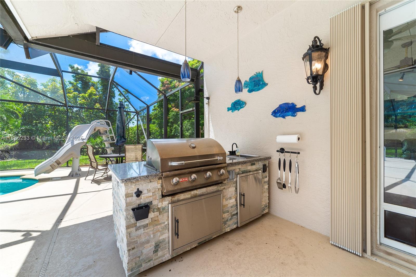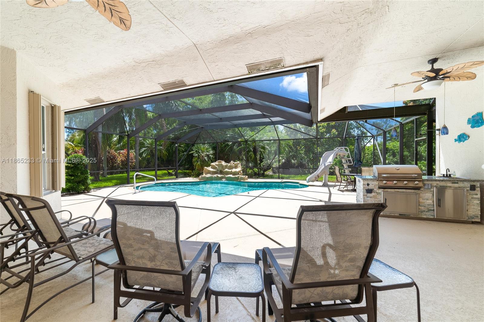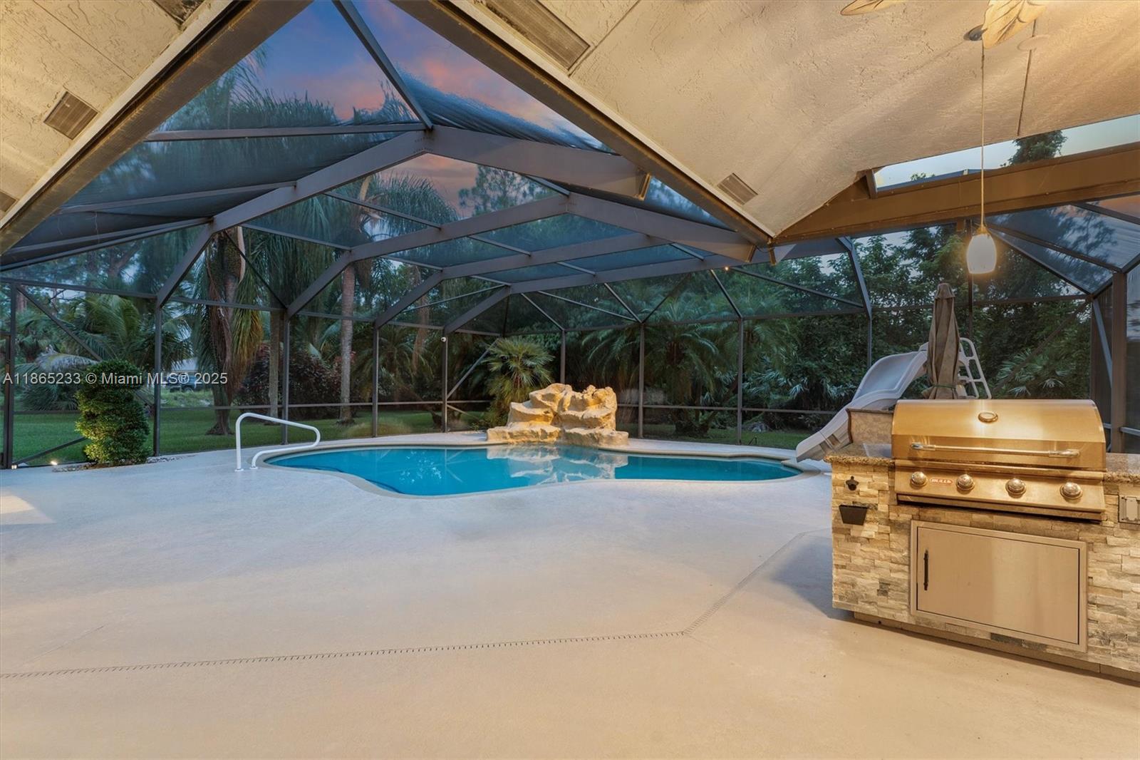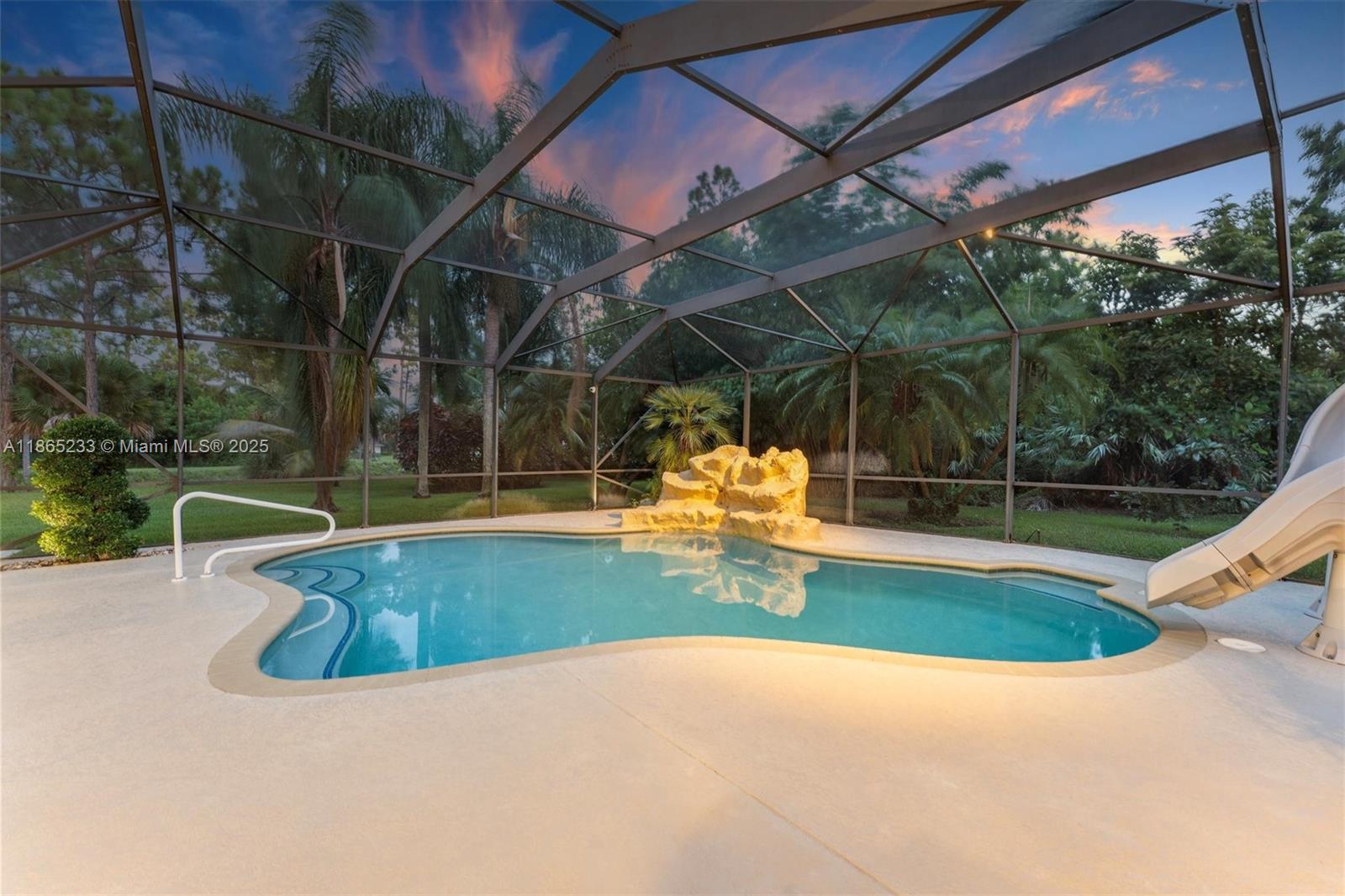 Your private sanctuary where luxury, space & natural beauty unite. This sprawling, split floor plan 3/3 plus Office sits on a serene 1. 4-acres. From the moment you enter the massive foyer, soaring 14–16 ft. ceilings, expansive windows & two-sided coral rock fireplace create a sense of grandeur. The home’s thoughtful design includes wet bar in the grand foyer, custom stained-glass accents, recessed lighting, dual zoned A/C, well & City water, & beautifully updated baths w/ granite & rich cabinetry. The gourmet kitchen offers beautiful granite countertops, soft-close cabinetry & brand-new cooktop—perfect for both everyday living & entertaining. Outdoors, the retreat continues with resort-style pool & spa with waterfall & slide, beautiful landscaping, fruit trees & fish in the joining stream.