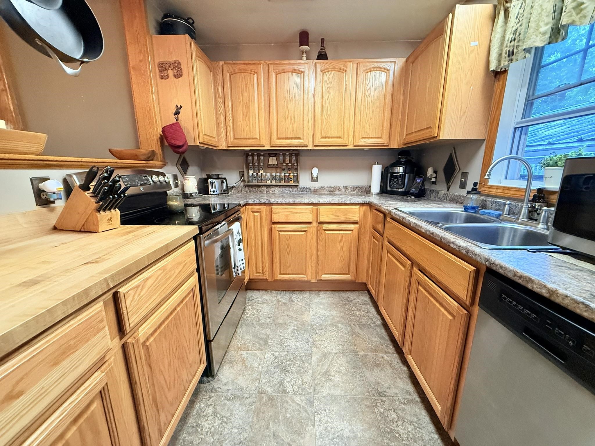 Discover a rare rural haven just minutes from the county’s largest city, delivering the perfect blend of modern convenience and private, tranquil living in New Hampshire. This property sits on just over a half-acre, featuring a welcoming deck and patio that invite outdoor relaxation and entertaining. The expansive grounds boast abundant garden spaces and multiple outbuildings, ideal for workshops, storage, or creative projects. Access the home via a walk-out basement to a spacious living room centered by a wood stove that radiates warmth throughout. The basement level also offers a bedroom, a practical utility room with a washer/dryer, and an additional fridge for convenience. Alternatively, enter through the carport into the main living level, where an updated kitchen shines with premium appliances, butcher block countertops, and striking oak cabinetry, complemented by a tasteful dining area with a stone accented chimney. Two more bedrooms and a well appointed walk in shower round out this lovely level of living space. This home combines functional space, generous storage, and a serene setting—an exceptional opportunity for comfortable, flexible living in a picturesque New England locale at an affordable price! Septic system, roof, hot water heater and driveway all replaced in the last few years! Conveniently located minutes to I-91, minutes to downtown Claremont, 30 minutes Dartmouth/Lebanon areas and only 20 miles to Mount and Lake Sunapee! Make this home yours, today!
