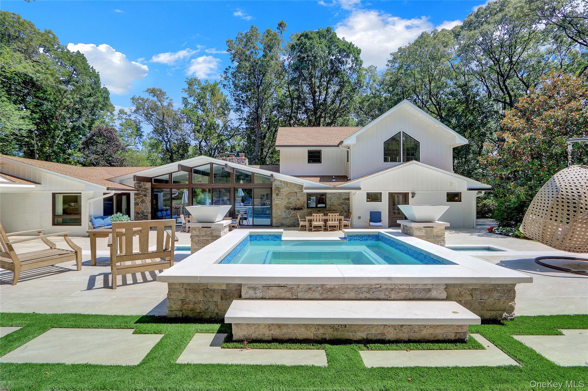 Welcome to Tree Tops—an expansive, newly renovated and expanded California-style luxury ranch set on three serene acres in the heart of Mill Neck. Spanning nearly 7, 000 square feet, this six-bedroom, six-and-a-half-bath turnkey residence was fully reimagined in 2024 to the highest standards of luxury living, blending refined design with every modern amenity. Inside, soaring ceilings and oversized picture windows flood the home with natural light, creating a seamless connection to the outdoors. The open floor plan flows effortlessly into spacious gathering spaces, including a sunken living room, a state-of-the-art chef’s kitchen, and a dramatic great room with vaulted, beamed ceilings, a stone fireplace, and a wall of glass overlooking the spectacular pool and grounds. Spa-inspired bathrooms and two separate primary suites provide indulgent comfort and flexibility for a variety of lifestyles. The fully finished lower level offers yet another dimension: a complete living area with its own kitchenette, lounge, bedrooms, one-and-a-half baths, private entrance, and dedicated parking. Perfect for multi-generational living, extended stays, or staff accommodations, this space offers independence without compromise. Outdoors, no detail has been spared in the extraordinary $1, 000, 000 pool and pavilion renovation. A heated gunite pool with electric cover, cascading spa, fountains, fire features, and a 3, 000-sf sandblasted Italian marble patio set the stage for unforgettable weekends. The covered outdoor chef’s kitchen—complete with bar, pizza oven, BBQ, refrigerator, and sink—makes entertaining effortless in every season. Additional highlights include radiant heat, all-new AC systems, a home theater, EV charging station, advanced security system, professional landscaping and dual driveways for both convenience and grandeur. Tree Tops is a rare Mill Neck offering—crafted for those seeking a year-round sanctuary, a weekend retreat, or a residence designed to adapt gracefully to every stage of life.