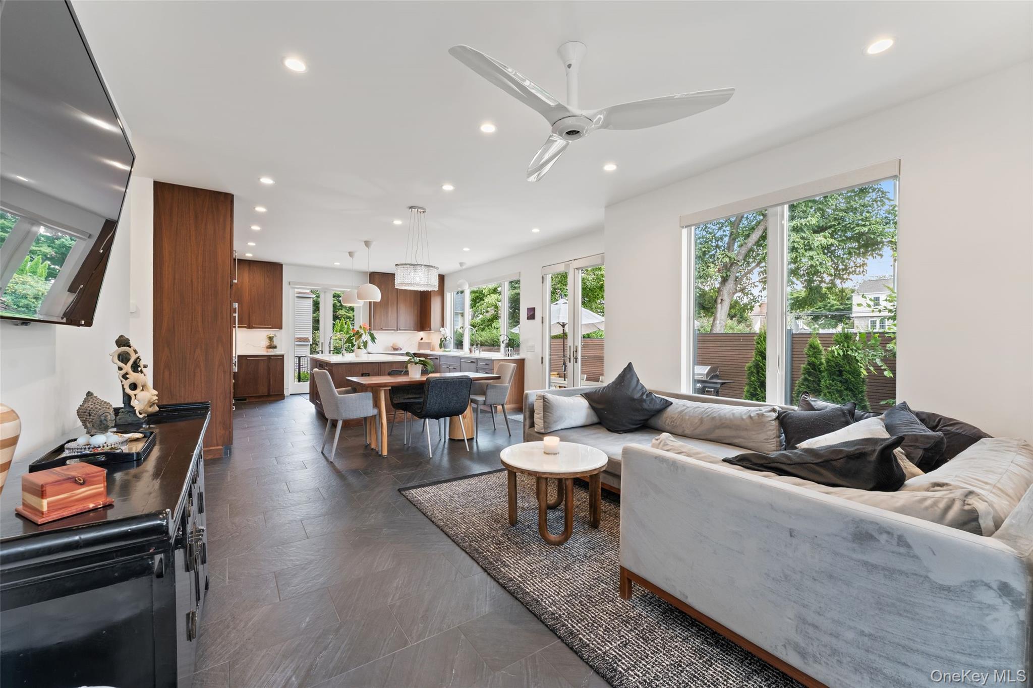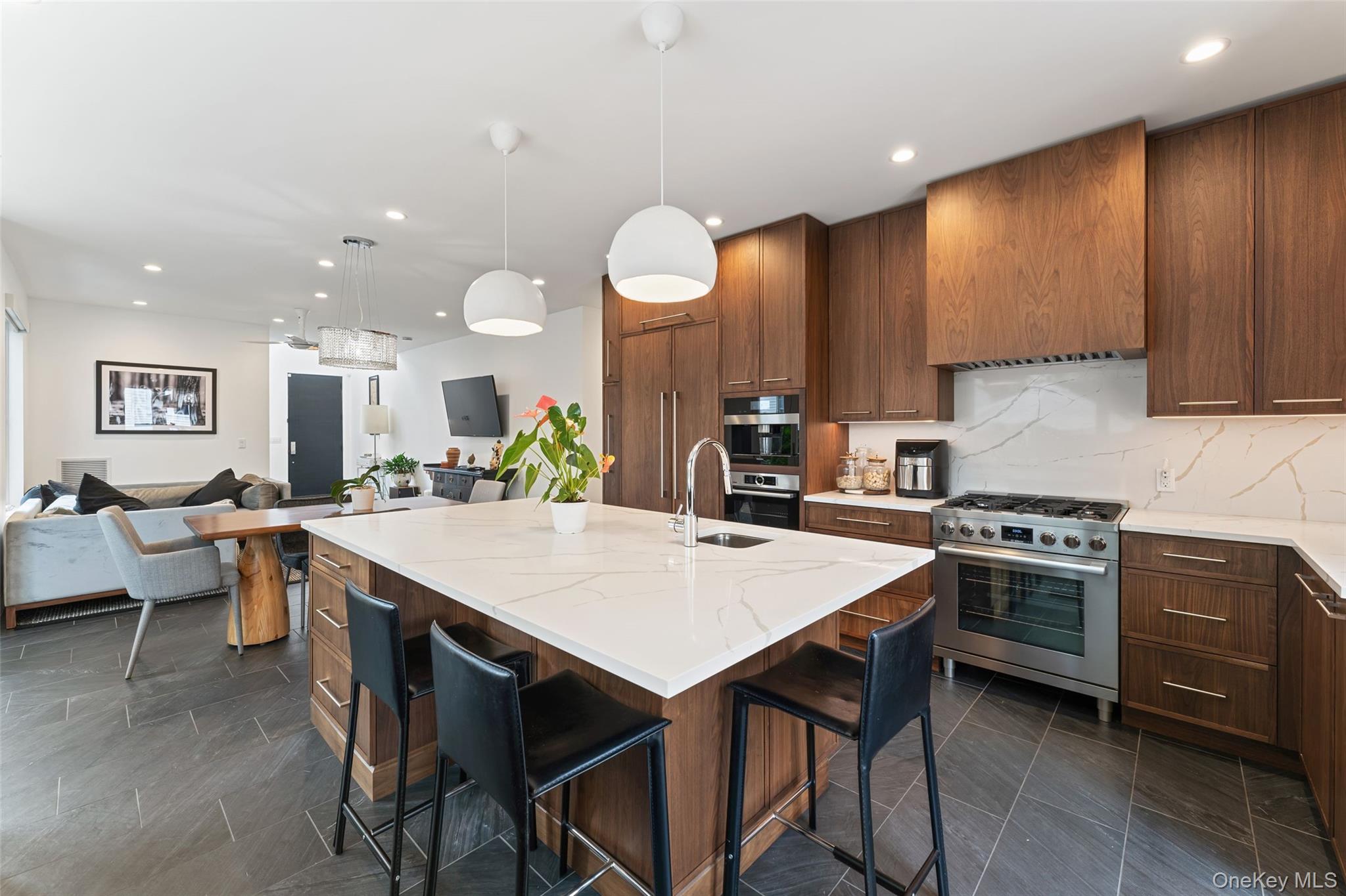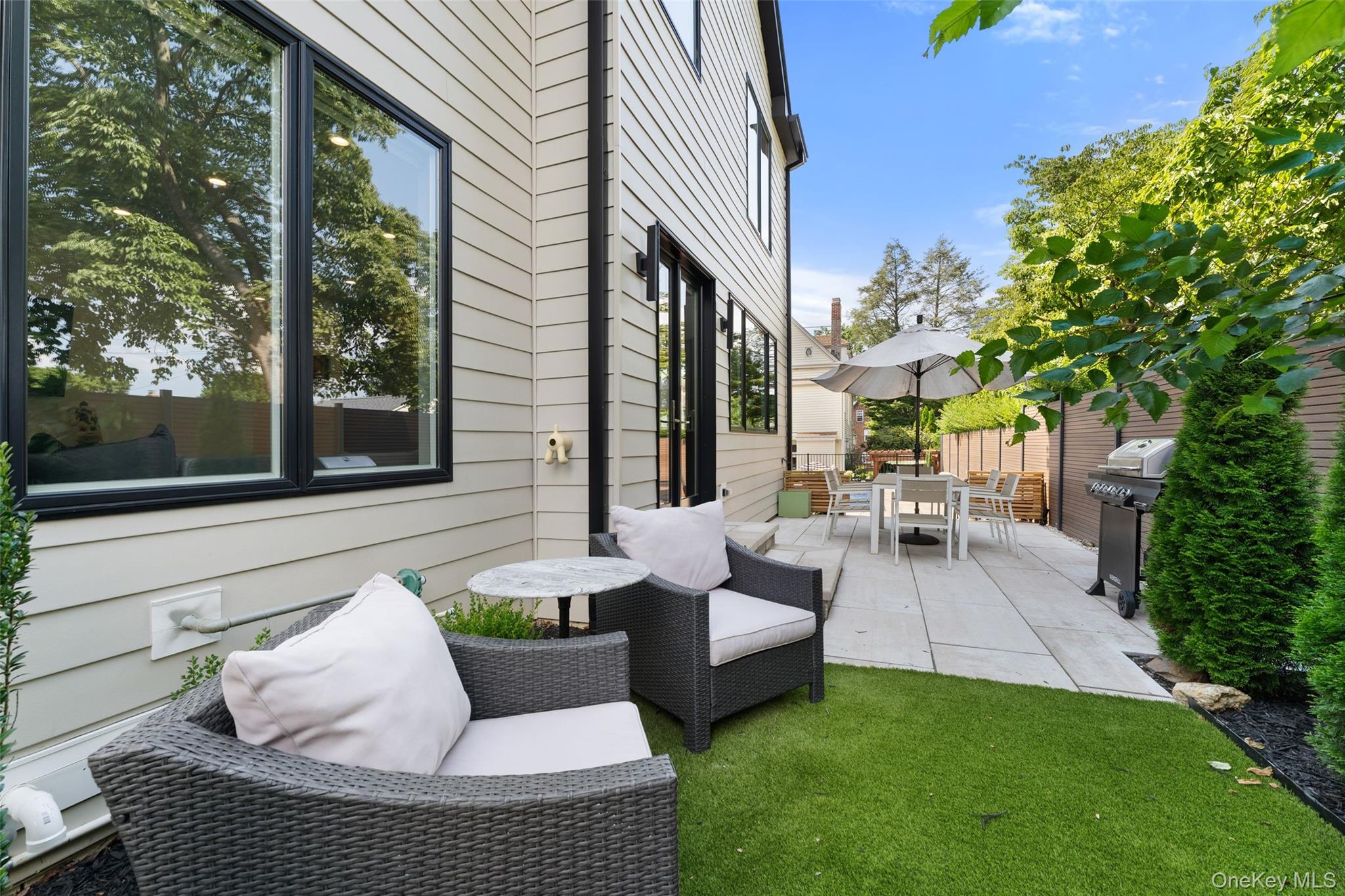 A rare opportunity to own a brand-new California-modern masterpiece in Bronxville PO. Completed in 2024, 11 Castle Street combines striking architecture, luxury finishes, and a seamless indoor-outdoor flow—just moments from the Metro North and the heart of Bronxville Village. The home’s clean lines and warm materials create an inviting yet modern aesthetic, crafted with no-maintenance NewTech siding and fencing, Andersen 400 windows, Hardie Board siding, and a designer Thermatru front door. From the radiant heated floors on every level to the state-of-the-art Ring alarm system and Alexa-enabled multi-zone HVAC, every detail has been thoughtfully considered. Inside, the main level offers an expansive open-concept design anchored by a chef’s kitchen with custom walnut Crystal cabinetry, Thermador fridge/freezer columns, Bosch appliances, Miele coffee system, quartz countertops, and custom pendant lighting. A flexible guest/office suite and full bath with zero-entry shower complete this floor. The second level is highlighted by a dream primary suite—spa bath with freestanding BAIN tub, glass shower, dual vanities, private water closet with bidet, custom closets, and access to a terrace. Two additional bedrooms (one with private balcony), a full bath, and a stylish laundry room with butcher block counters and utility sink make the upstairs as functional as it is beautiful. The lower level provides a playroom, gym space, custom closets, and full bath with dog wash, plus radiant heated concrete floors for year-round comfort. Step outside and discover your private resort: a Latham saltwater fiberglass pool ($100K investment) with Pentair heater, Cambridge paver patios and bluestone steps, automated pool robot, and multiple decks and sitting areas. A turf lawn, sprinkler system, and architectural outdoor lighting ensure the grounds are as easy to maintain as they are stunning. Additional highlights include a radiant heated garage with WiFi-enabled custom door, an electric charging station, seamless black gutters with guards, a 5, 000-gallon buried propane tank (owned, not leased), flush-mounted modern mailbox with house numbers, an imported Hartley Tissier stair runner, and custom window treatments throughout. This home is an architectural standout offering luxury, efficiency, and lifestyle in one extraordinary package.