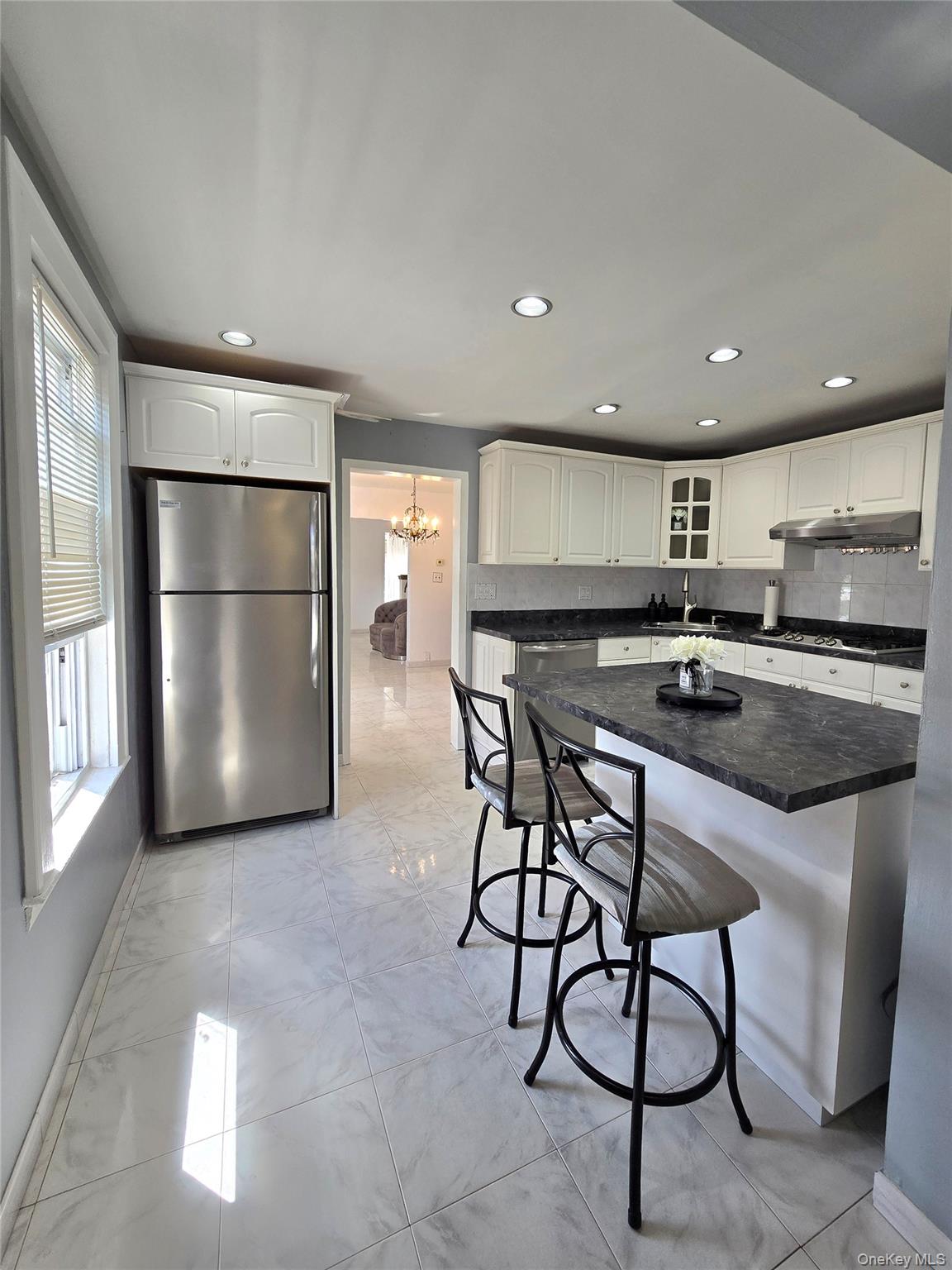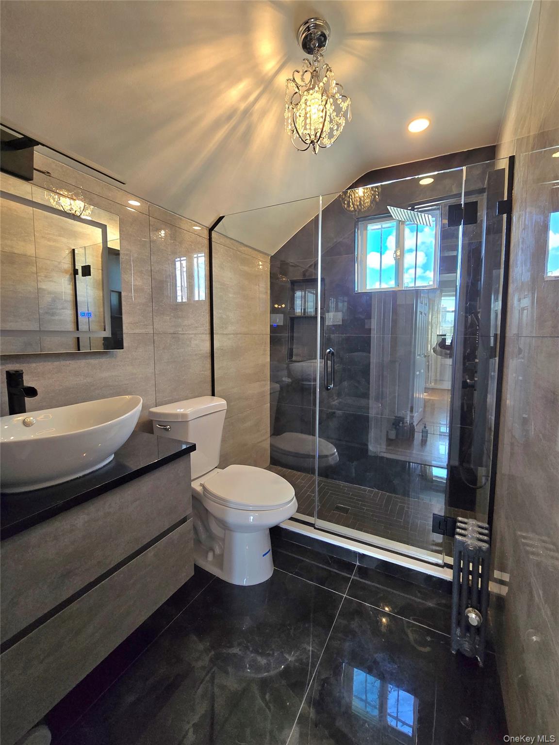 Welcome to this beautifully updated three-bedroom, two-bathroom home, thoughtfully designed for comfort and versatility. The main level offers a sunlit living and dining rooms with sleek tile flooring and an elegant crystal chandelier- the perfect setting for gatherings. The modern kitchen shines with crisp white cabinetry, granite-style countertops, stainless steel appliances, and an impressive double pantry. Upstairs, the bedrooms are bright and airy, complemented by a fully renovated spa-like bathroom with a frameless glass shower, rainfall shower head, designer vanity, and a state-of-the-art smart mirror. The semi-finished lower level, complete with a second full bath, provides flexible space for guests, recreation, or additional living. Outdoor living is enhanced by a gated yard with custom stonework, ideal for entertaining, along with a detached garage for parking or a workshop. Additional upgrades include a seven-year-old roof with solar panels, keeping energy costs minimal. Truly move-in ready, this home balances modern luxury with everyday practicality.