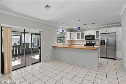 Enjoy an inviting front screened enclosure leading into a spacious open-concept living and dining area — ideal for entertaining. Sliders open to the private screened lanai, seamlessly blending indoor and outdoor living. The kitchen features solid wood countertops, ample cabinetry, a large pantry, and a sunlit window over the sink for natural light.