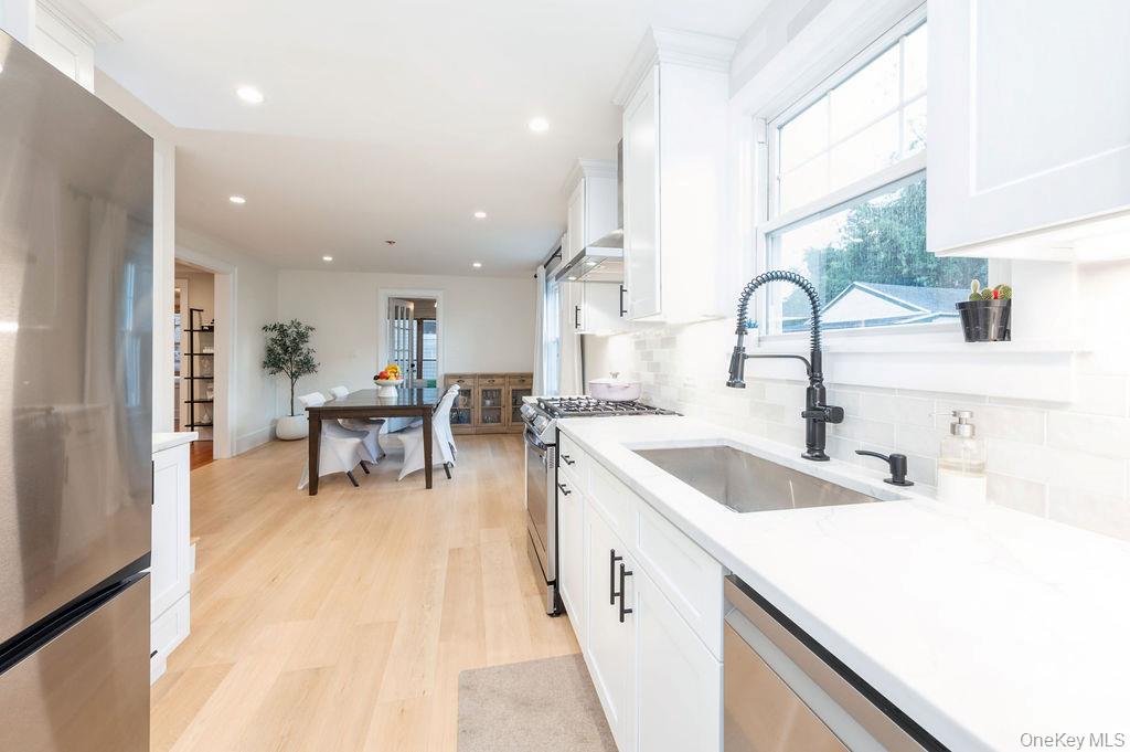 Welcome to this beautifully updated Tudor style home in the heart of White Plains, where timeless elegance meets modern convenience. This 3-bedroom, 1 bath residence features a brand-new kitchen with stainless steel appliances, new hardwood floors, and energy-efficient LED lighting throughout. The cozy living room with fireplace flows into a spacious dining area, while the bright sun porch makes the perfect home office, reading nook, or playroom. Upstairs, you’ll find three generously sized bedrooms and a fully renovated bathroom with a new shower and marble shower floors. Comfort is effortless year-round with dual-zone heating and cooling—one system dedicated to the upstairs and another to the downstairs. The basement offers exciting potential to create a family TV room, game room, or home gym, adding even more flexible living space. Major system updates include conversion from oil to natural gas, new tankless water heater (2021), a 200 AMP electrical panel (2020), and no boiler for easy maintenance. Outdoors, the private backyard is perfect for barbecues and gatherings, while the long driveway and garage provide ample parking. Ideally located just minutes from the Metro-North train station—with a quick 36-minute ride to Grand Central Terminal as well as close to major highways, shops, and restaurants, this move-in-ready home blends timeless Tudor style with thoughtful upgrades, offering both elegance and warmth in every season.