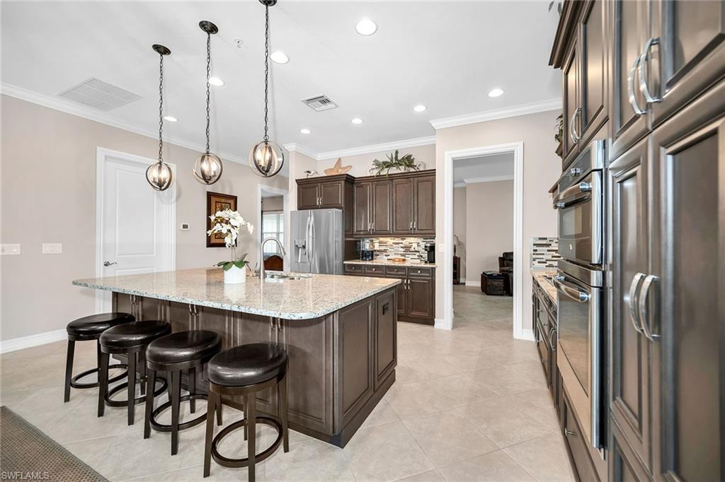 Meticulously maintained and beautifully appointed, this end-unit second-floor coach home offers tranquil water and preserve views with western exposure, providing a private and serene setting in the highly sought-after Tasori at Lely Resort. Designed with comfort and elegance in mind, the spacious floor plan includes three bedrooms plus a den, three-and-a-half baths, and a two-car garage, with the convenience of a private elevator and impact-rated doors and windows throughout. The open-concept living areas are enhanced by soaring 10-foot ceilings, crown molding, and diagonal tile flooring in the main spaces. A chef’s kitchen serves as the heart of the home, showcasing shaker-style cabinetry with under-cabinet lighting, a mosaic tile backsplash, granite countertops, and a center island with bar seating and pendant lighting. Stainless steel appliances include a cooktop with paneled hood, built-in microwave, wall oven, dishwasher, and a French door refrigerator/freezer. A formal dining area flows seamlessly into the living room, where sliding doors lead out to the screened lanai and its captivating lake and fountain views. The owner’s suite is a private retreat with lanai access, peaceful lake views, and two walk-in closets with custom wood shelving. Its luxurious bath features dual granite vanities with a full-width mirror, a free-standing soaking tub, and a frameless walk-in shower tiled floor to ceiling. Both guest bedrooms offer en-suite baths with walk-in showers, while one enjoys a double-door entry and garden views. A powder bath off the hallway provides added convenience. The den, with double doors, plantation shutters, and crown molding, is ideal for a home office or media room, while the laundry room offers abundant storage with built-in cabinetry, granite countertops, a utility sink, and washer and dryer. The Tasori neighborhood provides its own clubhouse, resort-style pool, hot tub, and fitness area, while Lely Resort elevates the lifestyle with access to three championship golf courses and the award-winning Players Club & Spa. Membership offers a world-class experience with tennis, pickleball, bocce, a state-of-the-art fitness center, spa services, multiple pools, tiki bar and grill, fine dining, and a full calendar of social events. This residence perfectly combines luxury living with a vibrant resort lifestyle, just moments from the best of Naples.