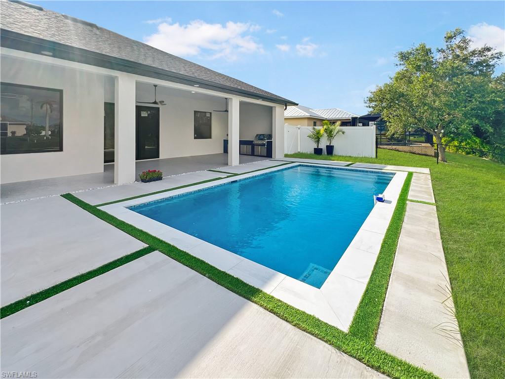 Introducing this brand-new construction in Cape Coral! This stunning home offers 1, 939 sq ft of living space and 3, 096 total sq ft. It features 4 spacious bedrooms, 3 full bathrooms, a 3-car covered garage, and sits on a canal with a beautiful pool—perfect for Florida living. The open-concept layout highlights high ceilings, elegant finishes, and a modern kitchen with quartz countertops and stainless steel appliances. Enjoy indoor-outdoor living with sliding glass doors leading to a covered patio and pool deck. Seller is offering $10, 000 toward closing costs, making this an even greater opportunity. Located in a quiet, well-connected neighborhood close to schools, shopping, and main roads. Move-in ready and built to impress!